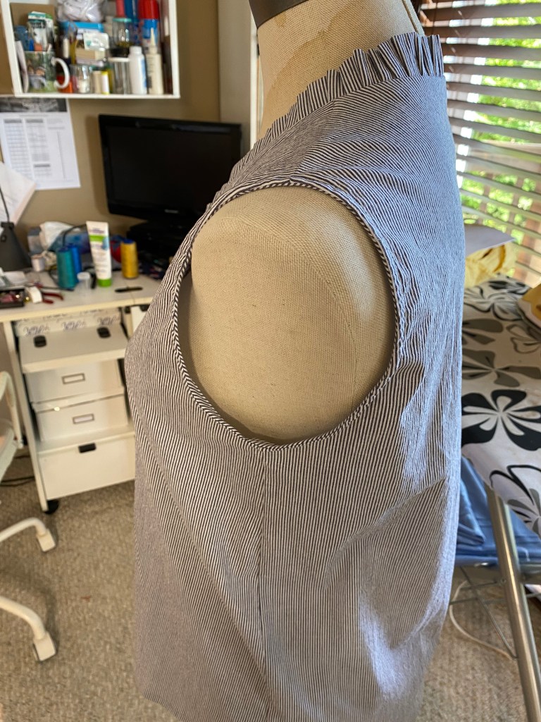 Tissus : Seersucker légèrement extensible en coton avec l’élasthane (4%) intégré dans le tissage et sortie de ma réserve. (Ce qui veut dire, je ne me souvient pas dutout de où… 🤦🏼♀️)