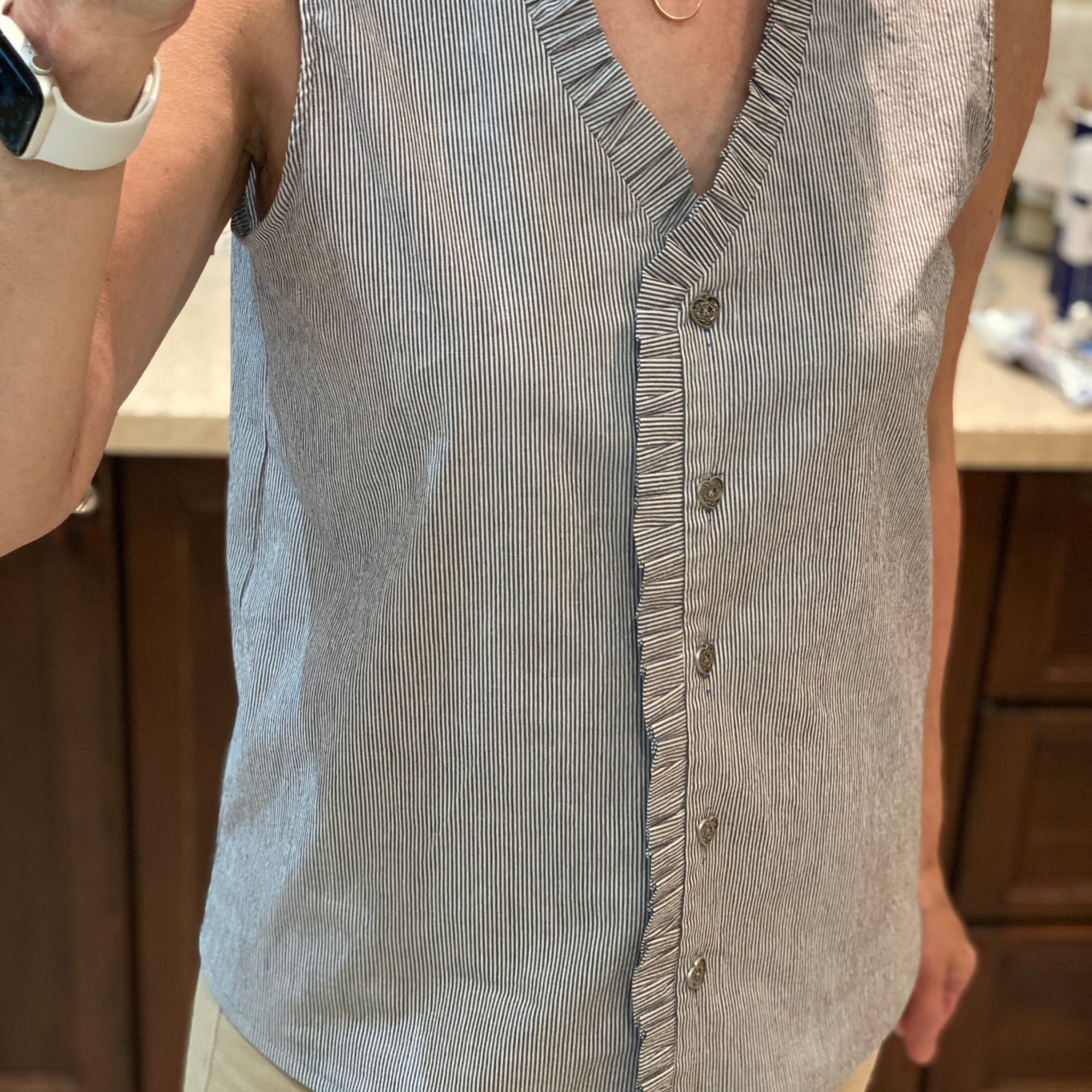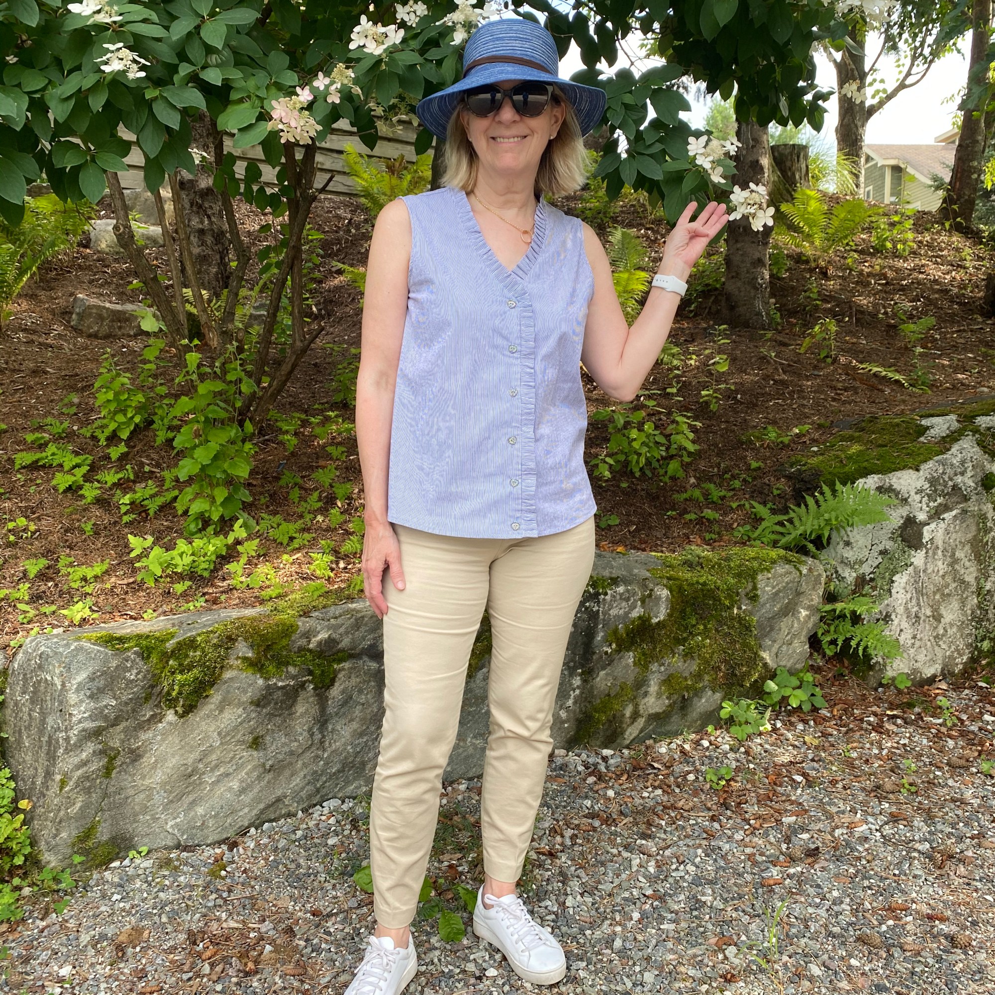 Nellie est un modèle sans manche, sans pince et un peu ample dans le bas. Son atout est un joli col en V bordé d’un volant tout bien plissé, tout propre, qui lui donne l’impression d’une blouse impeccable même après une journée portée. Point non négligeable pour pratiquer mon métier l’été où je suis pratiquement toujours à l’extérieure avec des clients, c’est donc juste assez habillé et distingué pour une blouse pas de manche.