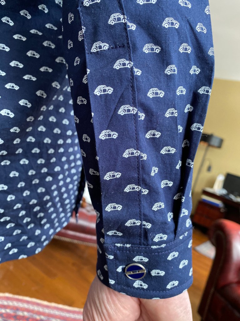 Celle-ci fut faite en une journĂ©e et c’Ă©tait parfait pour une chemise d’Ă©tĂ© bien cool pour mon Grand NĂ©gligĂ©! đ Il avait choisi le tissu lui-mĂȘme au Club Tissus de Laval et super bon choix car il contient du Lycra donc un peu extensible pour plus de confort. Pour aller avec ce design trop cool de vieux microsillon, j’ai trouvĂ© des boutons Vintages chez la reine des boutons Ă MontrĂ©al, la boutique Rix Rax au 801 rue Gilford, Ă MontrĂ©al http://www.rixrax.ca. Ils mâont coutĂ© un bras de chemise mais en fait 10 fois au moins le prix du tissu! Mais sont tellement beaux! Et lourd⊠pas du tok ça madame, ils sont magnifiques et ressemblent au piton quâon mettait au centre pour tenir les 45 tours sur notre tourne-disque! Ah Nostalgie quand tu nous tiens! Le patron est aussi une nouveautĂ© pour moi, tirĂ© du livre Couture Casual Wear pour homme de la Française Christelle Beneytout, il est formidable et tout les basiques pour homme y est et je nâai entendu que des Ă©loges sur ces coupes et le fit qui est topissimes comme ils disent nos cousines dâoutre-mer! Par contre, je nâai pas suivi toutes ses instructions car je prĂ©fĂšre encore la mĂ©thode dâOlivier (Participant Ă l’Ă©mission Cousu Main en France) co-crĂ©ateurs des patrons les BG et son super tutoriel pour faire une chemise.