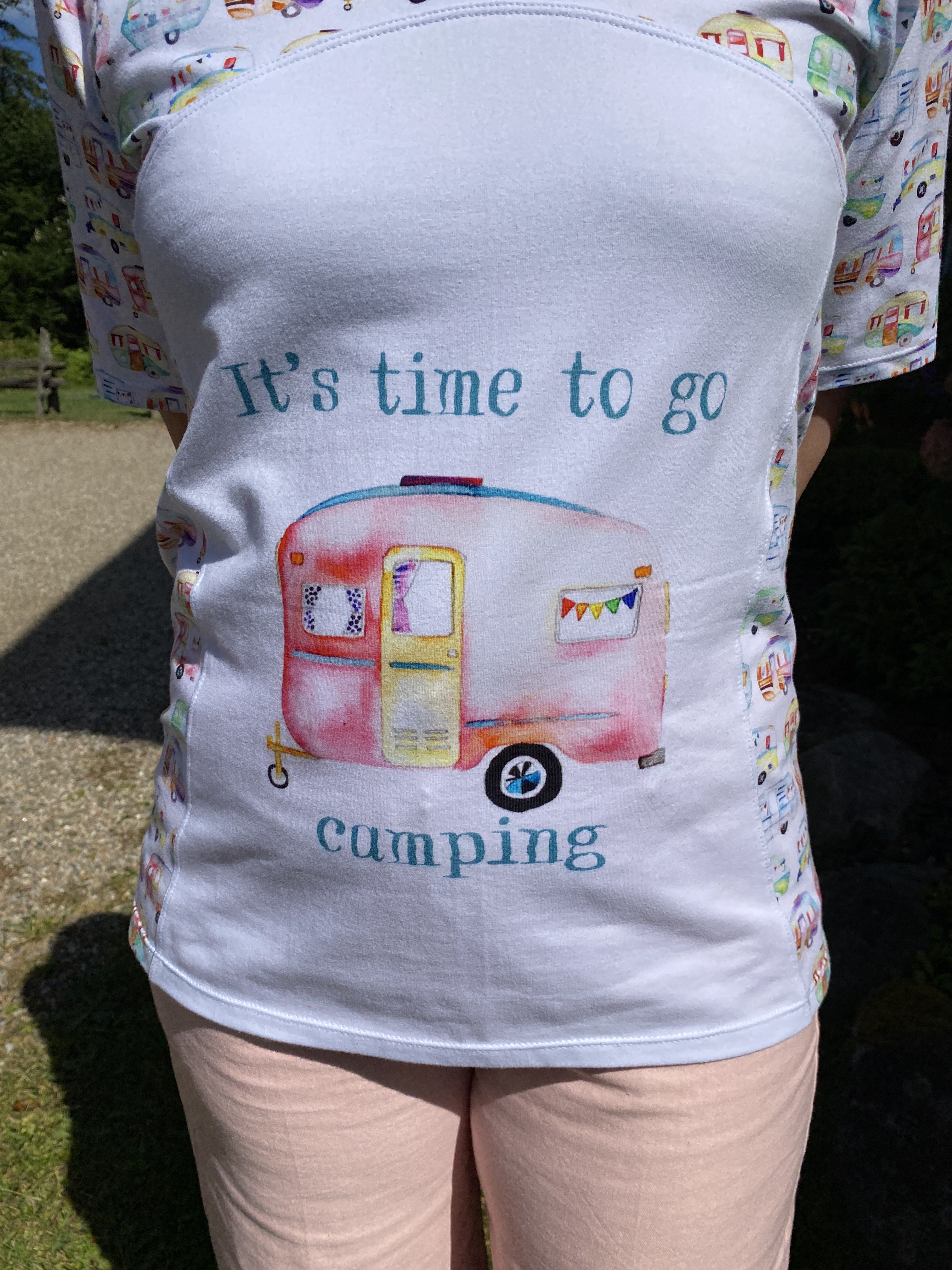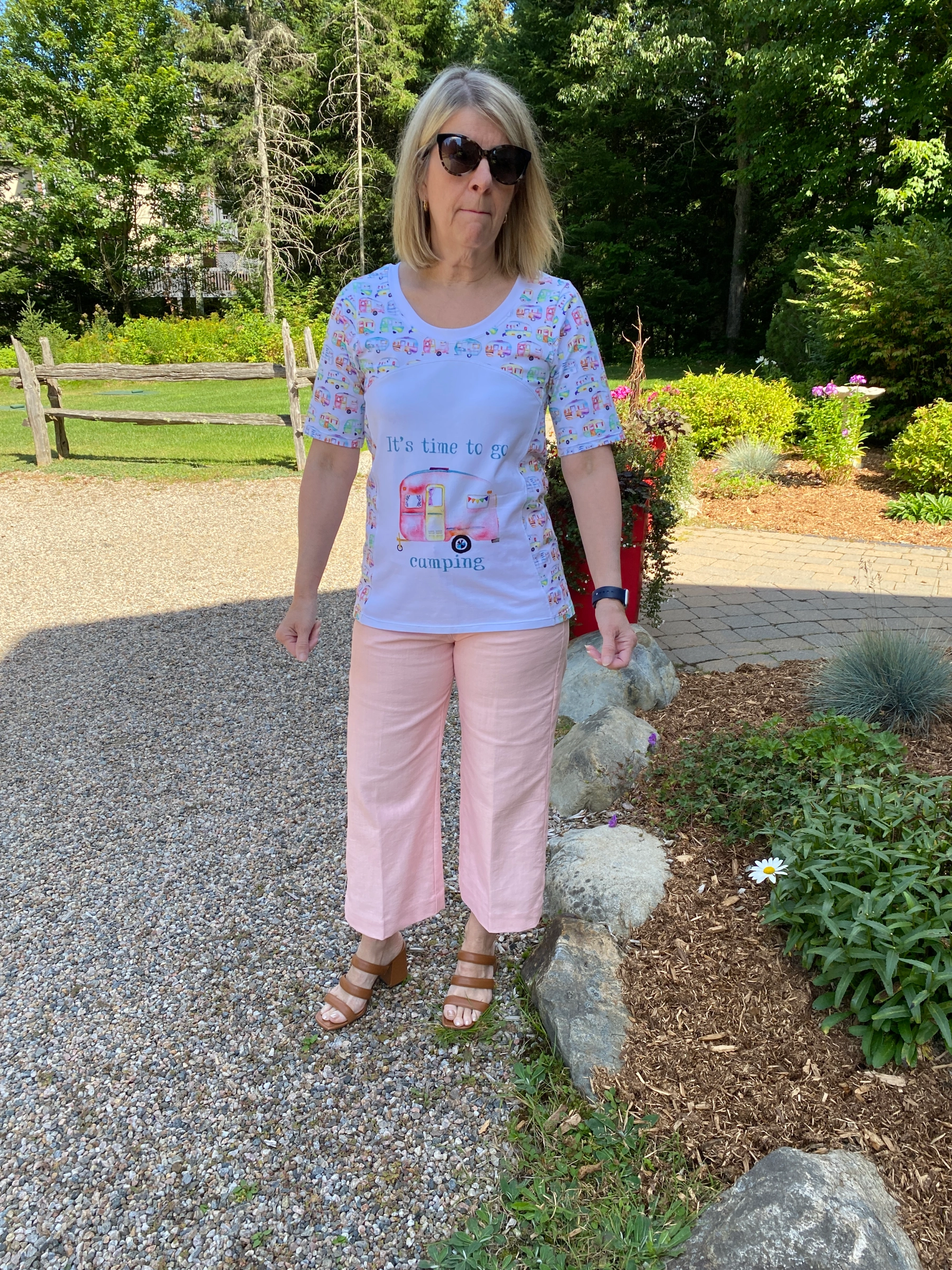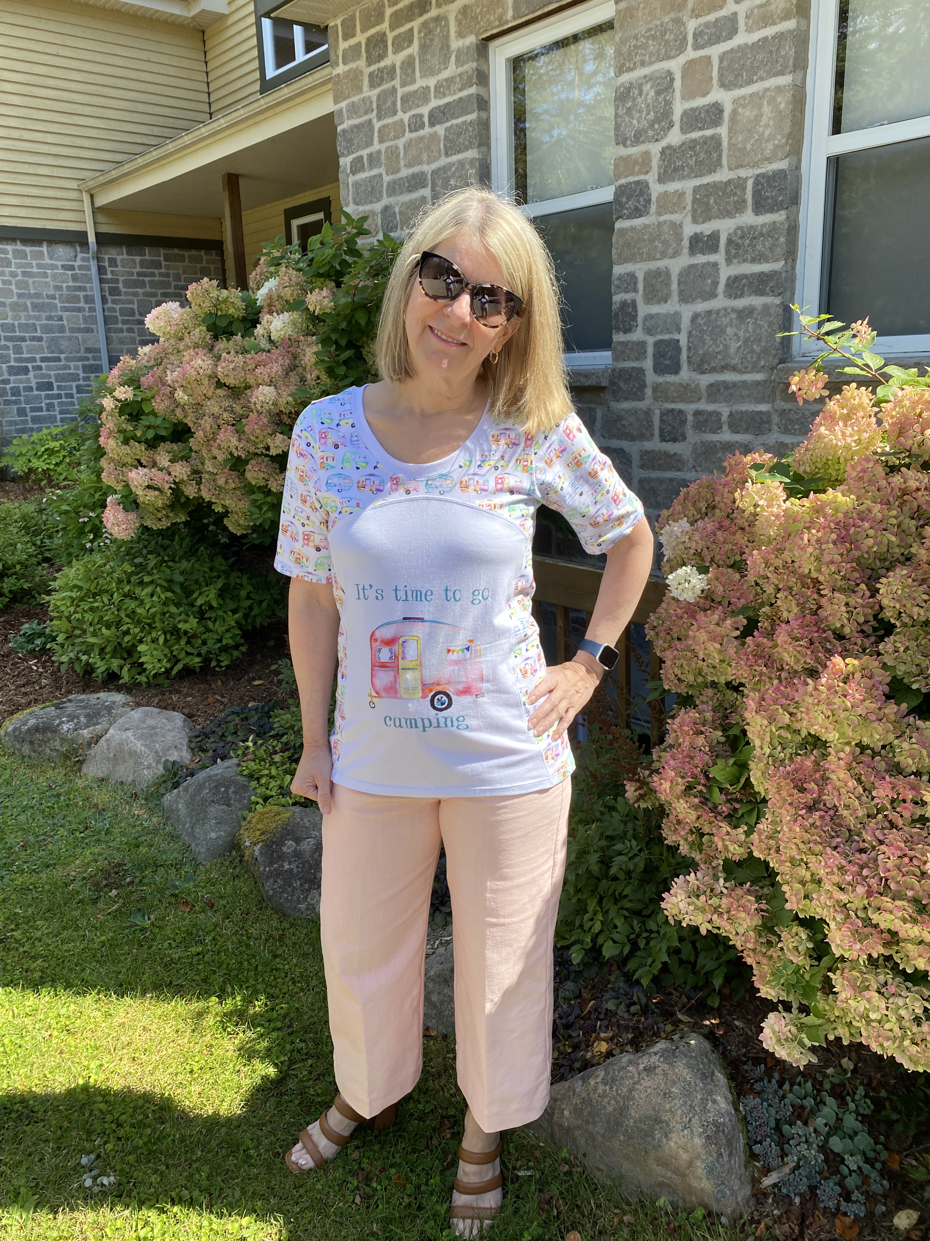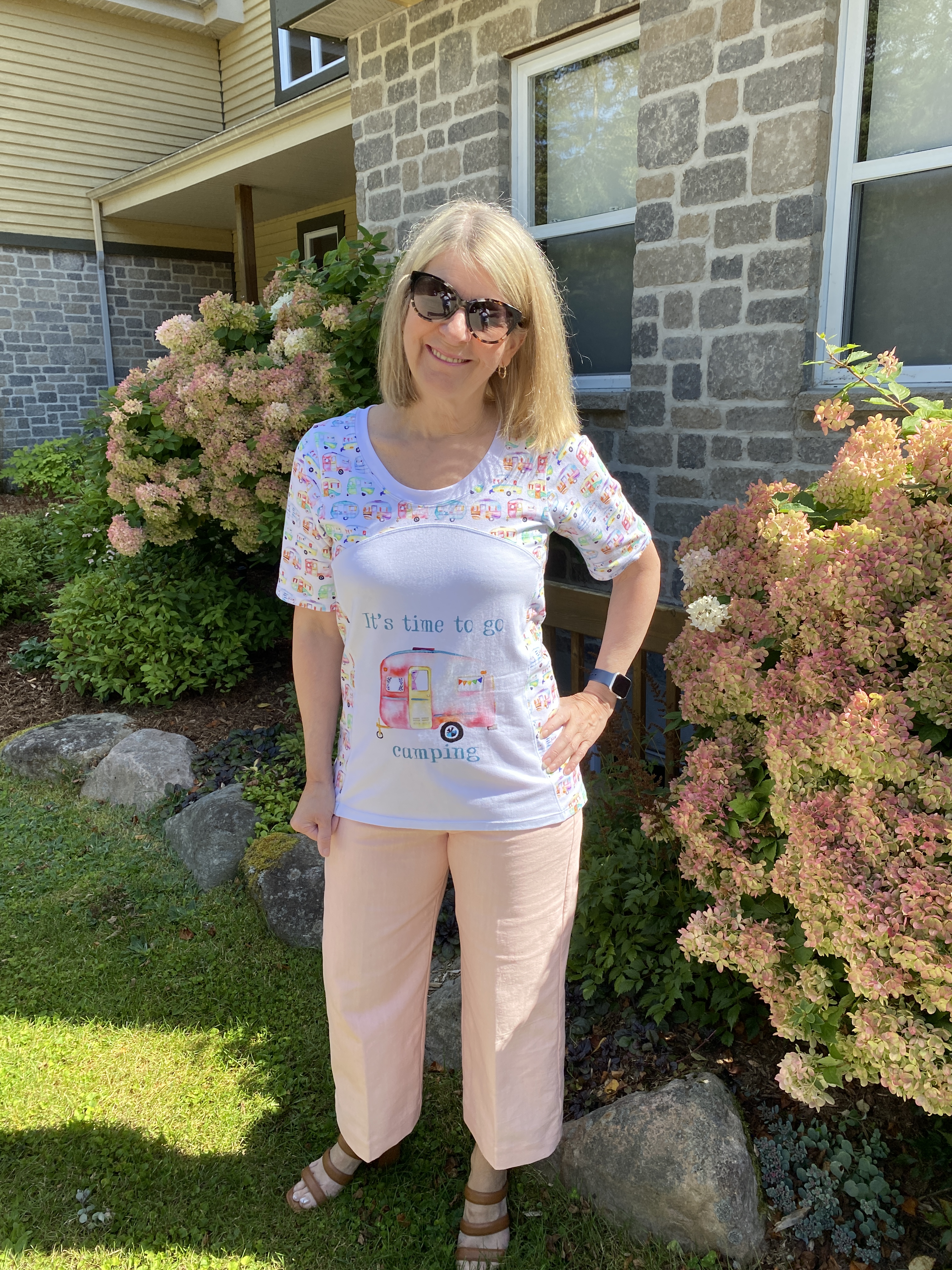 Women’s Pretty Panel Tee, A Sparkling Baby avec un panneau rigolo et son tissu assorti acheté dans mon groupe de revente sur FaceBook. (Pas de lien car la créatrice de ce patron semble avoir fermé boutique! Désolée 😕)