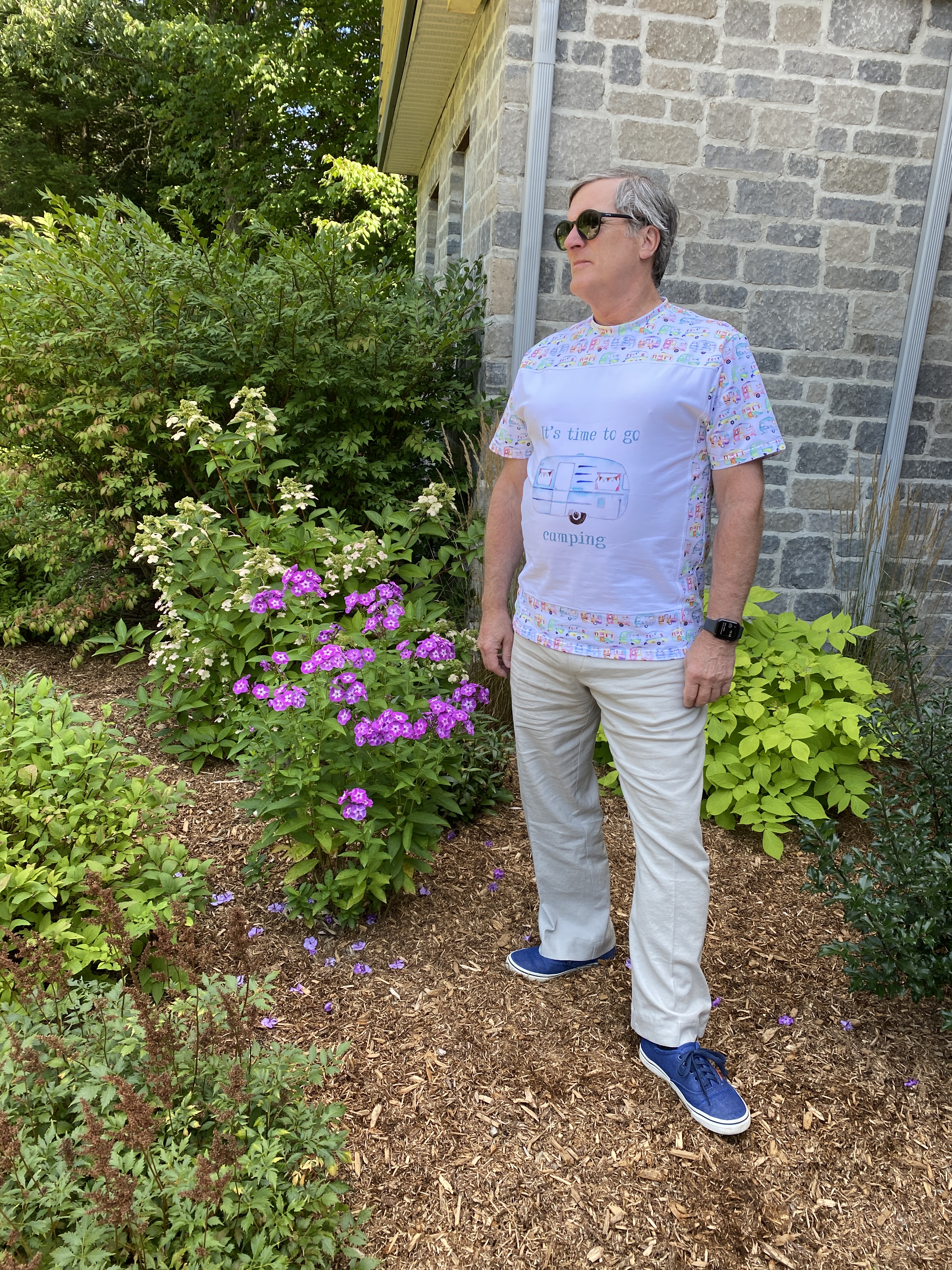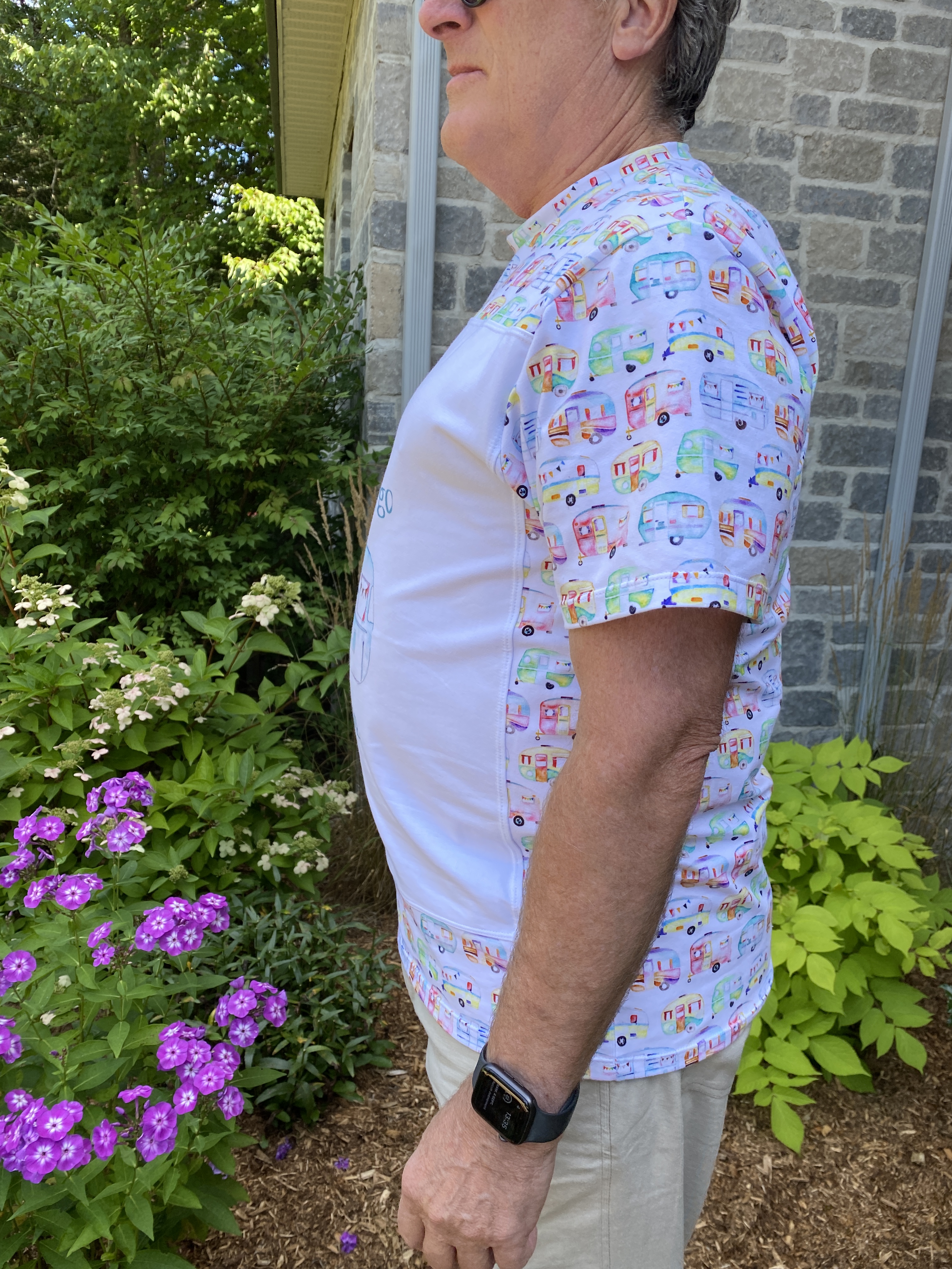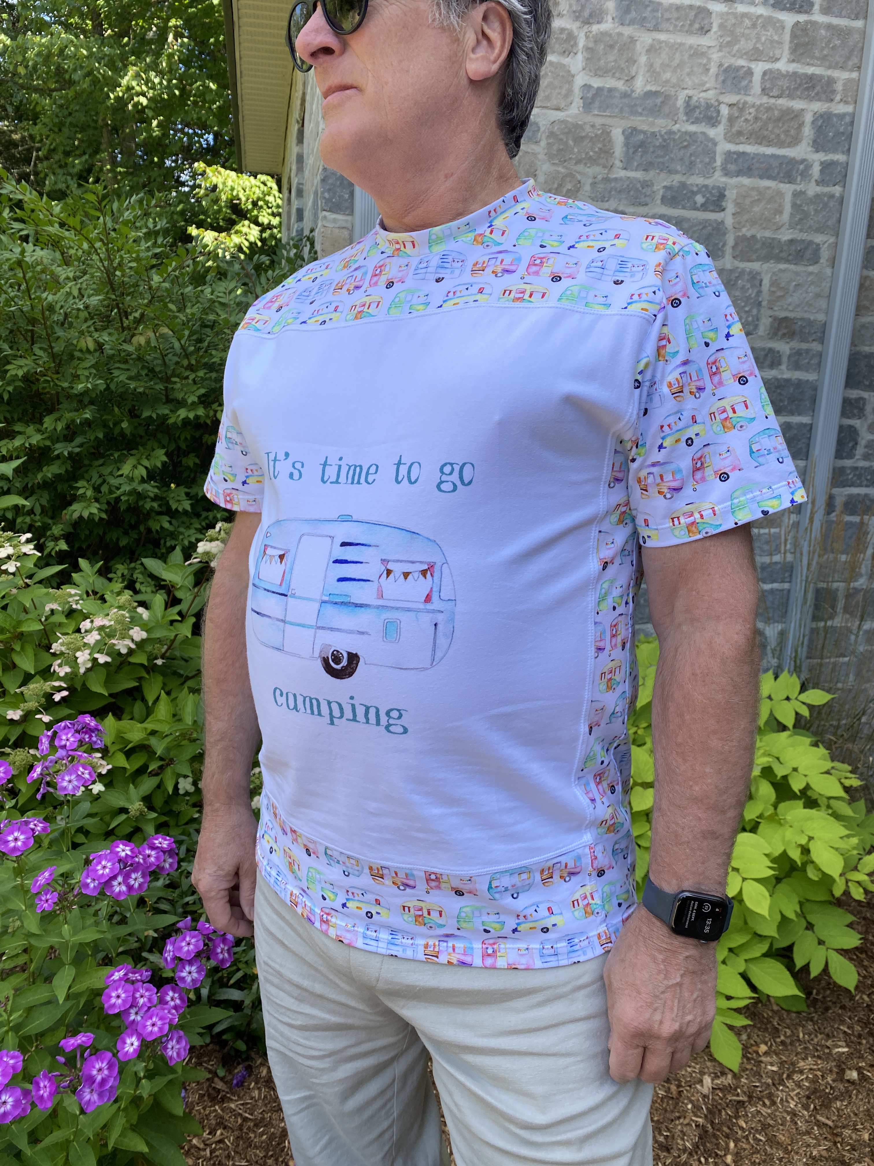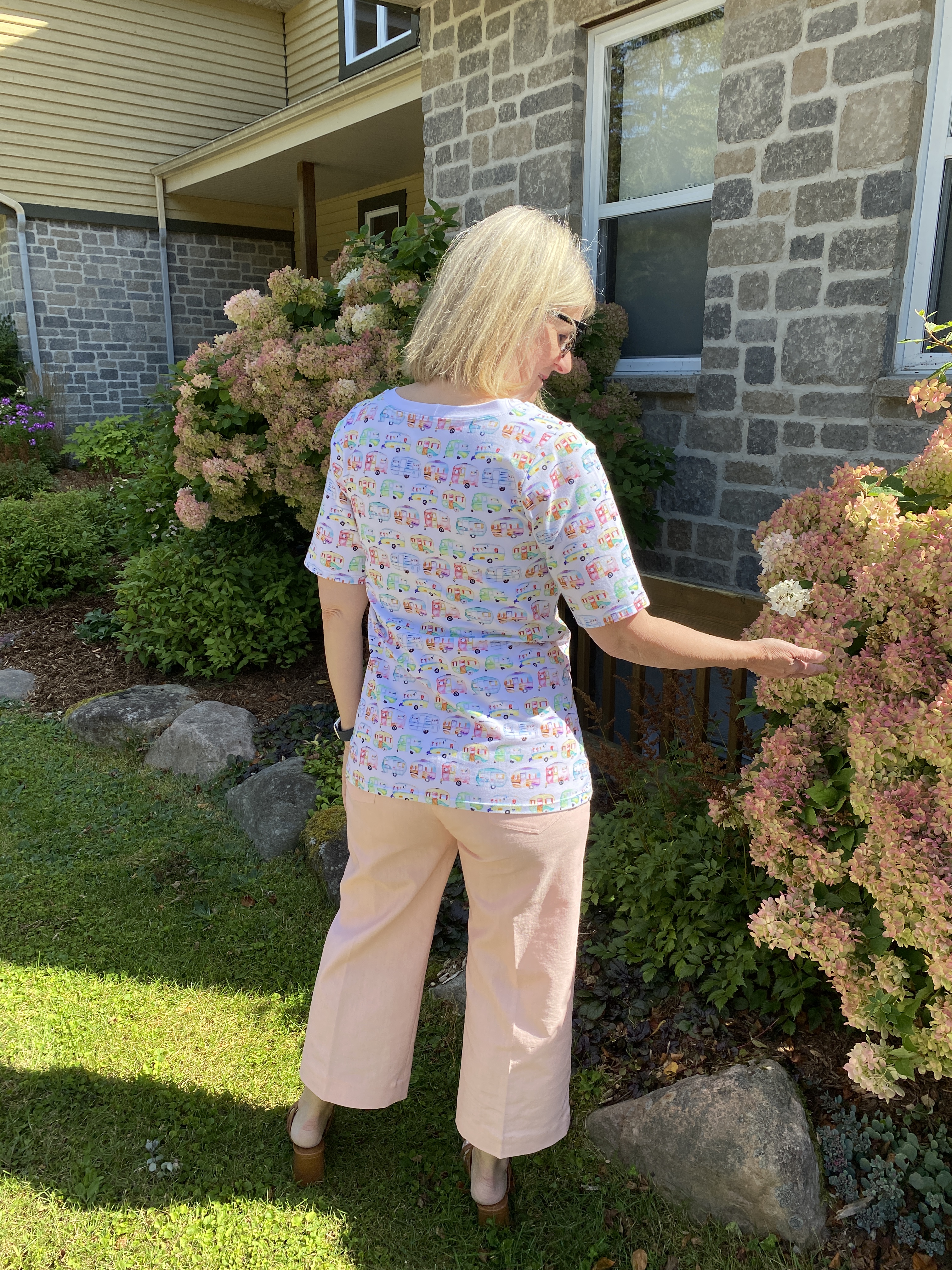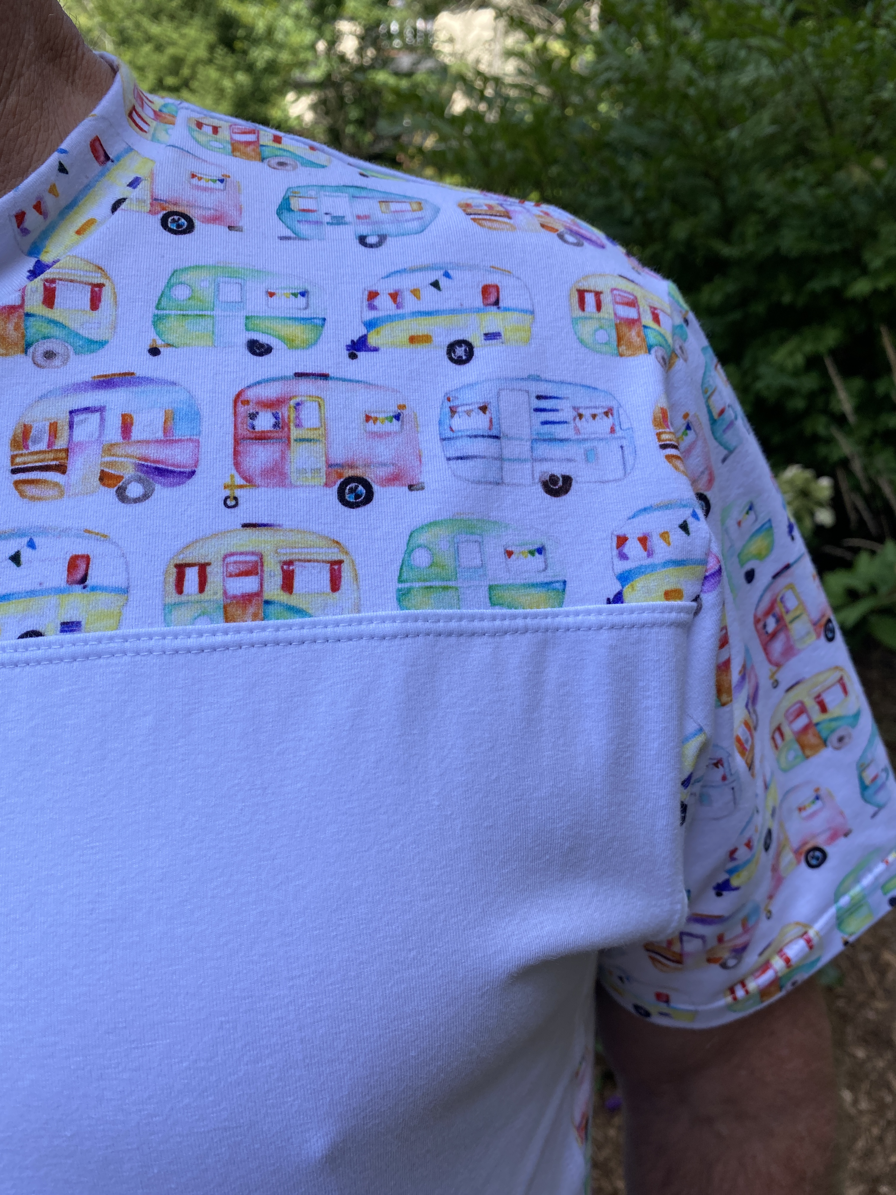 Women’s Pretty Panel Tee, A Sparkling Baby avec un panneau rigolo et son tissu assorti acheté dans mon groupe de revente sur FaceBook. (Pas de lien car la créatrice de ce patron semble avoir fermé boutique! Désolée 😕)