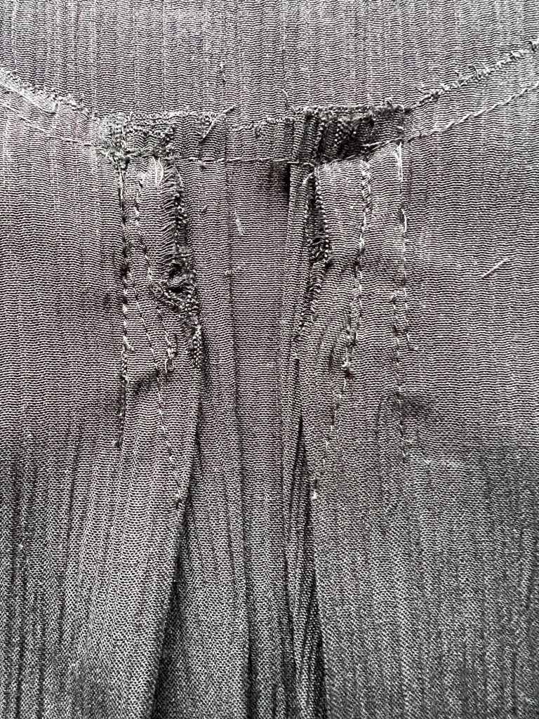 Et je l’ai essayé … elle avait au moins 30 cm trop longs! Je ne me suis pas méfié car sur le mannequin du magazine, elle lui arrivait plutôt en longueur midi, comme juste à la cheville. J’avais pourtant aussi mesuré les panneaux, mais il semble que le tissu de crêpe rallonge avec son poids!
