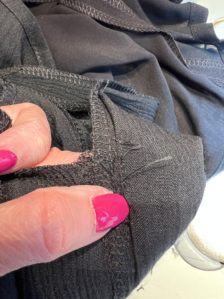 J’ai aussi eu la brillante idée de rajouter des poches dans les coutures latérales pour y cacher un petit mouchoir… ou 2. Encore ici, la fragilité du tissu, me poussa à repasser une deuxième et même troisième… couture à très petit point juste après avoir cranté la partie dos de la valeur de couture le haut et le bas de la poche afin de m’assurer qu’en étant trop proche de la couture avec ce cran, cela allait s’effilocher ou déchirer. Évidemment, vous me voyer venir, à la dernière poche de cette retouche, à la dernière couture (on se rappelle dans du tissu noir avec du fil noir… j’ai pris en sandwich un tout parti du devant qui a dû glisser entre mes doigts… RGRGGRRR … et découdre avec mon plus fin de mais découds vite en récitant mon petit catéchiste… me voici avec ma super loupe essentielle cet exercice 😂 !