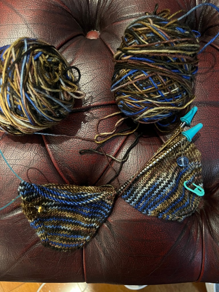 Des bas selon la méthode au départ du Gars qui tricotte et j’ai continué avec l’aide du video de Clo tricots pour la méthode du talon à rangs raccourcis et le reste du bas.