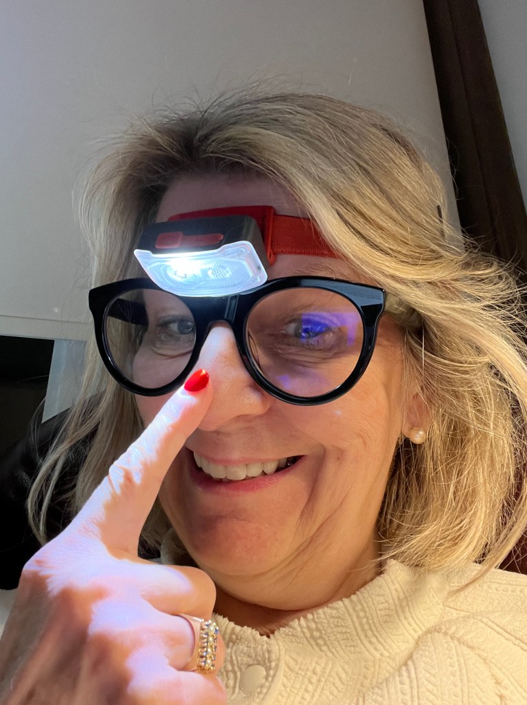 Me voici avec ma super loupe qui m’a aider à sauver ma robe et ma lampe frontale qui me permet de tricoté en auto ou en voyage dans les endroits mal éclairés!
