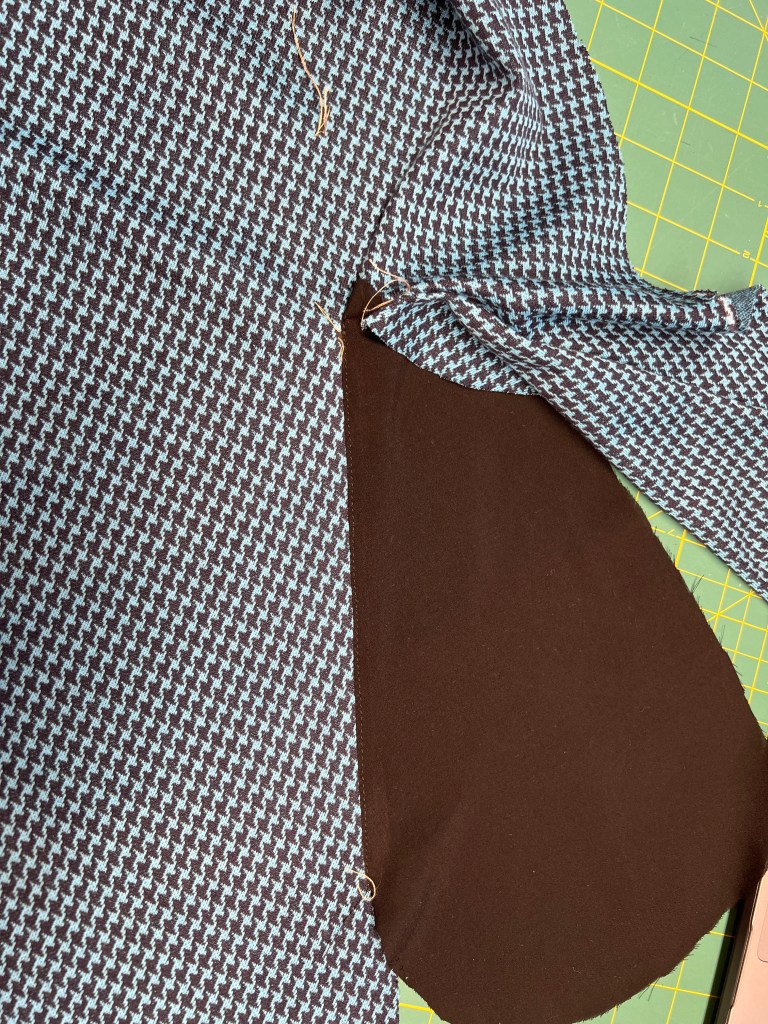 Voici l’intérieur des poches que j’ai fait en tricot côtelé assez dense et cela en fait presque un effet maintient du bedon en bonus! Cette façon élimine aussi les formes apparentes des poches à travers le tissu. J’ai mis au pli aussi le dos ne voyant pas pourquoi il ne le conseillait pas.