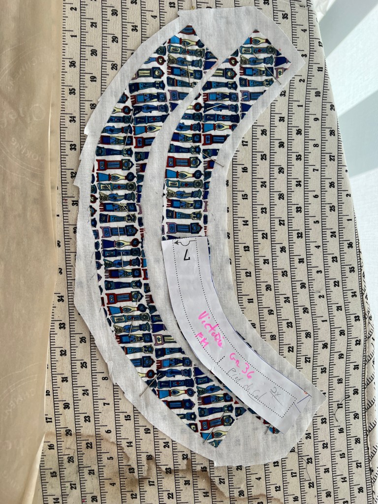 Décalqué avec mon nouveau papier bâche transparent acheté en France, ce fut un charme et j’ai rajouté à l’oeil mes valeurs de couture à la coupe. On voit très bien et c’est assez ferme pour ne pas déformer avant la coupe une fois épinglé au tissu.