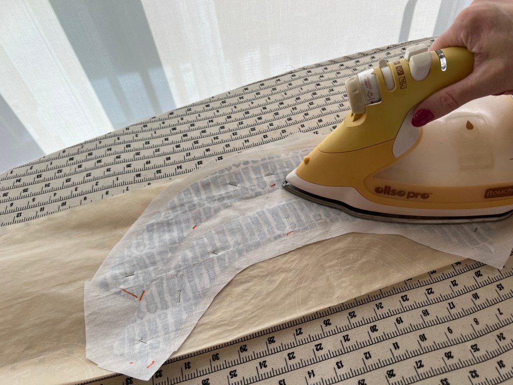 Ce tissu est très fin et fragile, pour ne pas risquer de le déformer ou d’étirer dans le biais en posant l’entoilage thermocollant, j’ai déposé mon morceau de patron sur le morceau endroit du tissu qui lui est sur l’envers (colle sur le dessus) que je dois encoller et ce juste avant de le presser afin de comparer et vérifier qu’il n’est pas déformé. Je le travaille avec mes doigts pour qu’ils reprennent sa forme requise. Ensuite, je mets un papier cuisson pour éviter de glacer le tissu et gommer mon fer et je presse fermement le tout. Je découpe ensuite le contour et ma pièce qui reste ainsi identique au patron. On peut aussi fuseler un plus grand morceau de tissu que notre patron d’avance sur l’entoilage et ensuite couper nos pièces dans ce tissu déjà entoilé et ainsi de la même idéologie, notre patron sera respecté d’en avoir la chance de se déformer en la manipulant ensuite. Je fais la première méthode car, lorsque je coupe, je n’y pense jamais par habitude à tout couper rapidement!🤦🏼♀️ Donc, la première méthode me sauve! Voici pourquoi je vous partage les 2! 😅