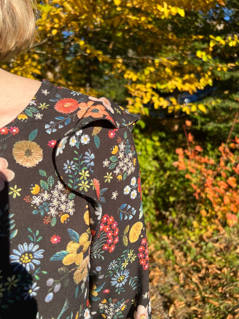 J’adore ce mini volant au cou, il ne me sert pas mais c’est vraiment juste ainsi que les épaules aussi. Inversement les bracelets de manches étaient beaucoup trop larges et je les ai réduits de 6 cm! Je dois avoir de très petites mains! 😅😅