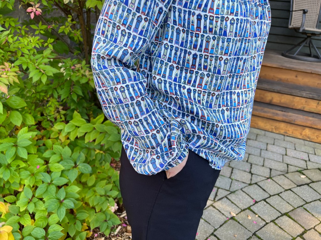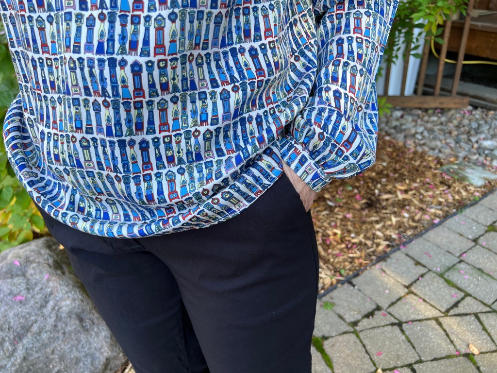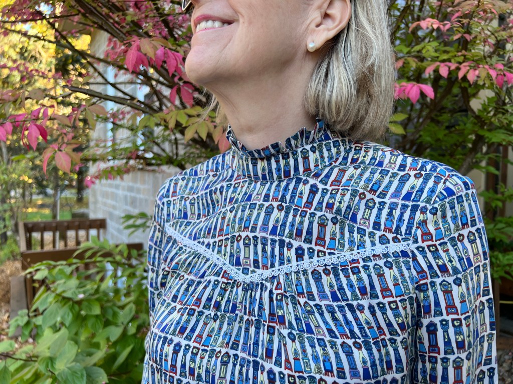 Et dans cet élan, j’ai taillé une blouse Victoria de Fibre Mood en 36 élargie aux hanches en 38 dans un tissu aussi que j’avais dans ma tissutèque (j’adore ce mot, cela sonne plusieurs léger et légitime que réserve ou « stash » 😅) depuis quelques années. Acheté chez Dressew en personne à Vancouver, j’avais aussi que et ce motif et sa garniture de dentelle délicate comme des cadrans de montres et parfaitement associé à ce type de blouse, je trouve!