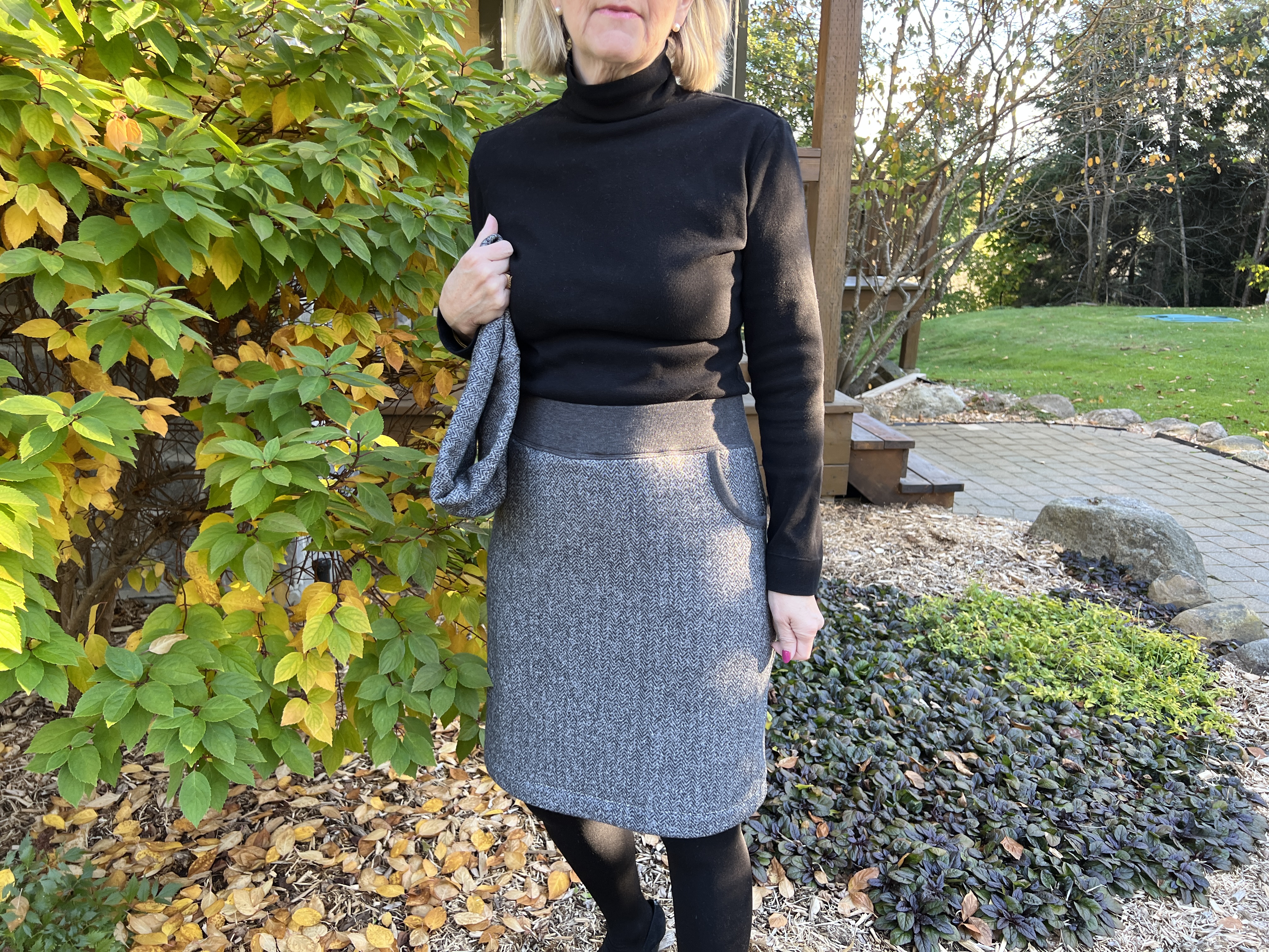Jupe Carola en tricot La Maison Victor édition– Taillé en 38 sans modification dans 80cm de tissus tricot français envers bouclé et épais plus 1/4 de mettre de bord cote gris charcoal pour la taille et les bordures de poches et 1/4m pour les poches intérieures.