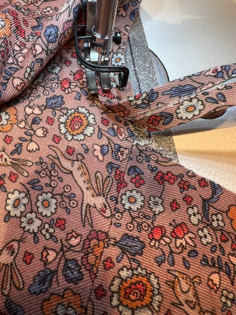 Dans ce tissu acheté en Espagne dans la fameuse boutique de tissus Ribes & Casals, j’avais eu un coup de foudre pour le motif de lapins mignons et surtout de la douceur et épaisseur incroyable (comme de la flanelle) de ce sergé de viscose Okeo-Tex Viyella (https://magasintissus.com/fr/viyella-viscose-lapins-rose.html). En boutique, il n’en restait qu’un 1m50 et sans hésité, j’ai coupé Ermine de fibre Mood dedans. Ce tissu un peu rétro est parfait avec ce type de blouse d’époque. Attention les flèches du droit fils sont très courtes et j’ai dû les rallonger dans certains cas afin d’être vraiment précise. Aussi ne pas tenir compte des grandeurs affichées car sur mon patron cela se résumait finalement à small médium large, …etc. 🧐 J’ai donc choisi small. J’ai bordé l’encolure au biais renversé (que j’ai faits moi-même selon les instructions de la marque. J’ai fait un simple rentré double de 1.5 cm aux bords et aux manches.
