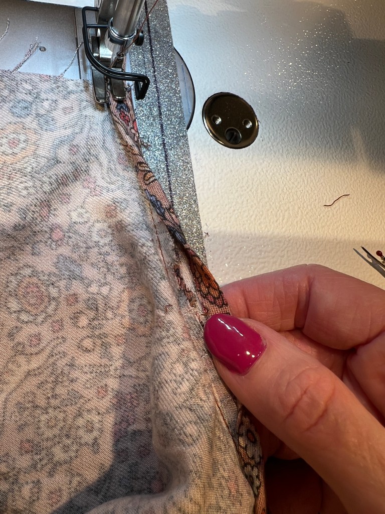 J’ai, par souci de belles finitions et encore pour réduire l’effet effilochage chronique, surfilé entièrement la robe et la doublure avant de l’assembler envers contre envers et fini en plus les emmanchures sont bordées au biais de satin.
