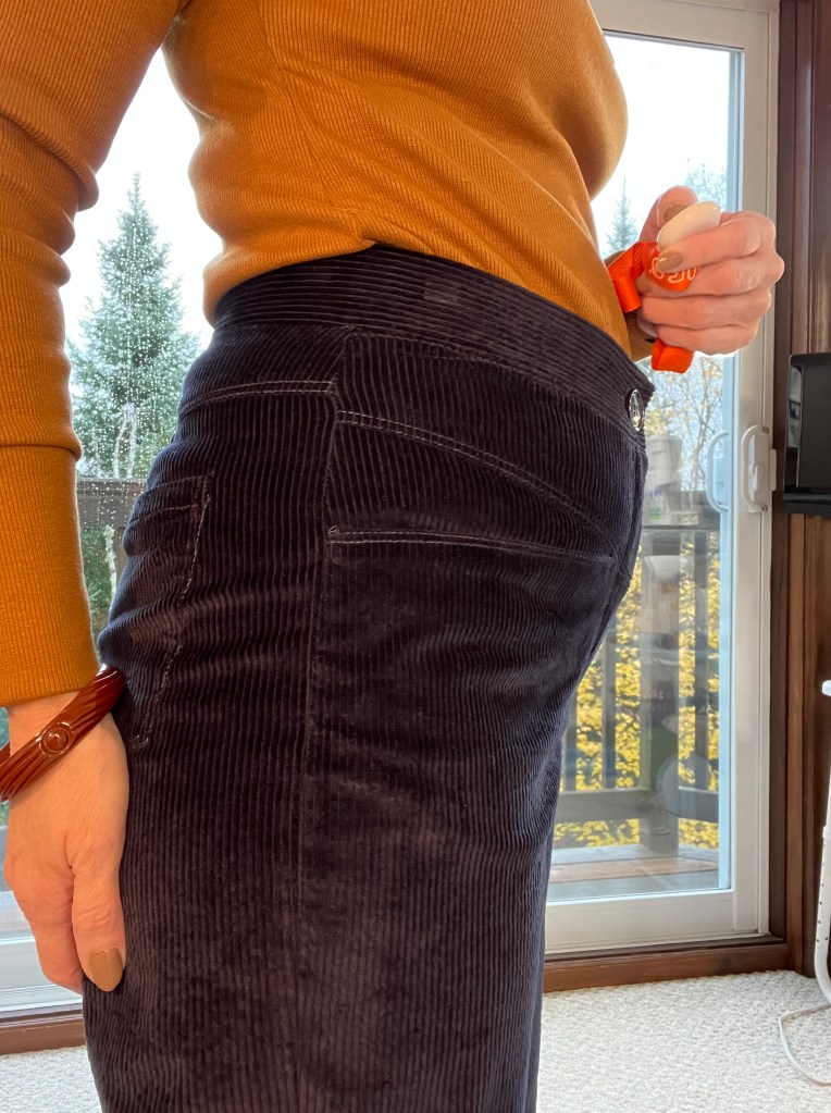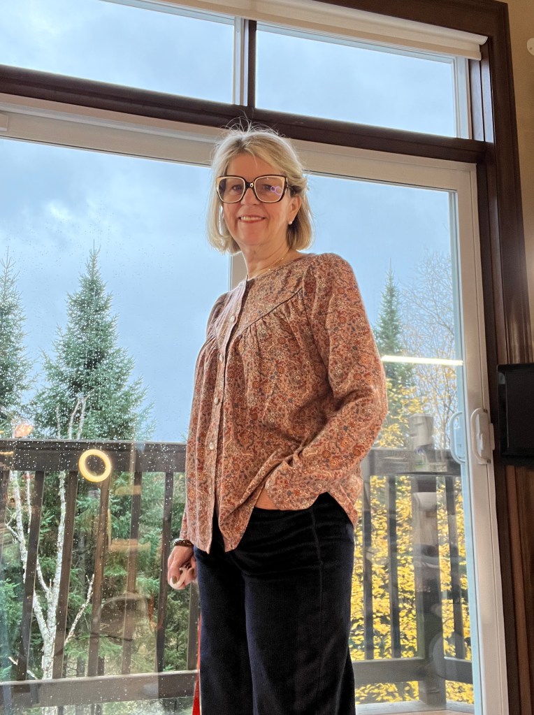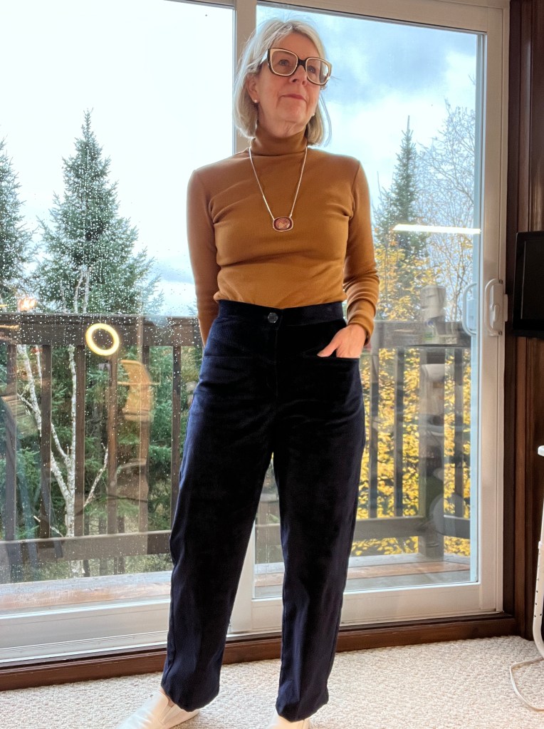 Ce pantalon style Mom Jeans hyper confort était dans ma liste quand j’ai vu les découpes de poches originales. Lorsque je suis allé en France l’an dernier, j’ai visité la boutique Nuances Fabrics dans la région de Biarritz et parmi les trésors que j’ai rapportés, j’avais déniché ce velours côtelé navy Anita 1,6 pour 18€ qui est assez extensible mais surtout très soyeux et brillant! Je peux m’imaginer que c’est de la grande qualité car je l’ai lavé et sécher à la machine et il est ressorti impeccable. Ce bleu va pratiquement avec toutes mes blouses que j’ai cousues!💙💙💙🧵🧵💙💙💙
