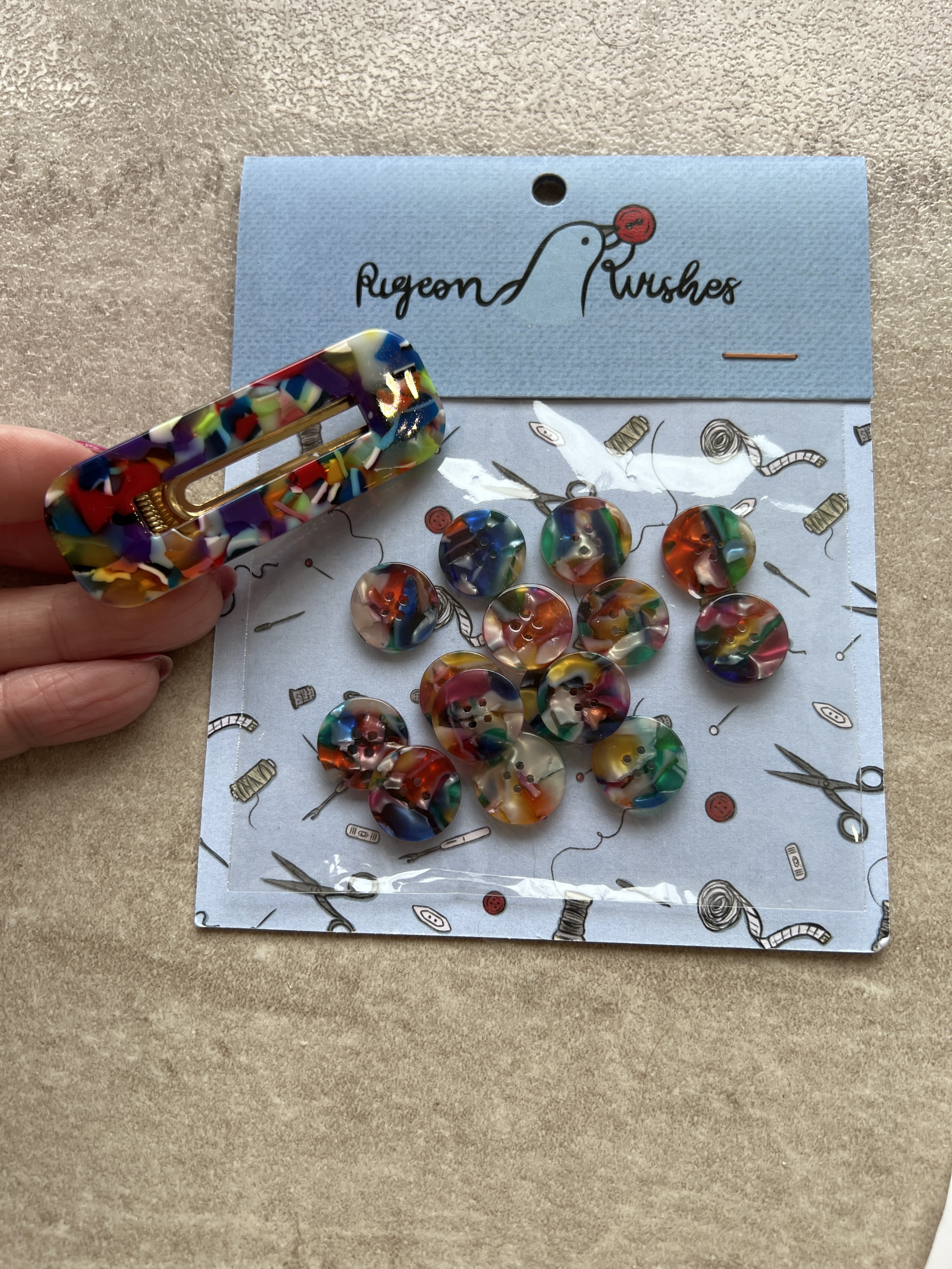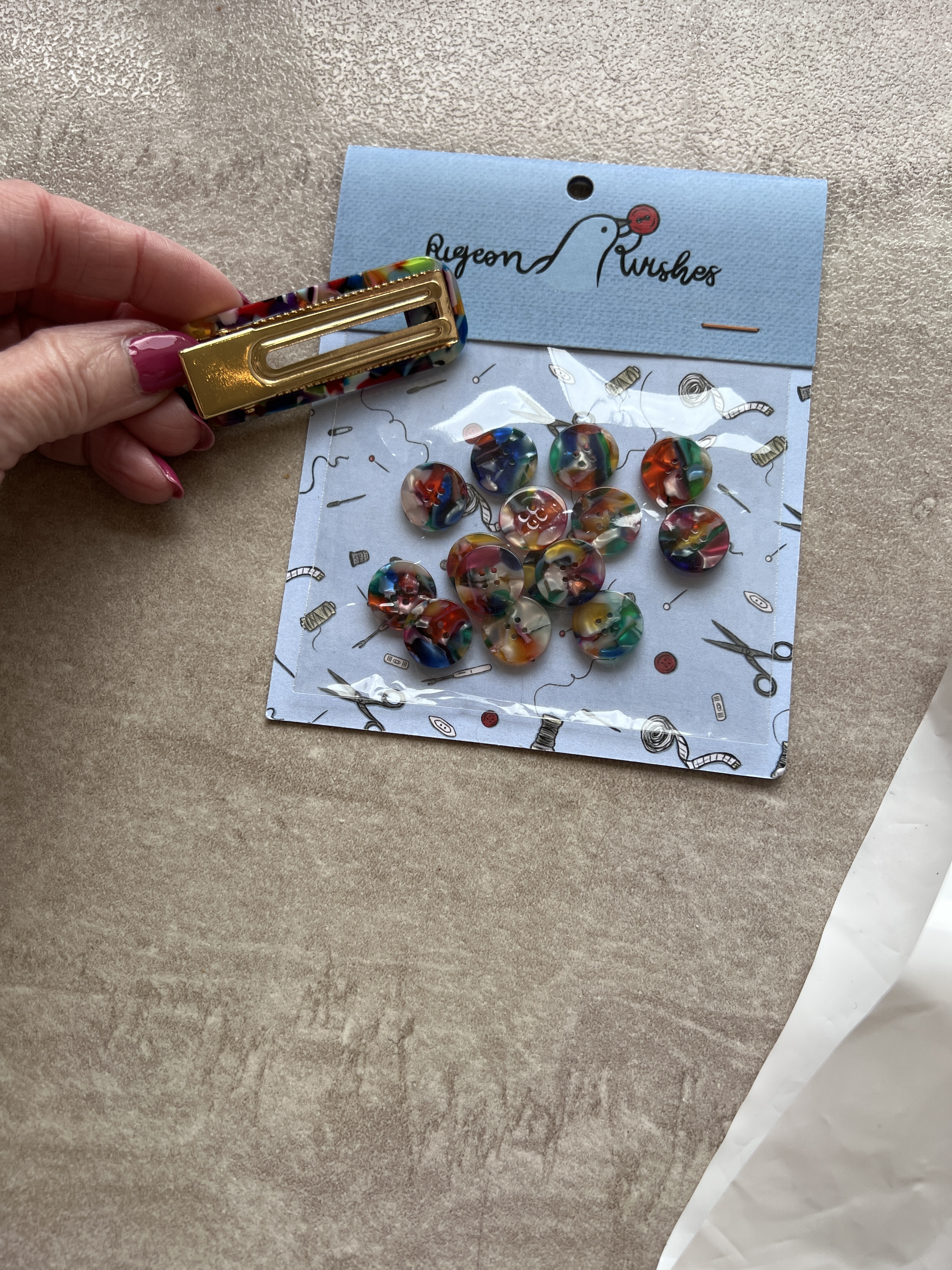 Une sélection de bouton en résine trop beaux de chez @pigeonwishes.shops ! Vous remarquerez que les premiers s’accordent parfaitement avec une jolie barrette achetée avant mon départ! (Jean Coutu) Les 2ième irons avec l’incroyable tissu danois de chez @mindthemaker fabrics dont j’ai l’intention de me faire une robe Feliz de fibre Mood peut-être!