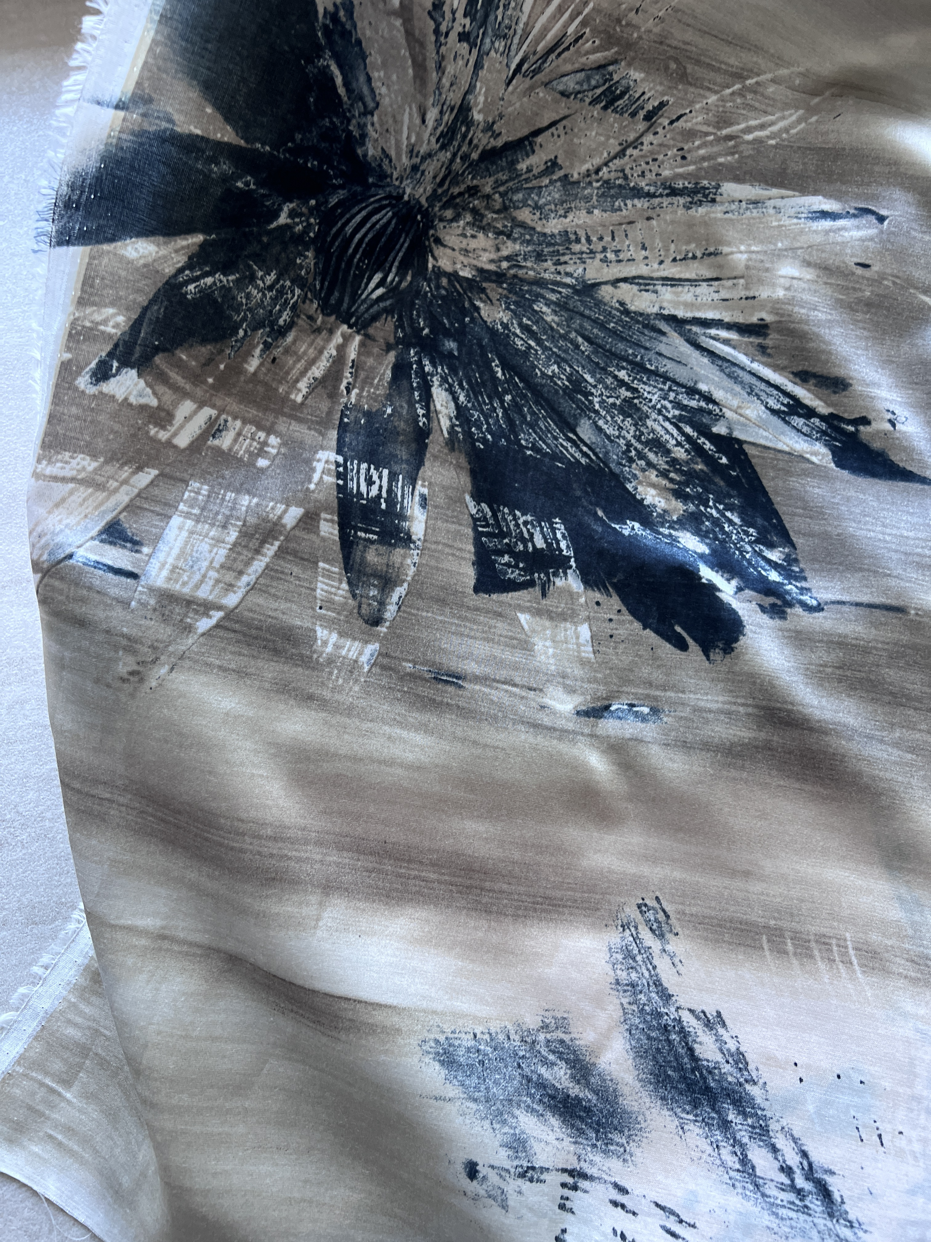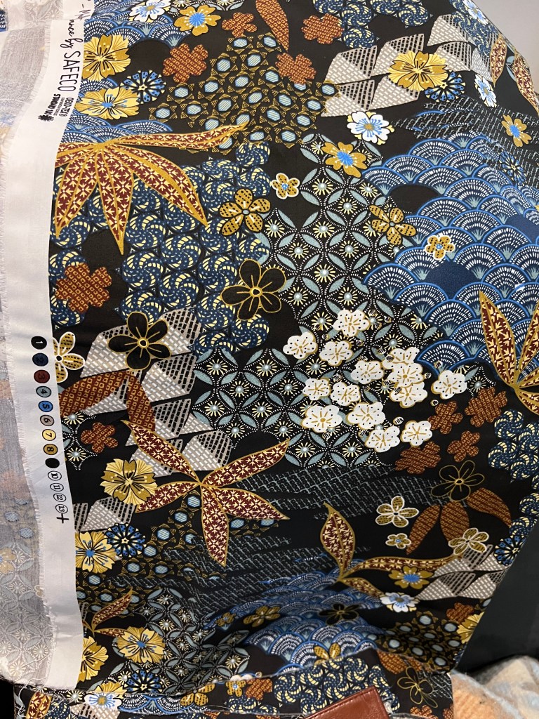 La dame qui m’a servi fut très perspicace de remarquer mes gouts pour le beige et me sortit de la pile cette jolie pièce à laquelle je n’ai pu résister. Le mélange coton/soie et pourtant très soyeux devrait aider à ce qu’il soit moins fuyant sous le pied-de-biche et moins glacial à porter! La fleur n’est pas sur tout le tissu, sur mon podcast sur You Tube de ce Journal créatif de Voyage vous allez voir l’ensemble du tissu, c’est très joli et chic.
