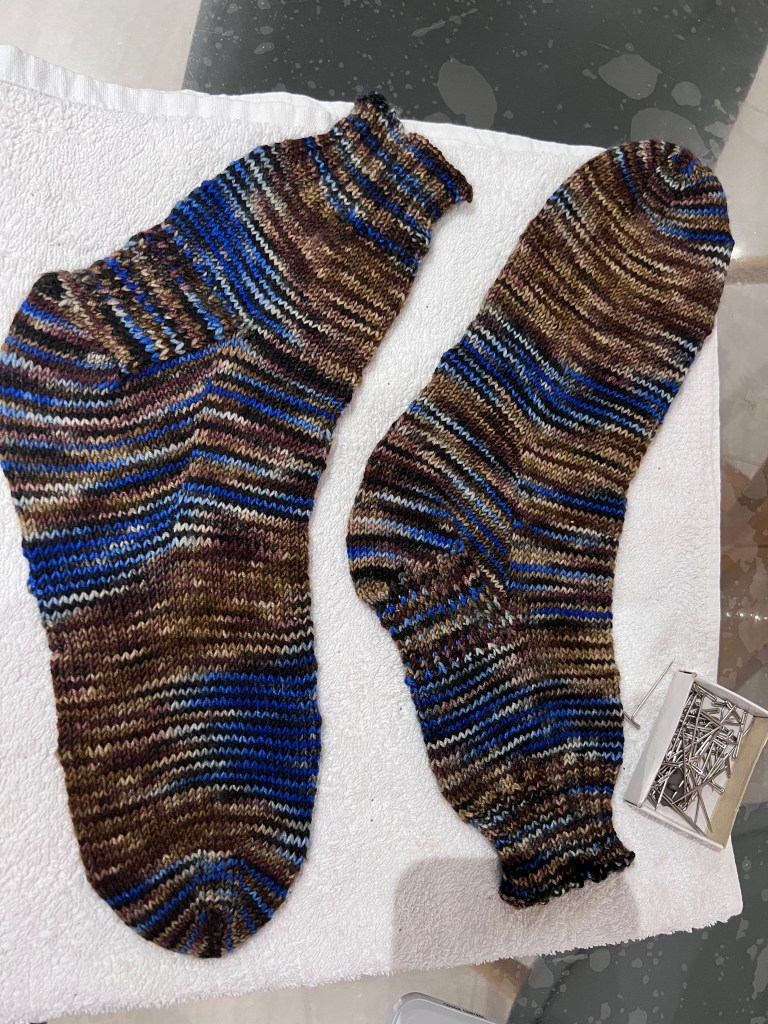 N’ayant pas de surface assez grande pour les épingler pour le blocage, je les ai bloqué sur des épaisseurs de serviettes bien sèches et elles s’en sont sorties très bien.