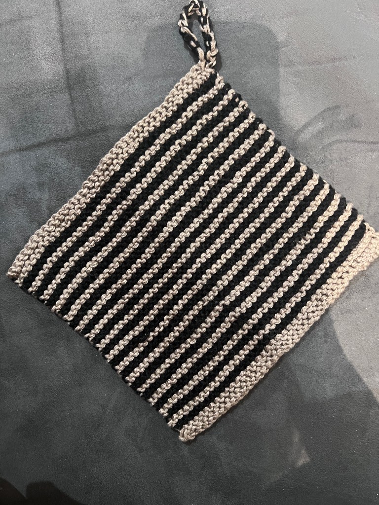 L’autre est un patron que j’ai fait à plusieurs reprises car j’aime l’impression qu’elle se fait plus vite par sa construction originale en biais. https://verypink.com/2011/06/14/learn-to-knit-a-dishcloth/ Un parfait vide tête au besoin!
