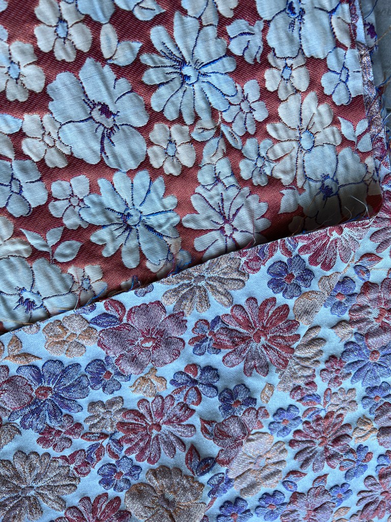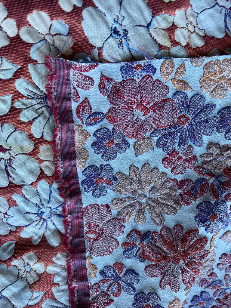 Brocart (GIF) 60% CO 35% PES 5% MET afin de me faire une veste d’été chic mais sport type « Bomber ». Ce brocart est réversible, un côté brillant sur le dessus mais pourrait n’être pas doublé car l’intérieur contrastant en coton uniquement est très joli et un peu plus orangé.