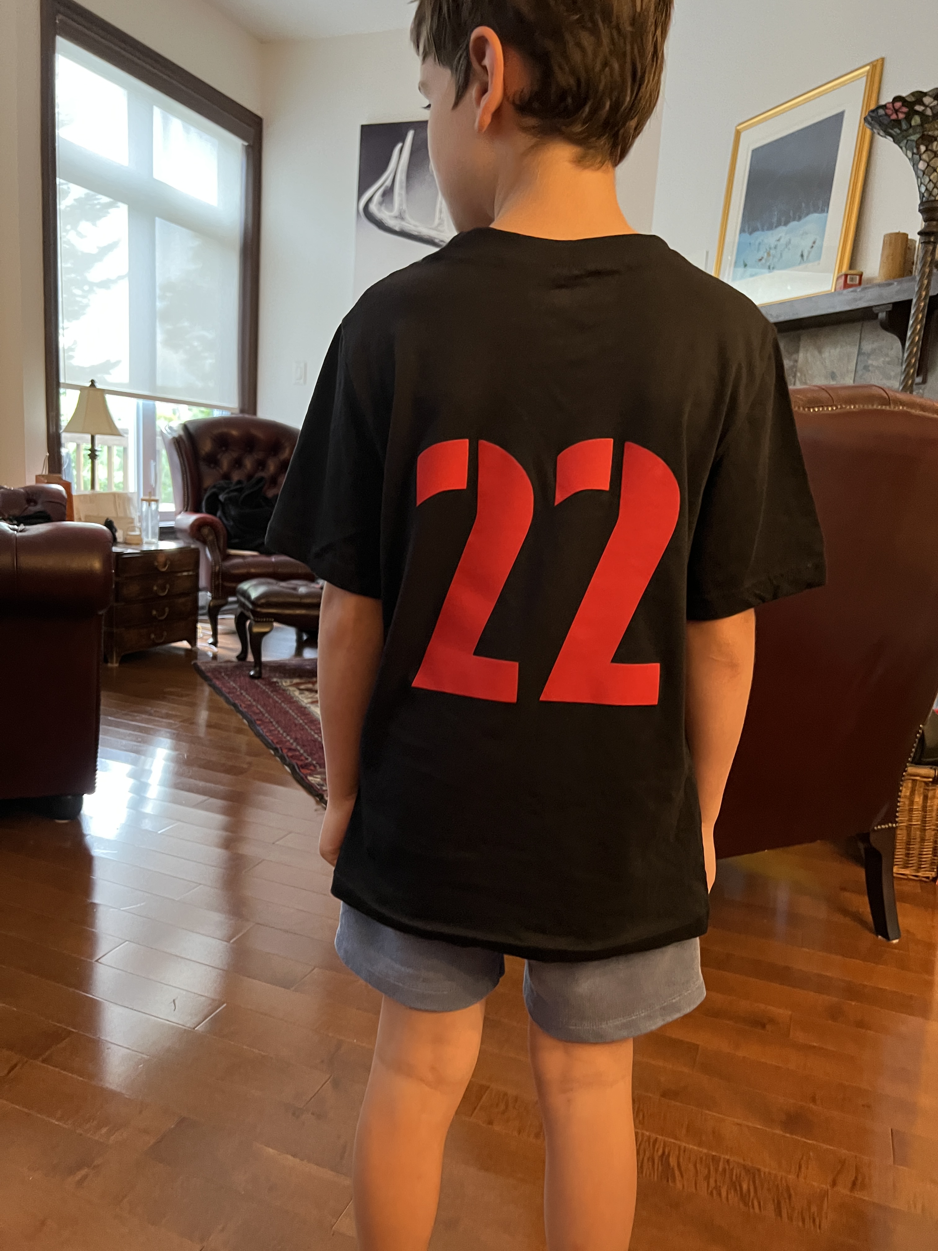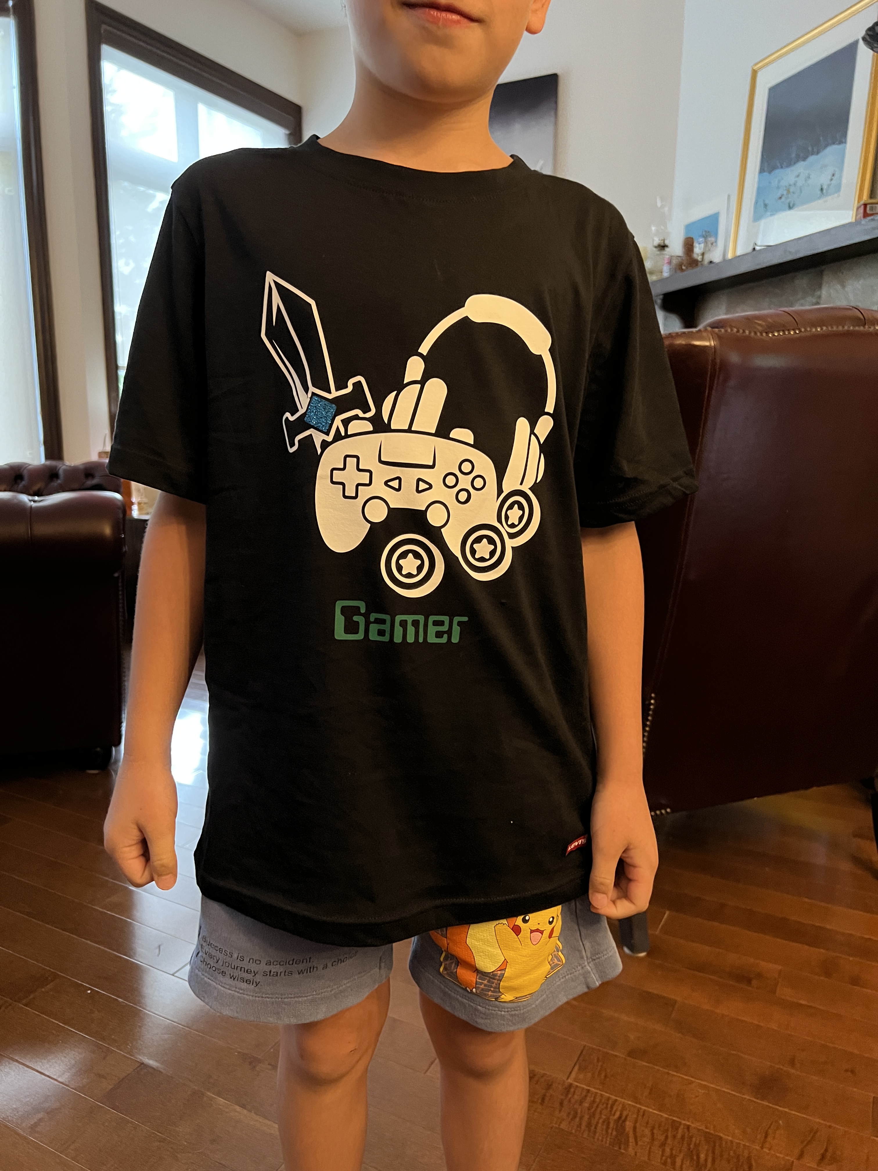 Apres un peu de pratique à maîtriser la bête qui l’impressionnait beaucoup sur du papier pour commencer et ensuite sur du tissu et finalement avec un résultat d’un bel étui à brosse à dents offert à son papa et deux poules plus tard, il maîtrisait sans crainte la machine coudre de sa mère. Une des poules me servira de poids de couture et l’autre fut offerte à sa mère. Grand-papa Alain fut en charge d’un petit bricolage avec la Cricut avec un beau résultat sur un t-shirt très à son goût.