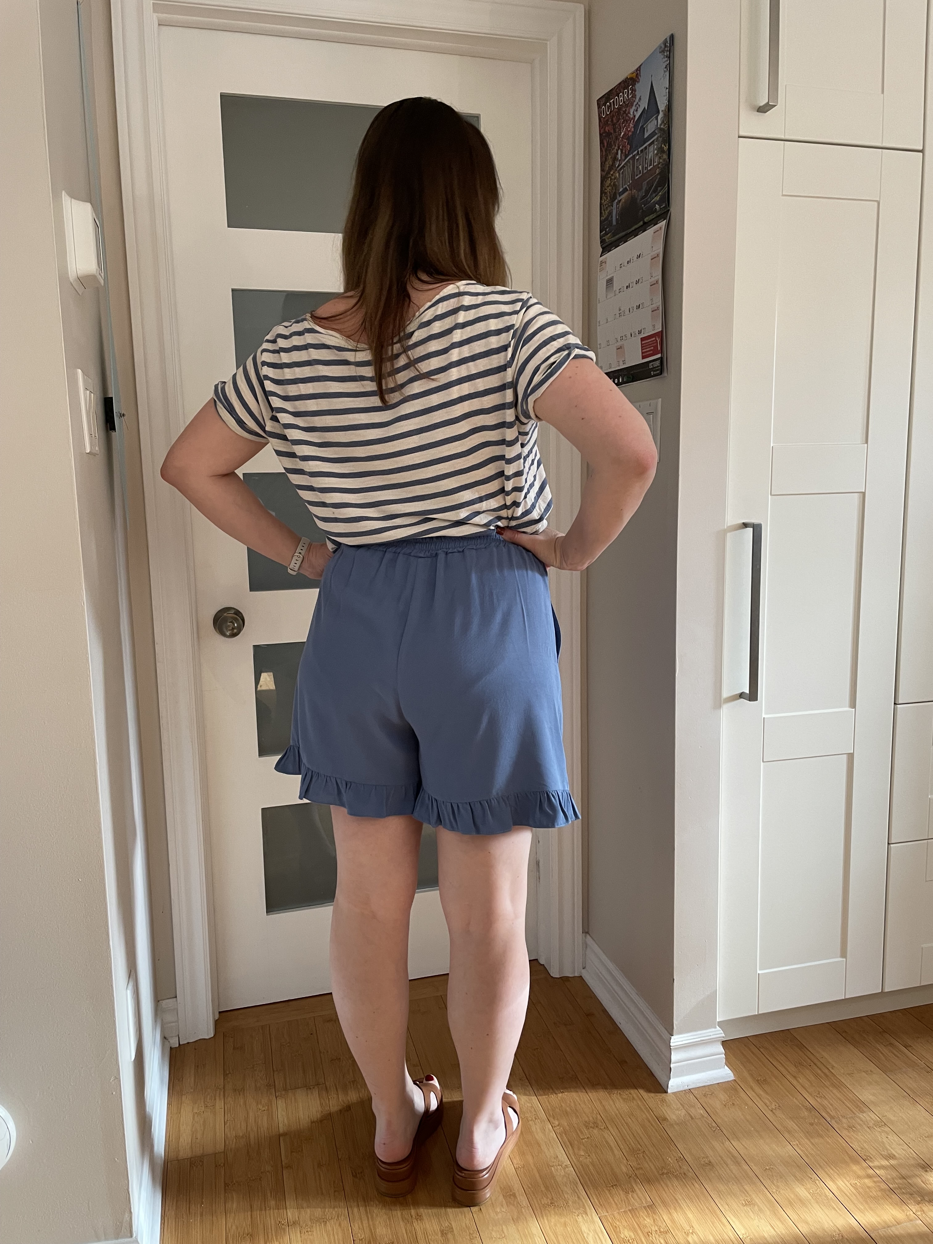 Entre-temps ma fille est ravie, quoi, qu’elle me re-mentionne qu’elle n’est pas vraiment du type petit volant… Elle aurait aimé mieux la boucle sur le devant…. 🙄😀🩳