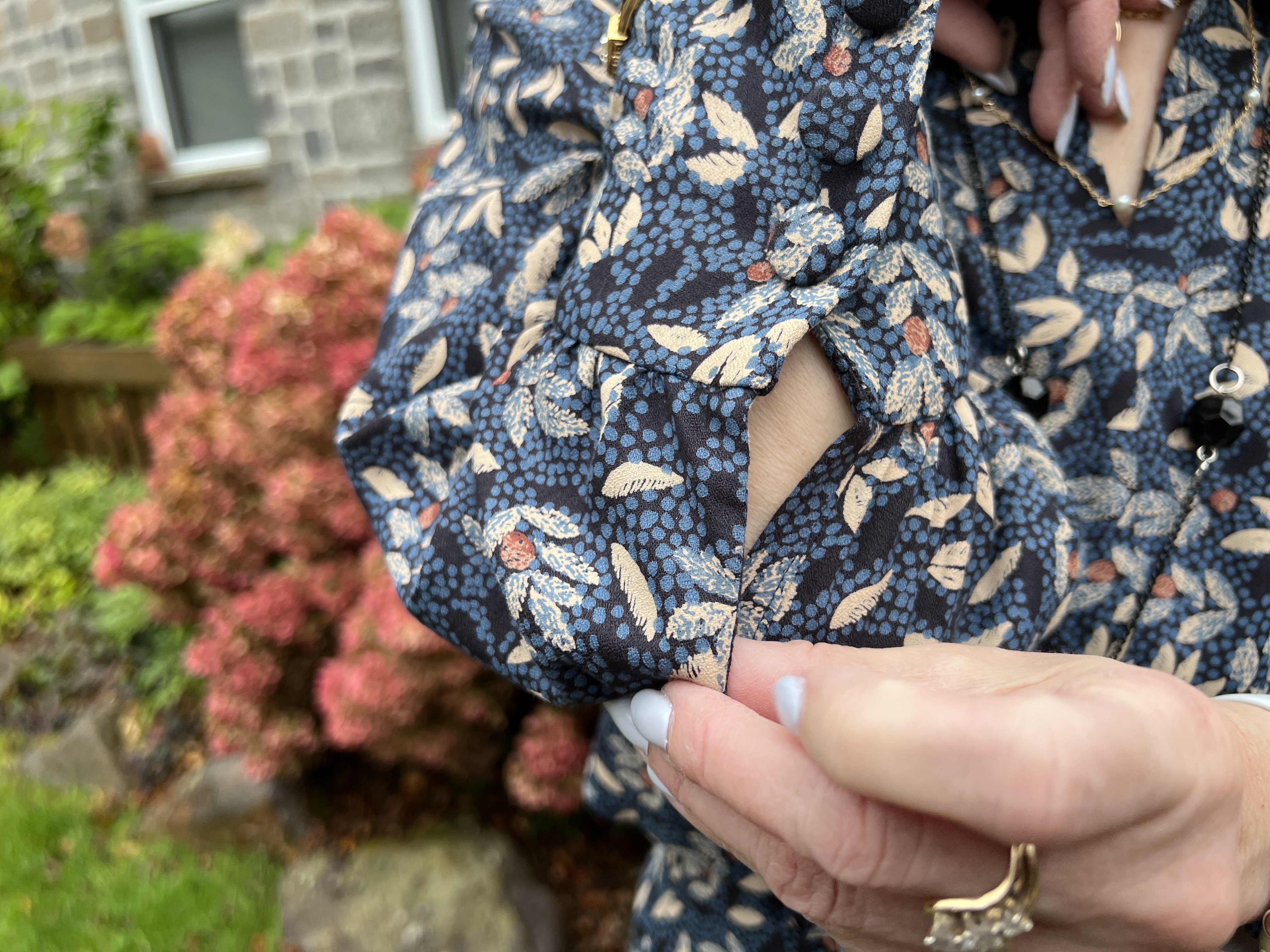 Ensuite, j’ai regardé les manches et vue le long poignet de manche boutonné, donc en calculant approximativement, les deux ensemble j’arrivais a l’os du poignet vis a vis mon pouce. Un peu juste mais les mannequins semblent toujours avoir les manches trop courtes ou les bras trop longs dans ce magasine! Donc, j’ai coupé sans modification…. Vous me voyer venir… elles sont bien trop courte aussi! 😳 D’au moins 10cm car, si je veux garder l’effet un peu bouffant de la manche, il faut qu’il reste de la longue à ce niveau vis a vis les fronces. Lorsque je pli mon bras le coude sort par la fente indéchirable… misère… -« la pas fine, elle…. »