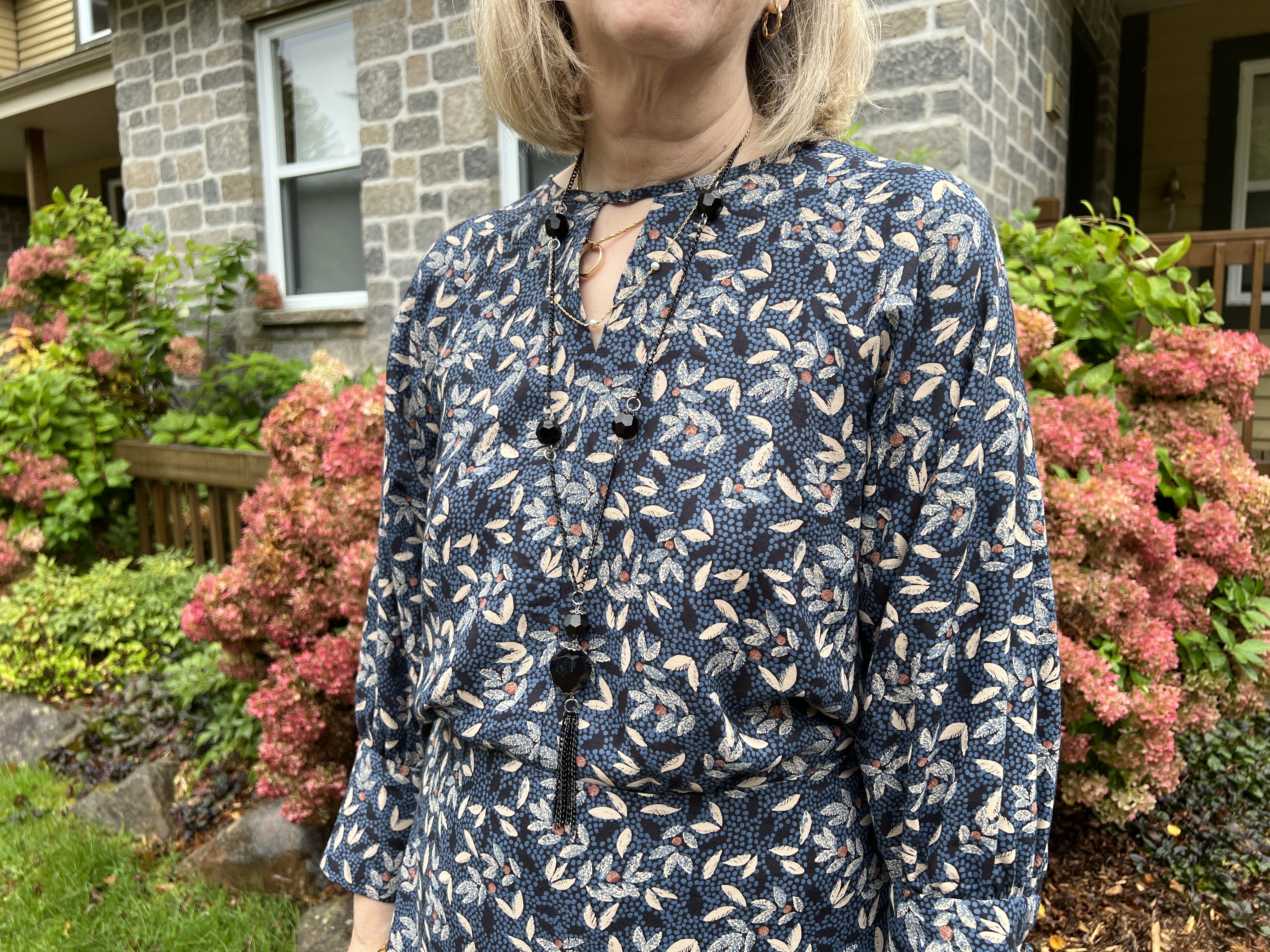 Ce patron me plaisait pour son originalité du col et de cette longue jupe A qui allonge la silhouette. J’ai beaucoup de viscose mais vue les coutures centrales du devant et dos du buste en plus de celles des manches raglans, j’ai choisi un tissu assez fleuri pour ne pas avoir à me soucié de faire des raccords, 🤪