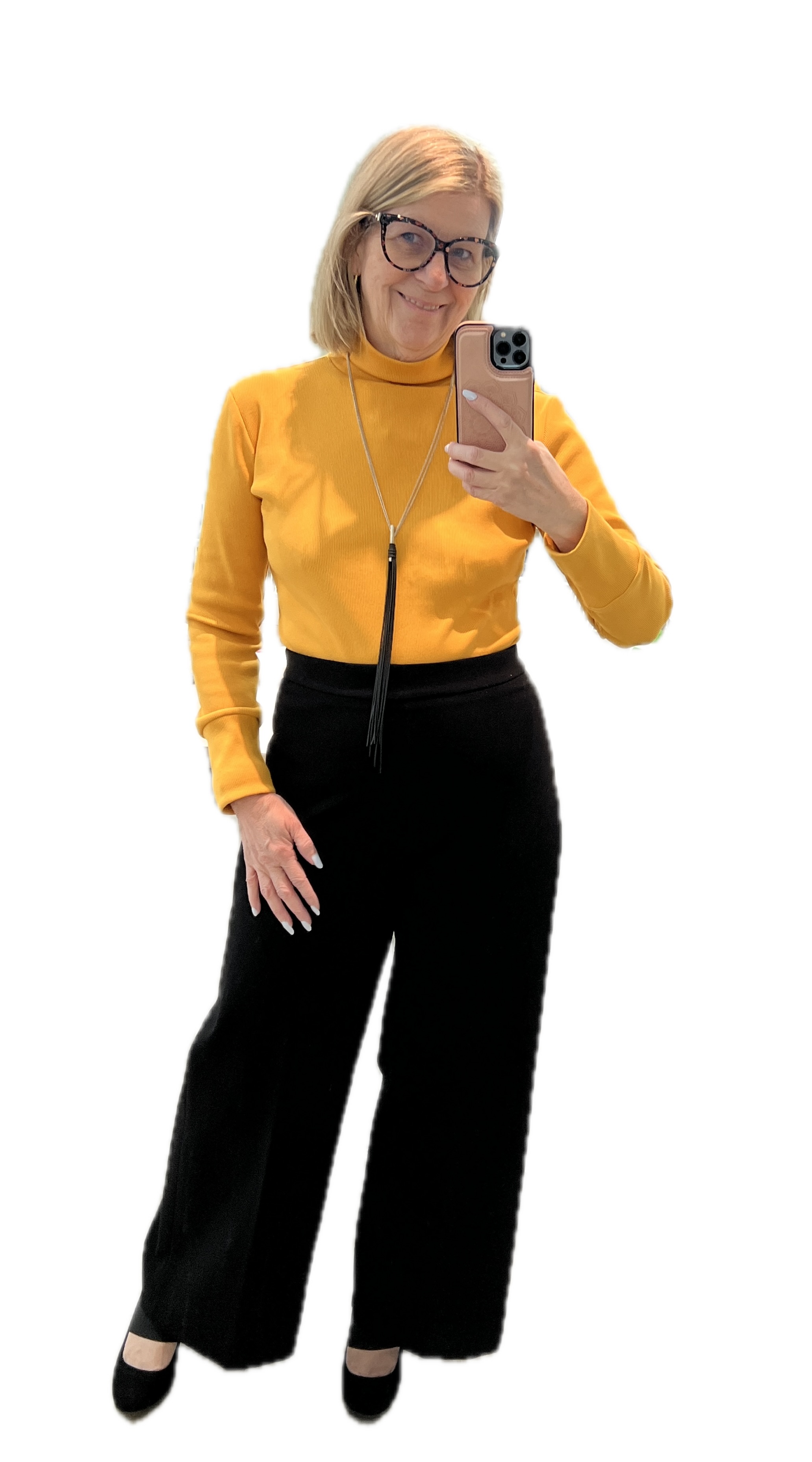 Évidemment, ce pantalon noir ira aussi avec plusieurs des blouses en viscose et hauts en tricot cousus l’an dernier. Le col roulé jaune va bien aussi avec mes pantalons Corderoy bleu ou beige.