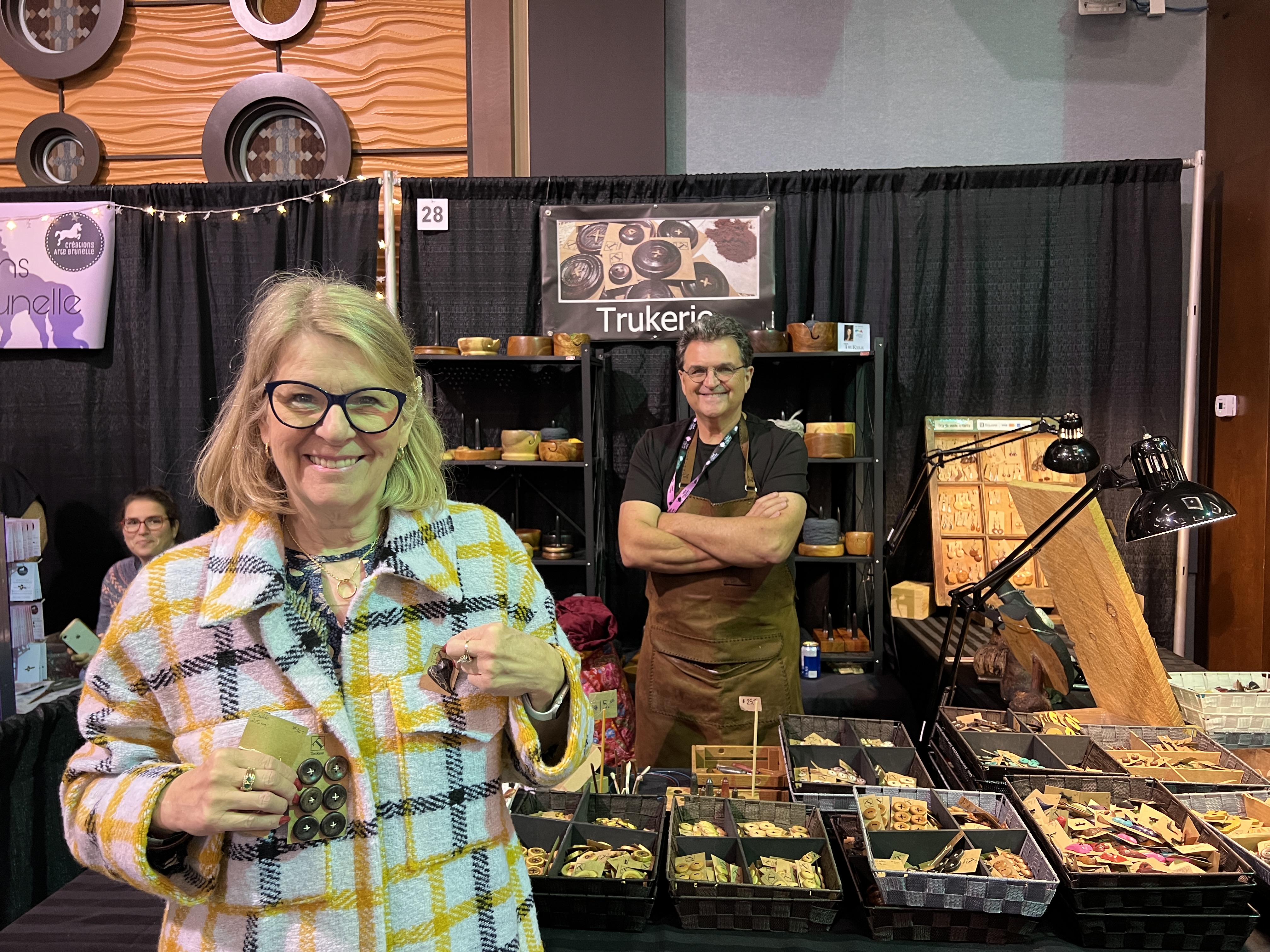Je ne suis consolée en achetant des boutons d’un artisan des Laurentides Monsieur Jean Mailhot de La Trukerie, il est très connu dans le monde des tricoteuses et je l’ai rencontré au Festival de la Petite Laine lors du même voyage. Ces boutons sont des oeuvres d’arts tous en bois d’essence différentes et taillés dans du bois de sa terre.