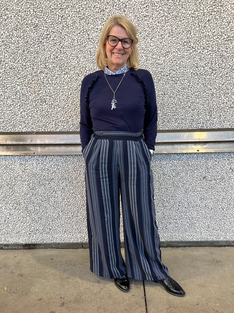 J’ai retaillé un Lison mais cette fois-ci en 38. Le tissu provient de Tissu Français du Marché du Prado à Marseille et c’est un tissu de fils teints et avec un mini fil Lurex bleu ciel parmi les rayures. J’ai aussi décidé, comme le Karma que j’ai fait l’an dernier, de le doubler pour plus de confort cet hiver avec un voile de viscose noir que j’ai aussi rallongé de 10 cm pour plus de couvrance et de confort. J’aime mieux aussi le tombé d’un pantalon doublé et ils se froisse beaucoup moins aussi. Je le trouve très réussi, cela valait la peine de faire une toile et j’adore sa couleur et ses rayures! Et il n’est pas trop grand! 😅