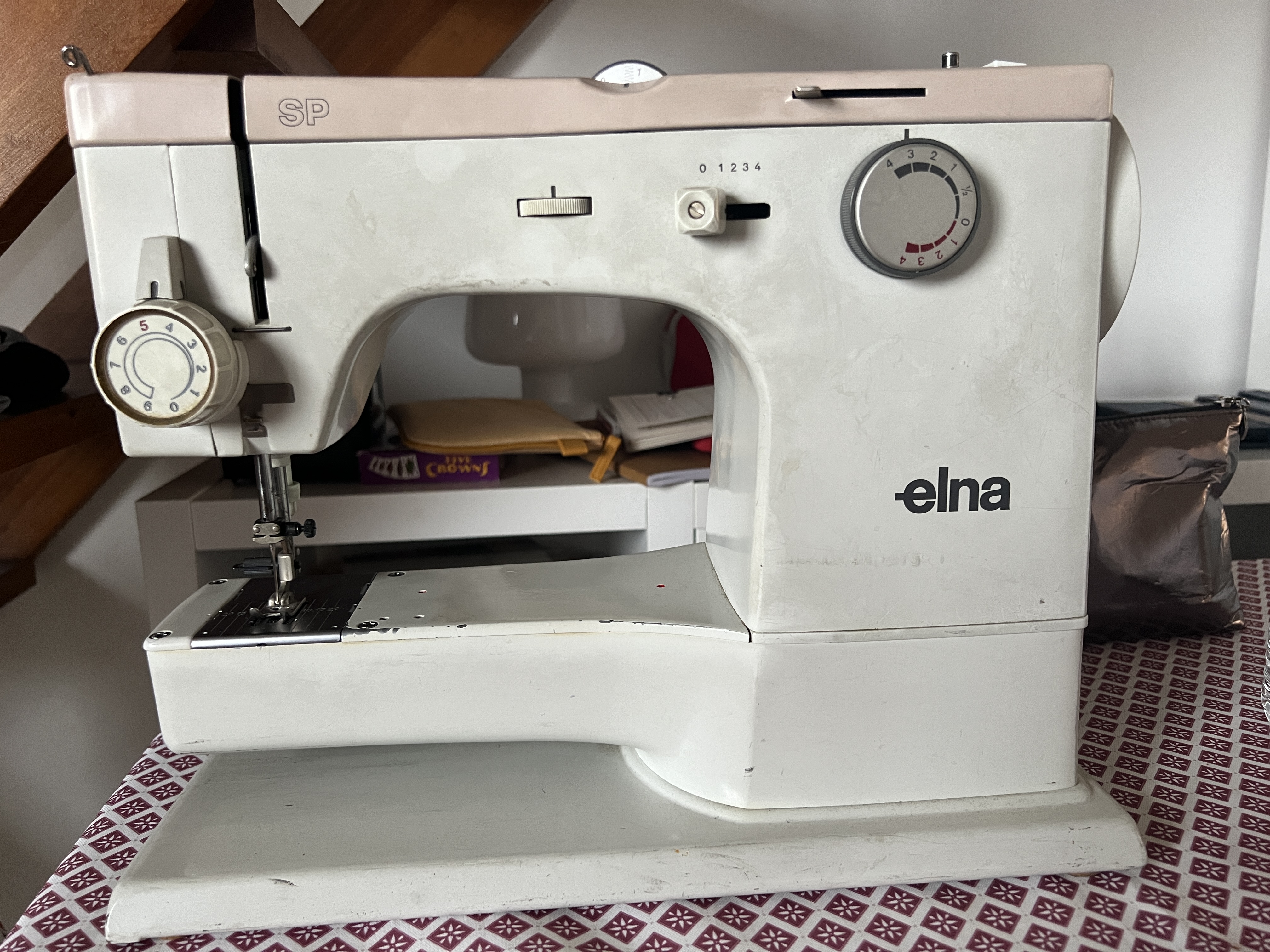 Je vous présente donc Elna ! Prêtée par une de nos amies « les sages » elle a environ 55 ans et toutes ses dents ! 😂Un bon nettoyage et un huilage lui ont fait du bien et elle ronronne avec un point droit impeccable. La fille est comblée. 😇🥰🧵💙
