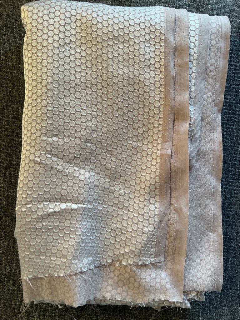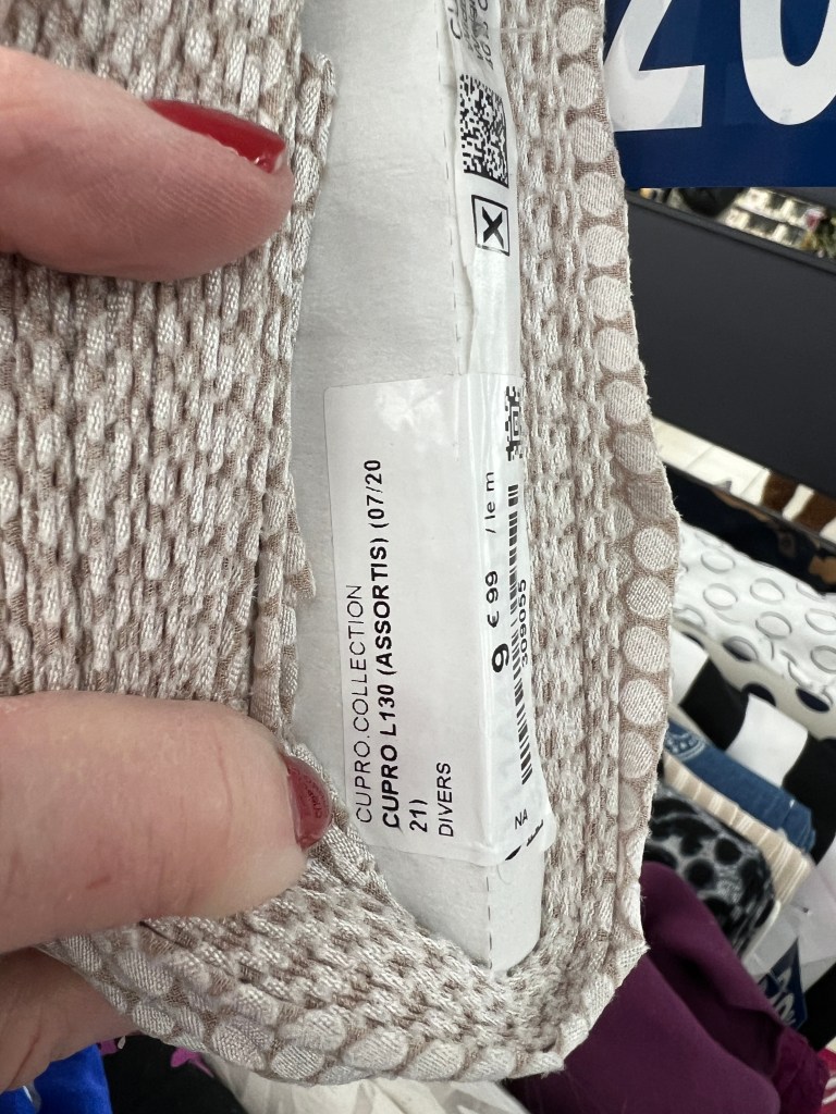 Un tissé semi lustré à mini pois en effet velouté en tons sur tons de 2 mètres au prix de 12,99/m en vente à 30% soit 15,98 pour les 2 mètres. J’y vois une blouse!