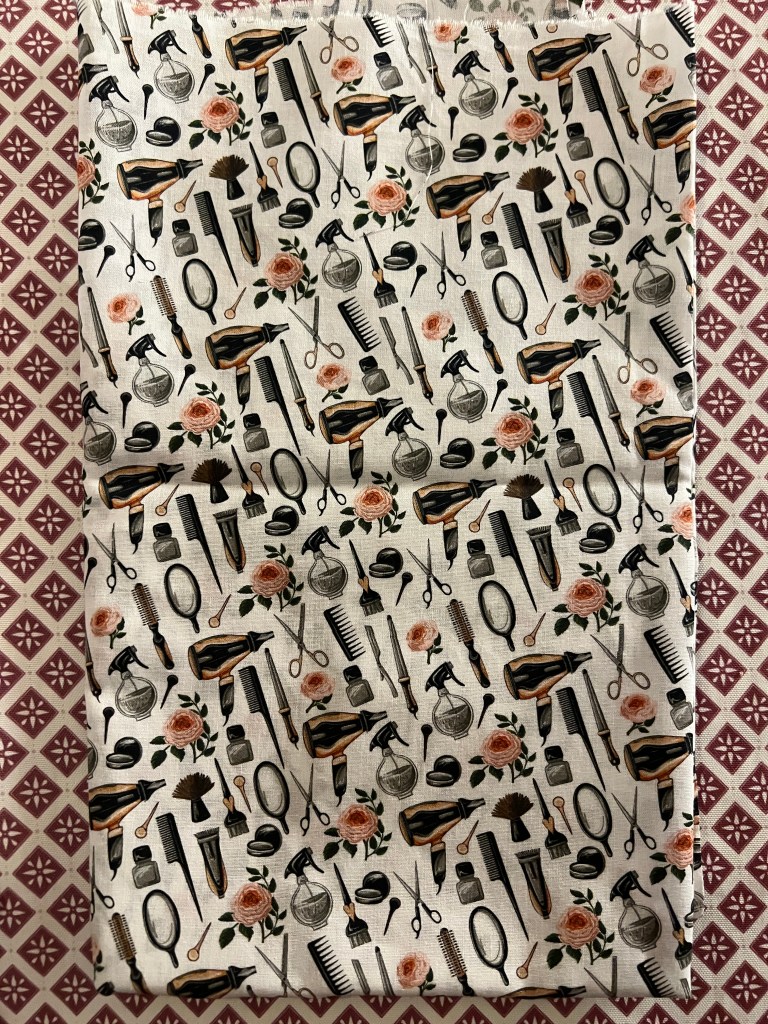 Coton popeline avec motifs d’accessoires de coiffure. J’ai trop hate de débuter mon projet pour celui-ci.