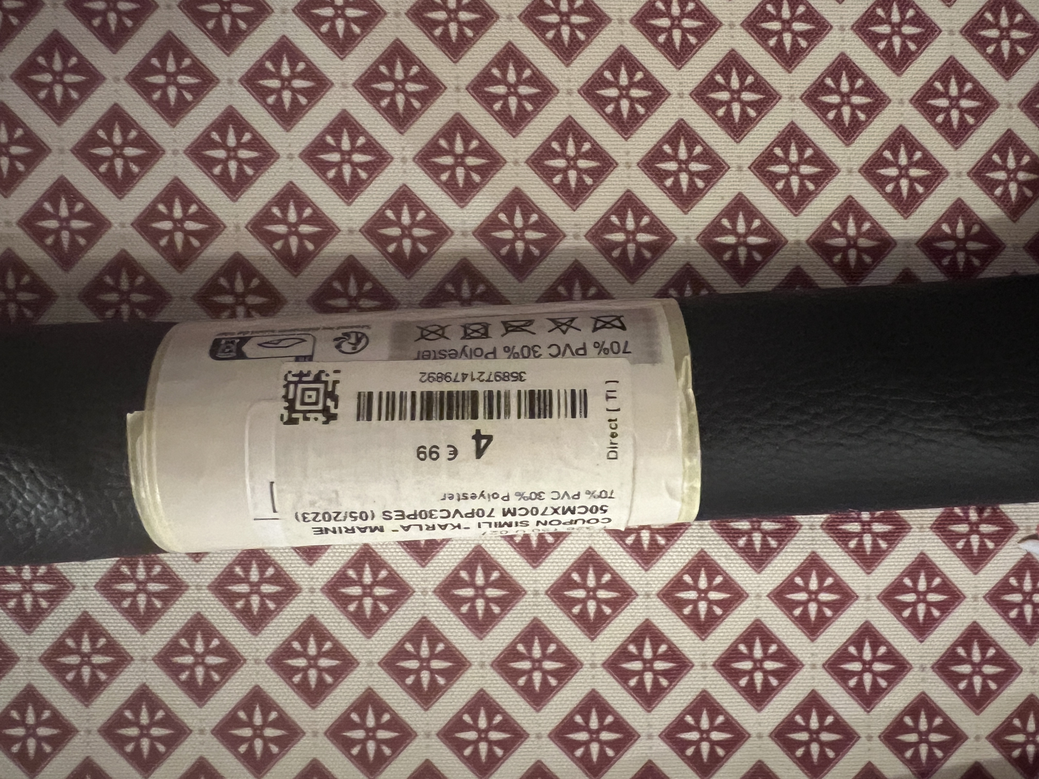 2 coupons de cuirettes souples 50 x 70 m de long 4,99 € chacun pour future trousse de toilette. À voir, si je trouve que ma machine empruntée est assez forte pour la travailler.