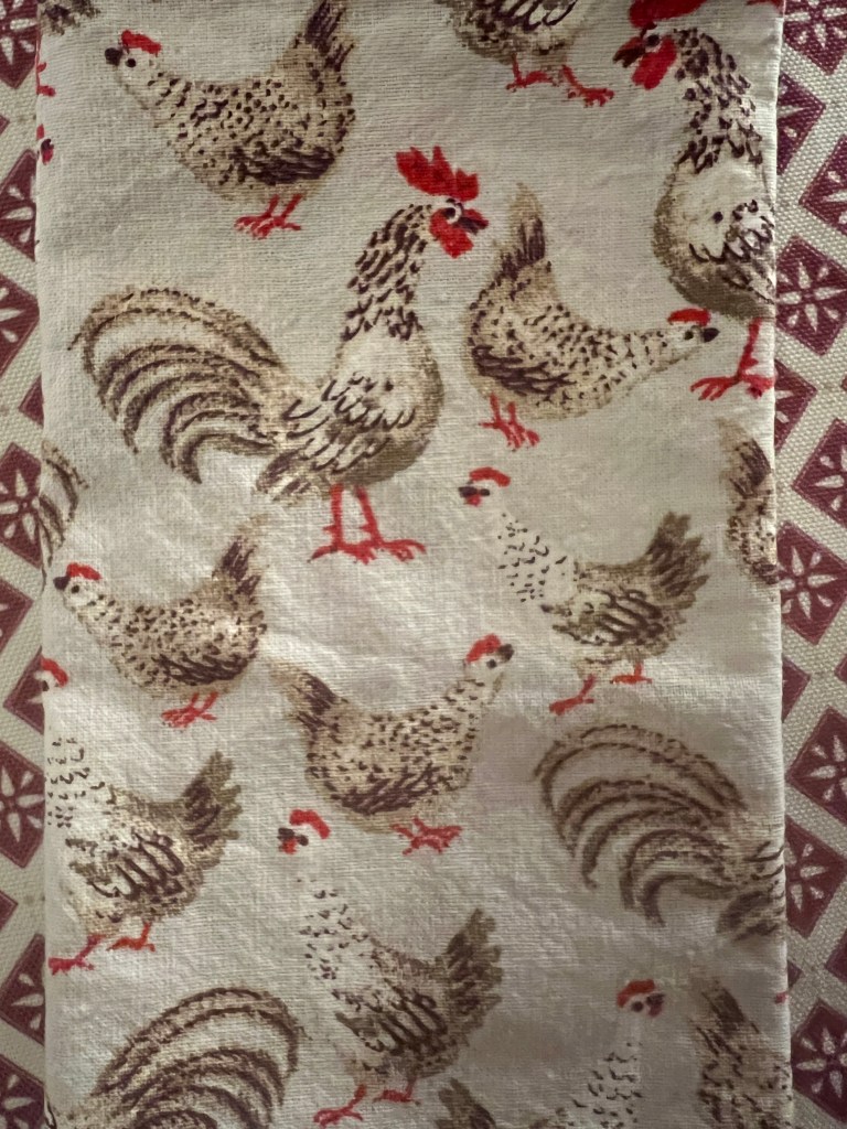 Tissus avec mignonnes poules sur un fond lin en cretonne de coton. Une auditrice me mentionne une petite précision « galinette » en provençal cela veut dire « poule »! 🐓
