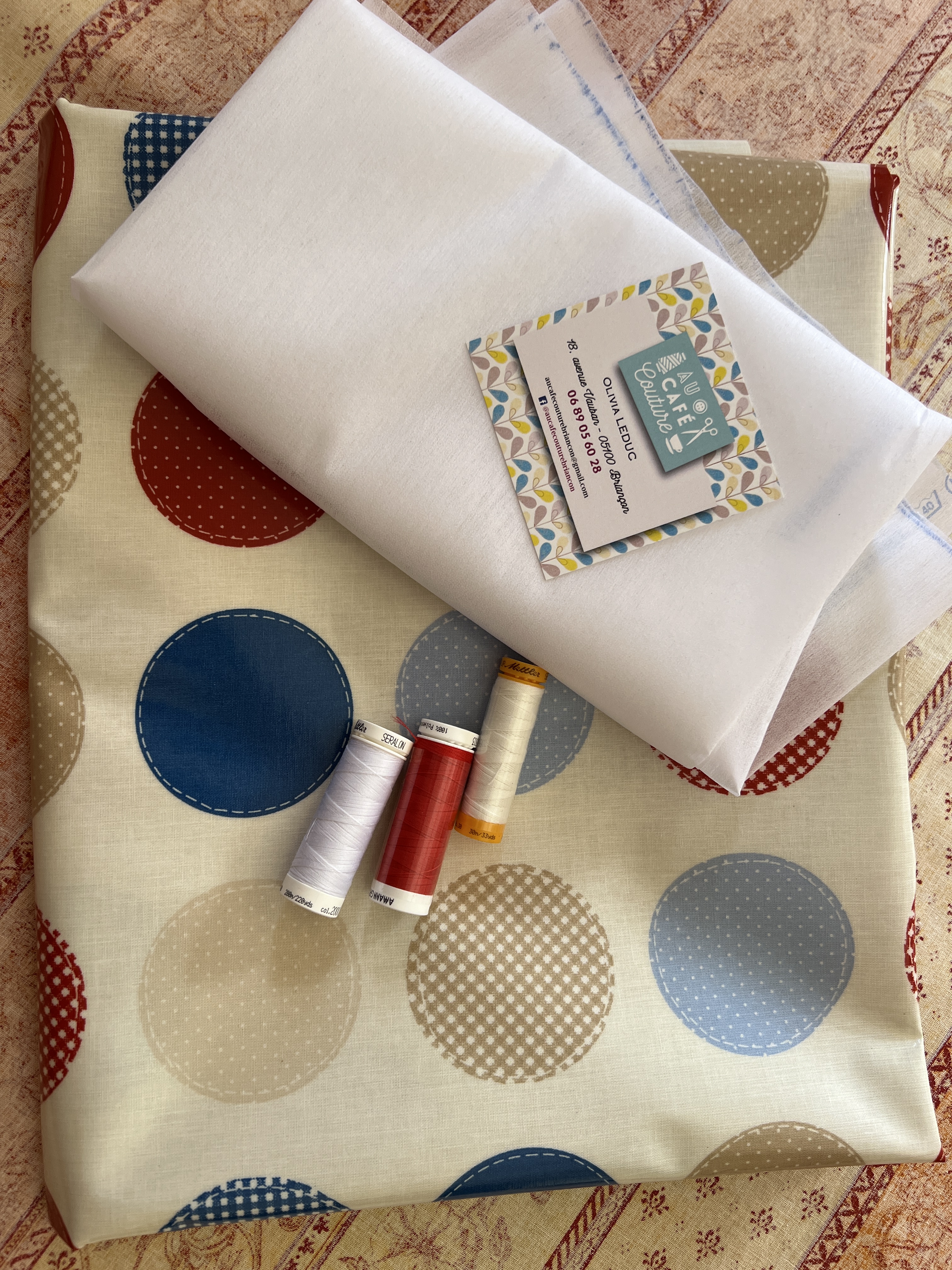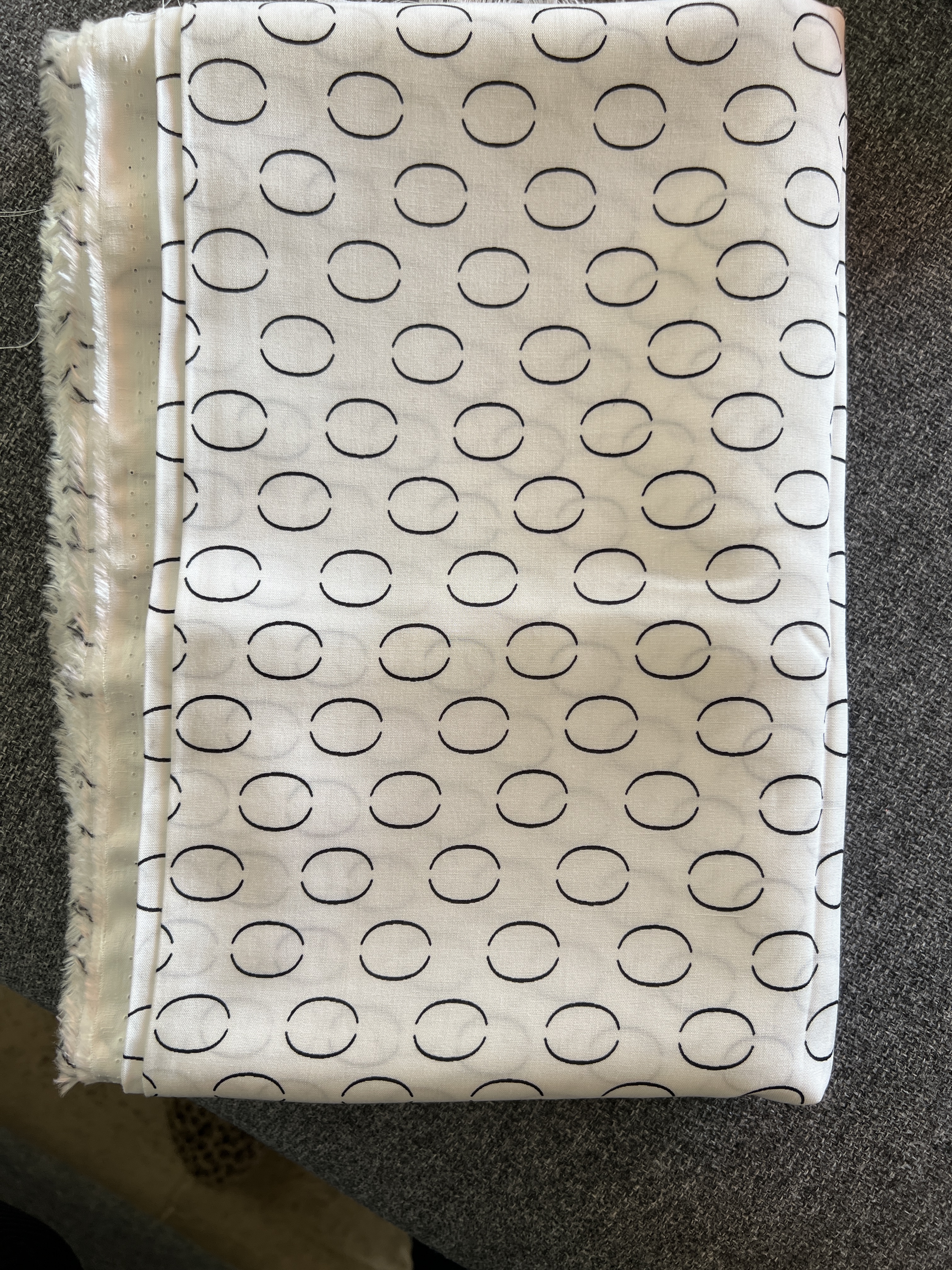 J’ai retrouvé le tissu en viscose imprimé cercle gris sur fond blanc qui ira bien avec celui à fond bleu (au centre) acheté plus tôt et avec aussi le blanc et noir à rayures jumbo plus bas! 2m/6,50€ = 13,00€