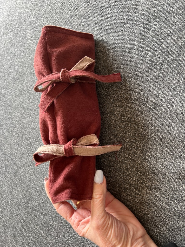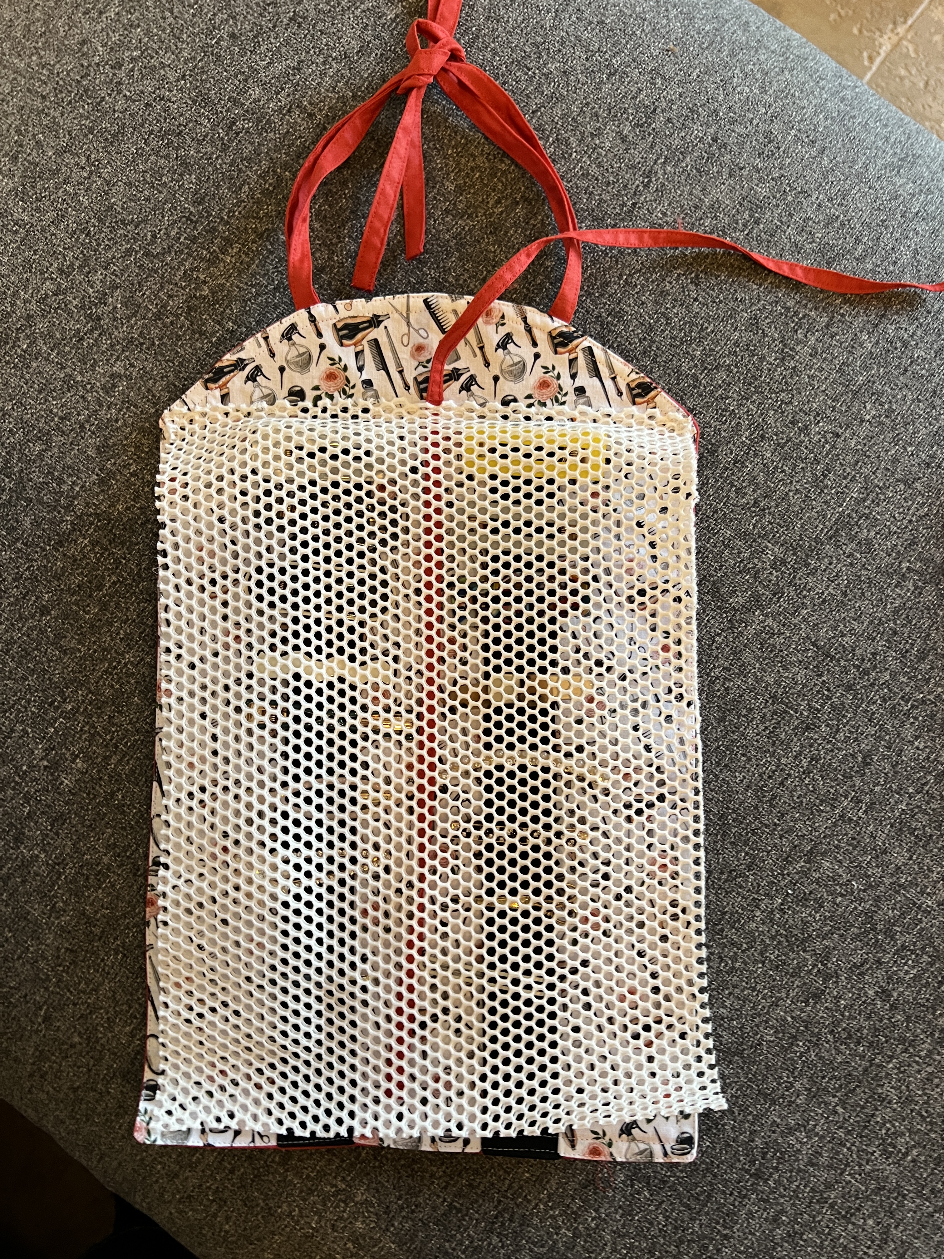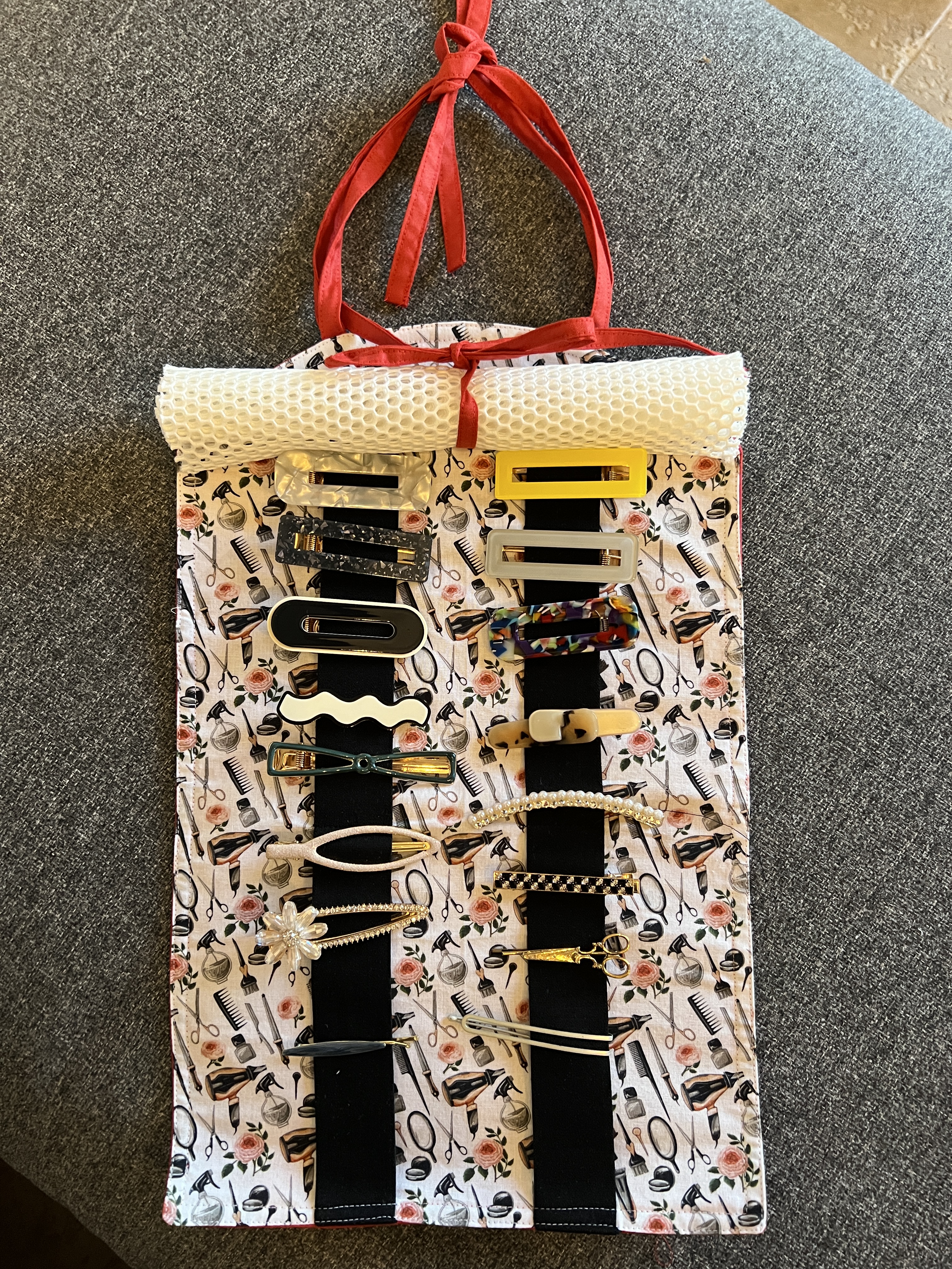 Je voulais quelque chose qui se roulent et qui se suspend dans ma garde-robe pour mieux les voir lorsque je ne suis pas en voyage. J’ai fouillé et je n’ai trouvé aucun patron existant, j’en ai donc créé une qui répondait exactement à mes besoins. Le filet en néoprène protège les barrettes avec l’effet cousinage, mais reste très léger. Elle est assez grande, qu’il me reste même assez de place pour en rajouter quelques autres ! !