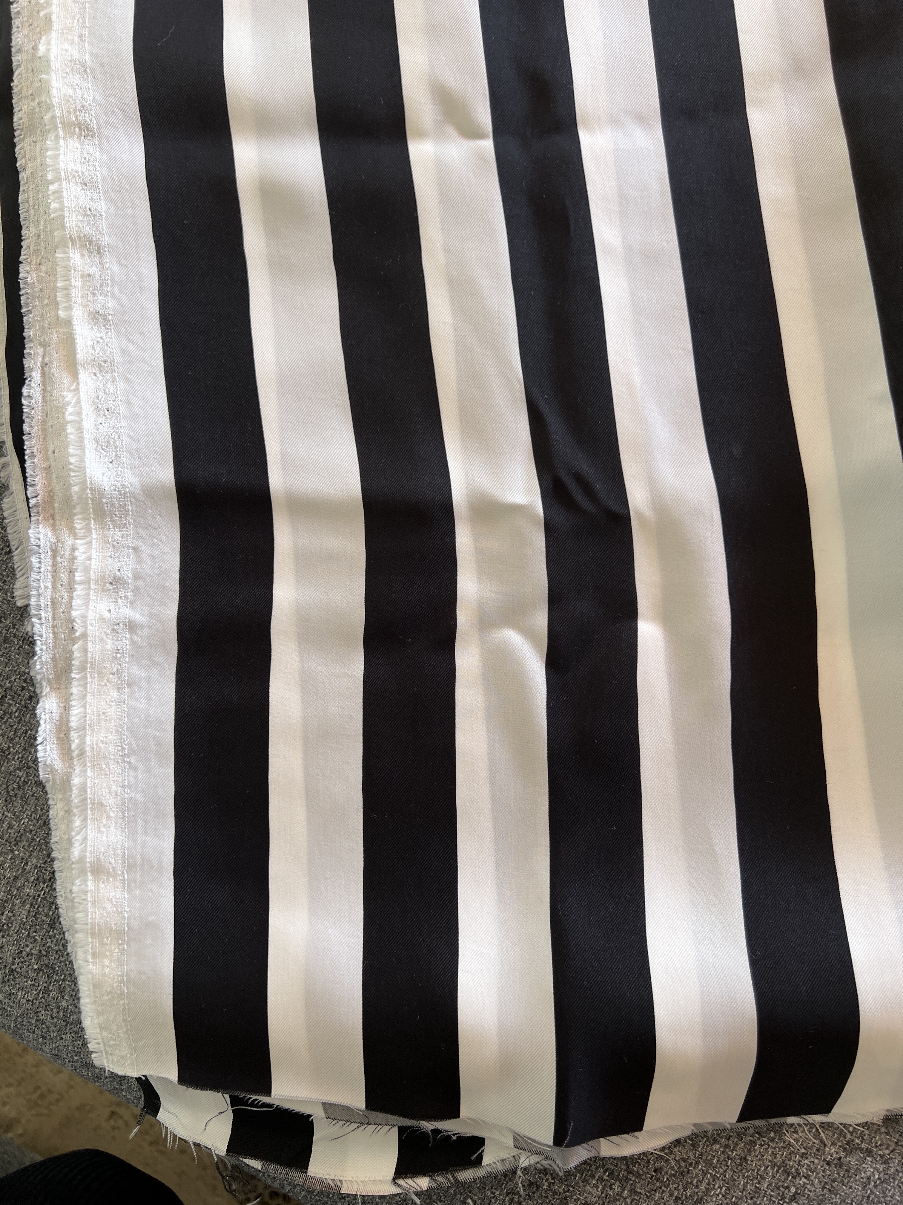 Ensuite, c’est une crêpe Cupro à grosses rayures verticales qui a attiré mon attention. Peut-être pour en faire une blouse à large manche bouffante ou un pantalon style Palazzo fluide ou simplement le pantalon Lison de Joli Lab avec des jolies poches obliques que je pourrais entièrement doubler de voiles de viscose pour plus de confort ? À suivre 😉 2,50m/7,99 = 19,98€