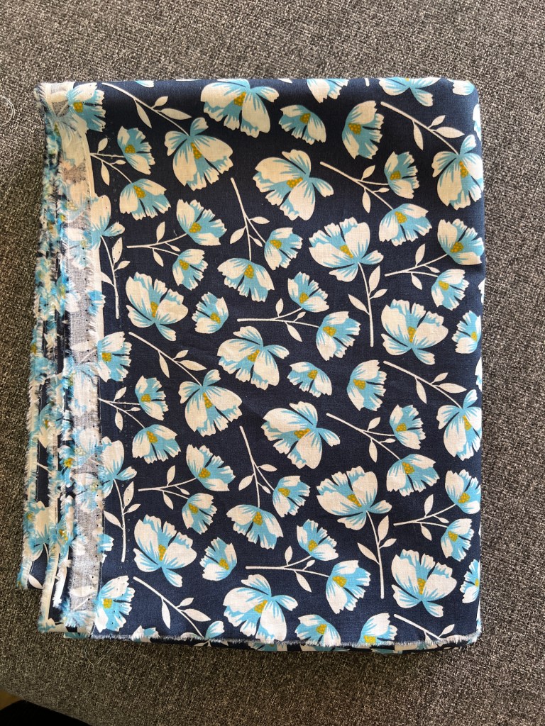 Un coton « cretonne » à fleur de Ginkgo bleu clair et gris sur fond marin. 2m J’y vois déjà une jolie jupe d’été mi-longue à très grandes poches !