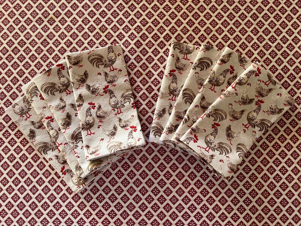 Voici ce que j’ai fait avec le tissu en lin à motif de poule très mignon que je vous ai présenté à mon premier journal créatif de voyage cette année, des jolies serviettes de table qui s’agencent si bien avec la nappe que j’ai trouvée dans notre appartement.