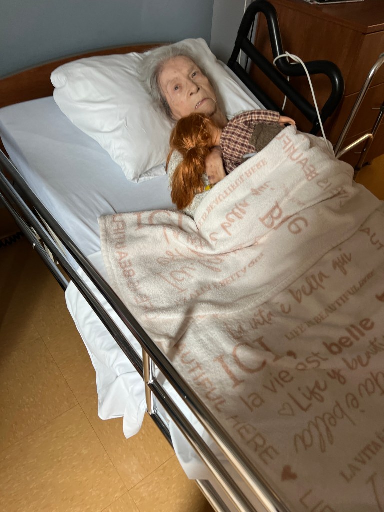En débarquant de l’avion, les services sociaux qui s’occupent de ma maman me cherchait pour m’offrir enfin sa place permanente dans une résidence où elle était sur la liste d’attente depuis 6 ans ! Ma maman fait une forme de démence Alzheimer depuis ce temps et c’était à cet endroit qu’elle désirait aller si elle perdait son autonomie. Donc, on dépose les valises et on part la déménager dans sa nouvelle demeure. Un changement qui ne va sans crainte pour une personne de 95 ans même en santé. J’ai donc passé quelques jours auprès d’elle afin de l’installer et de l’habituer à son nouvel environnement. La voici bien installé avec sa poupée. 🥰