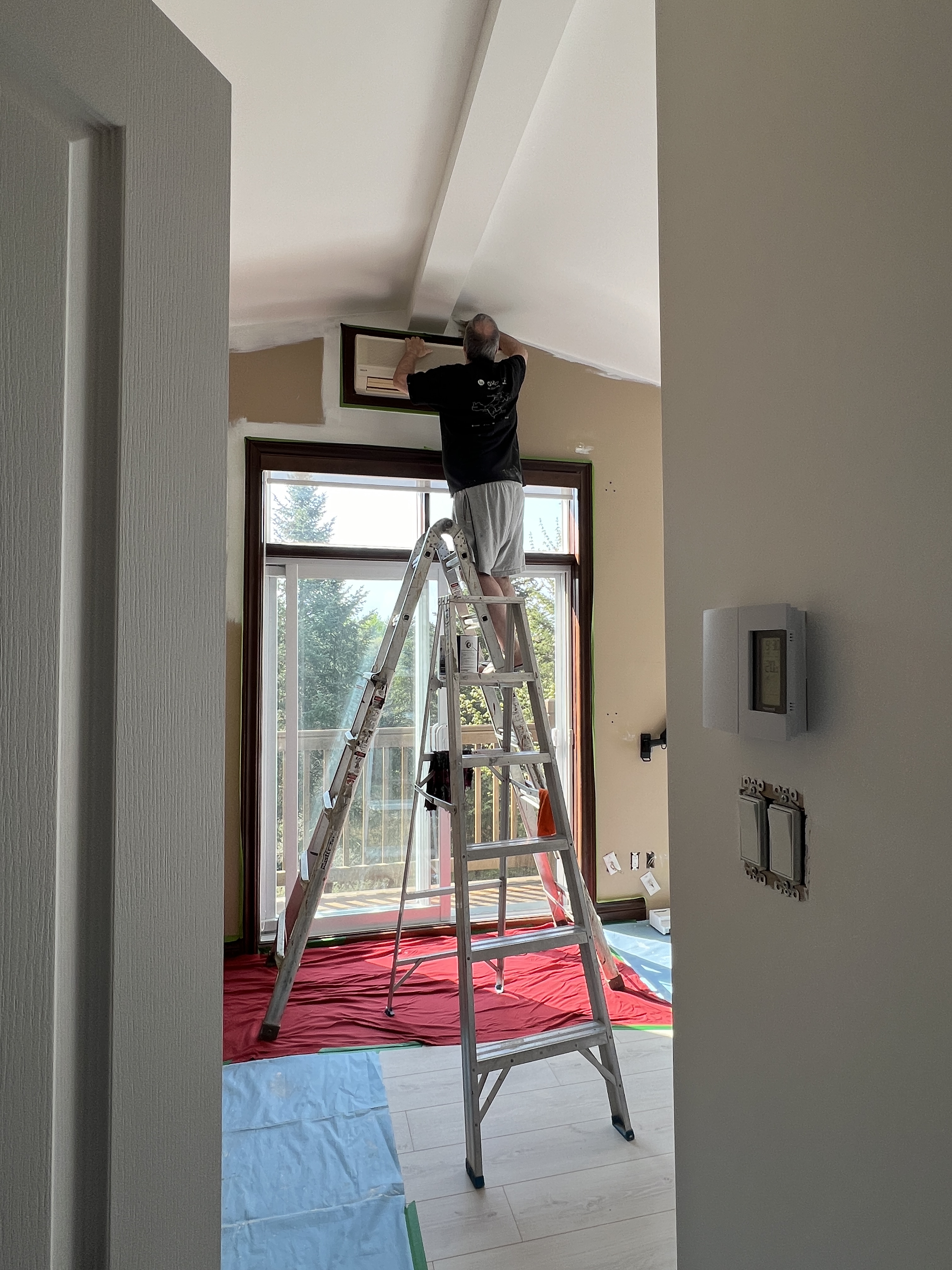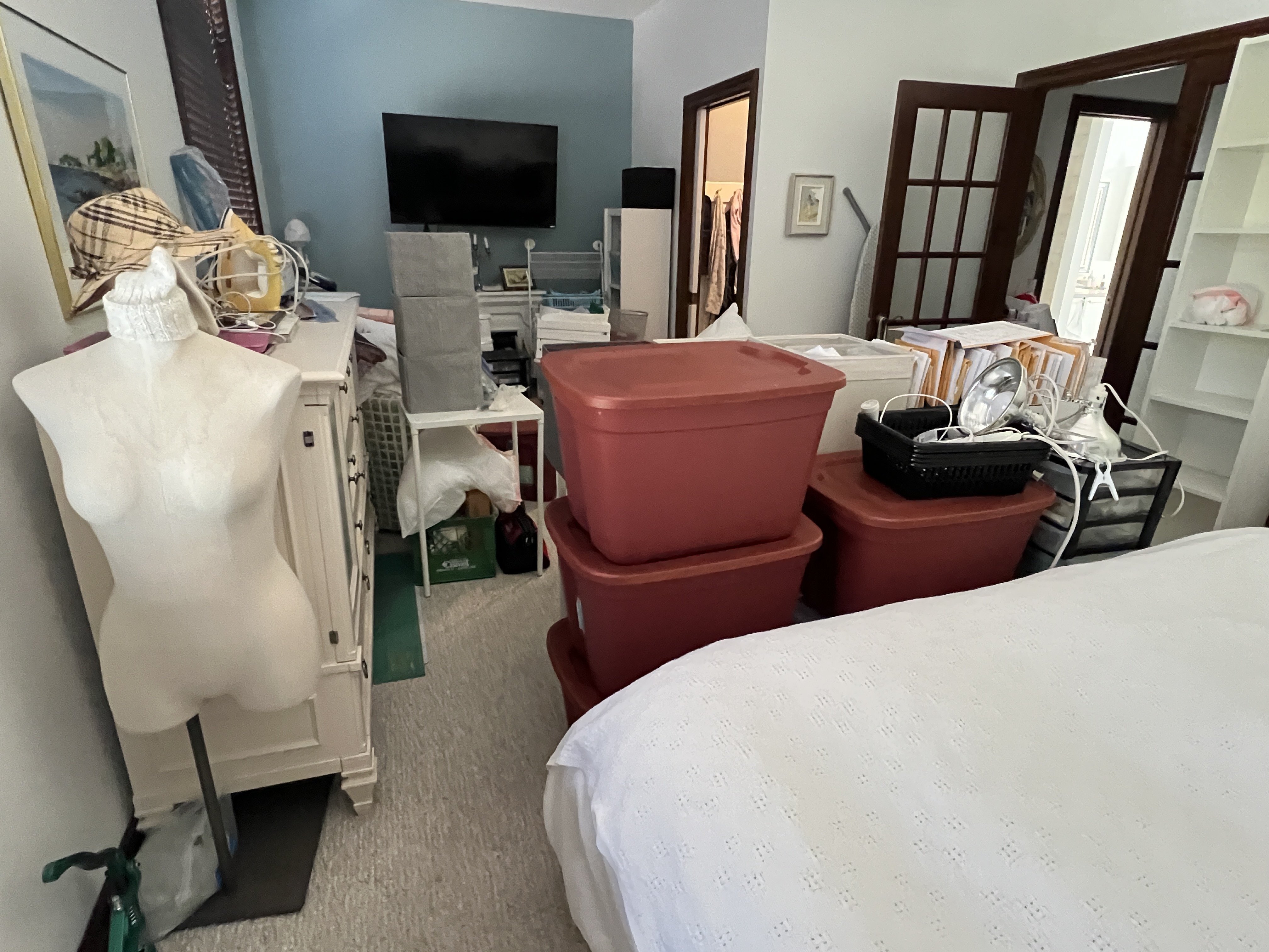 Ensuite, @alainclui, mon bel amour, m’a promis d’enlever mon tapis « trappe à aiguille » dans mon atelier et le remplacer par un revêtement de boiserie beaucoup plus sécuritaire pour nos orteils. J’ai choisi un revêtement semi-commercial assez résistant de couleur pâle qui gardera cette pièce dans les mêmes tons que l’ancien tapis. Repeindre les murs était aussi dans ses projets. Donc, il a fallu vider toute la pièce ! Et tout mon bazar fut transféré dans le petit corridor et dans notre chambre à coucher!