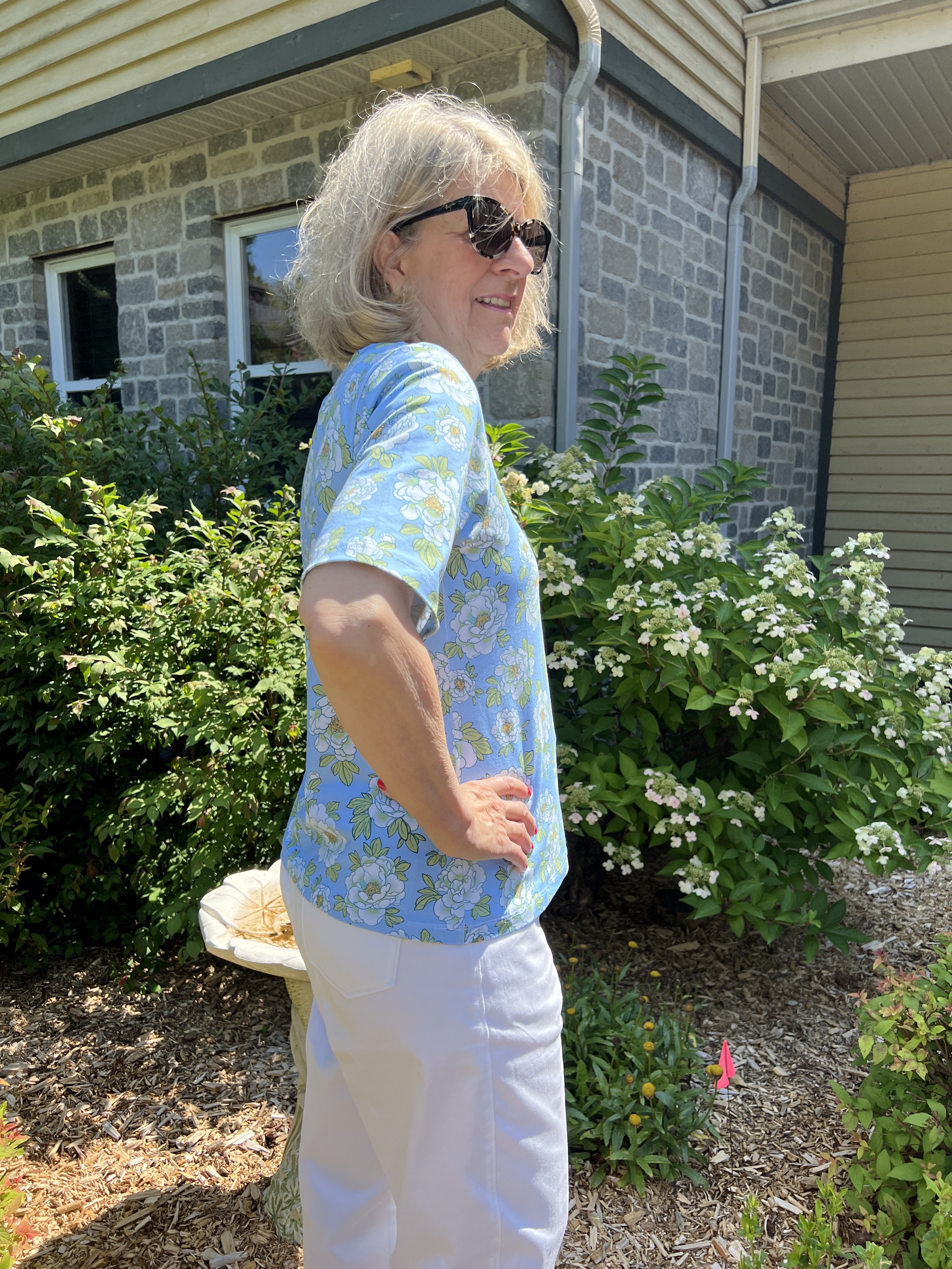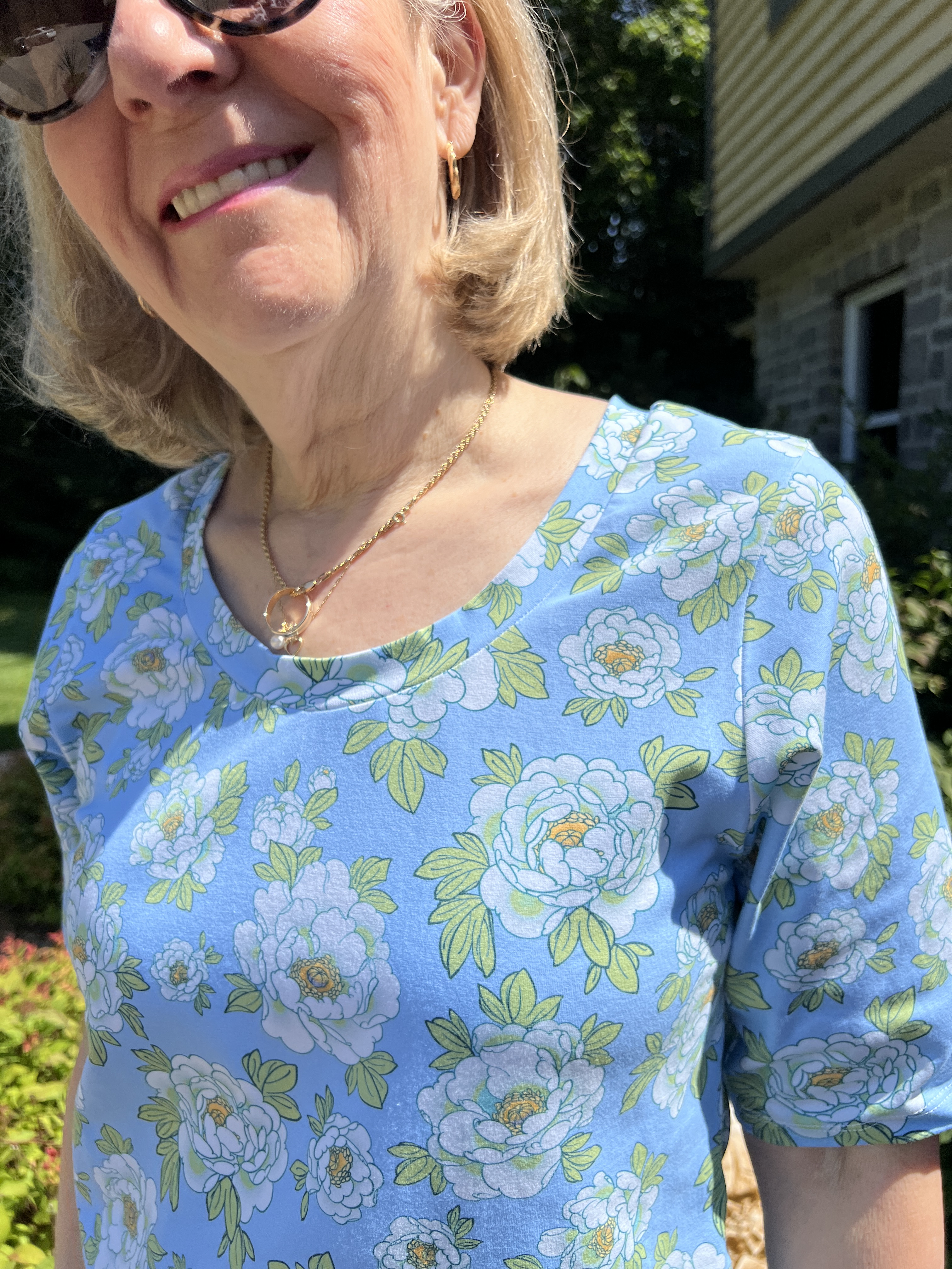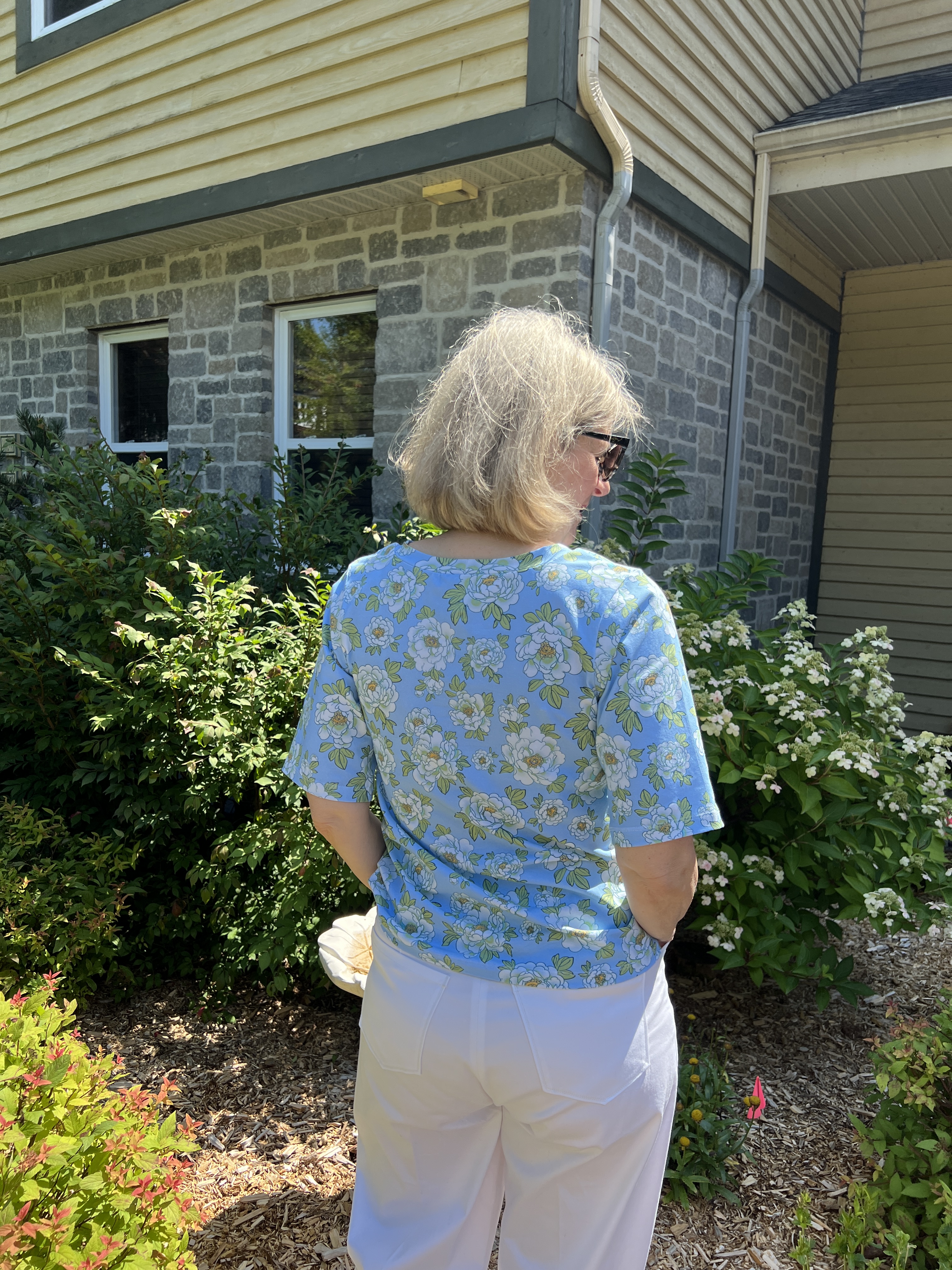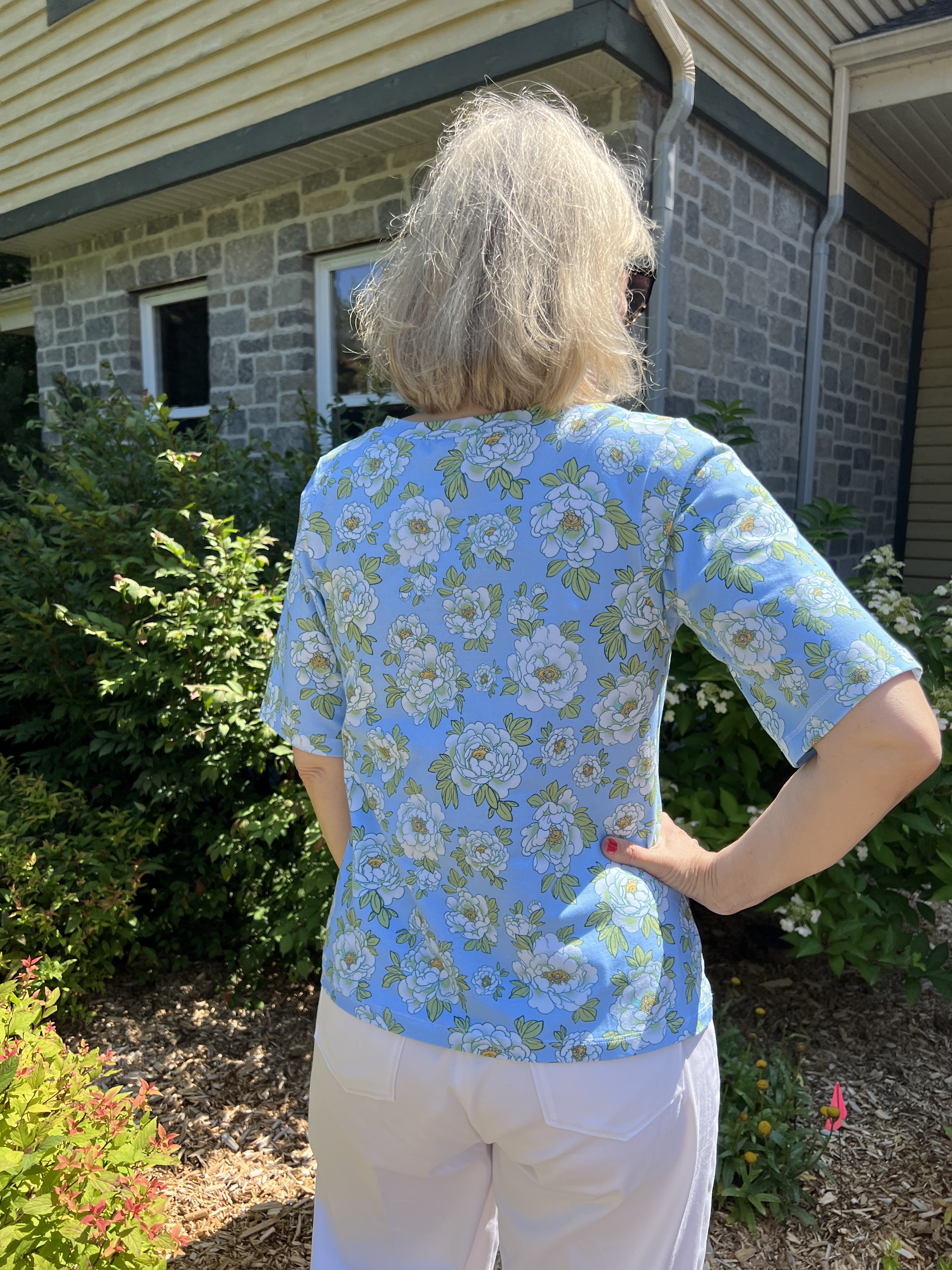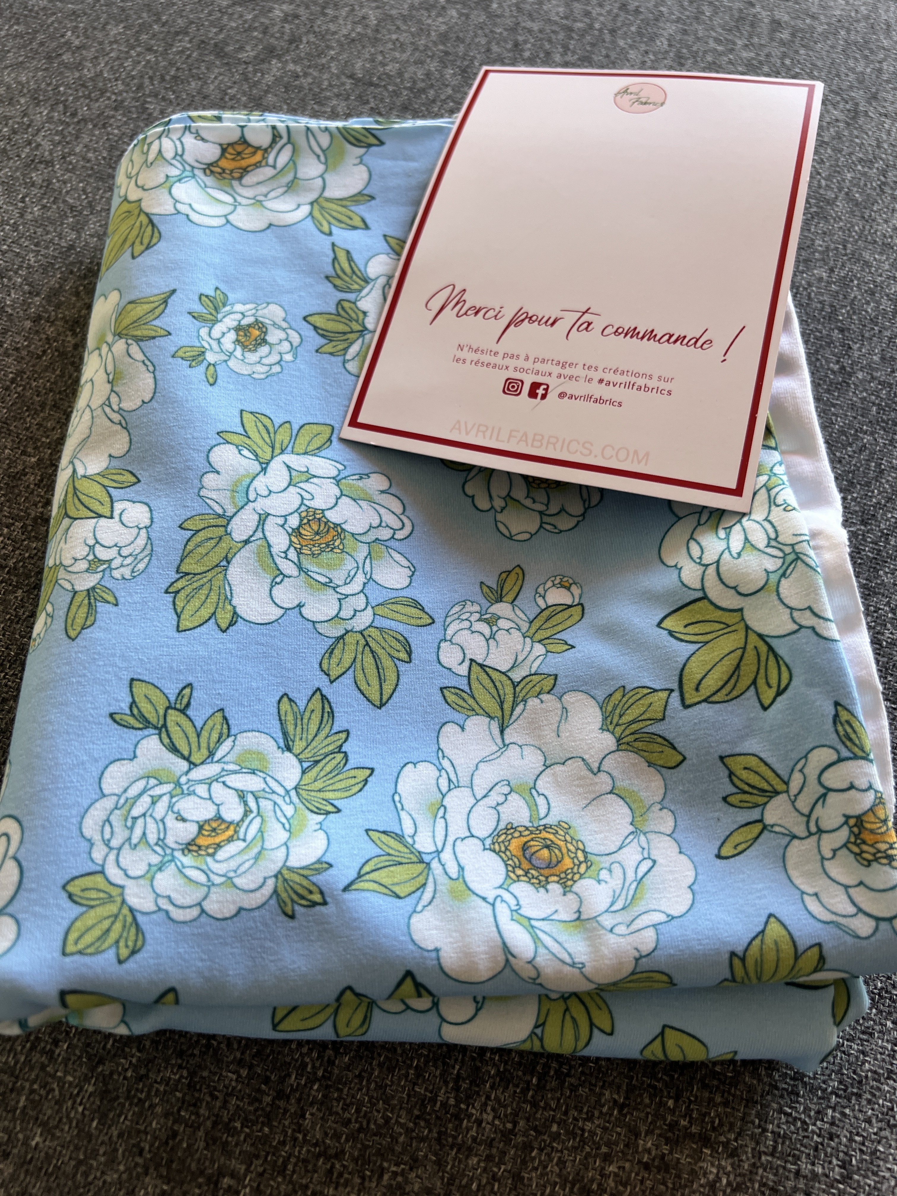 Le 2e t-shirt entra aisément avec ses manches courtes dans mon joli mètre de tissu fleuri motif aux sublimes pivoines de Jersey coton TOMI bleu BB, acheté à Avril La Rouge à son kiosque @avrilfabrics au Salon @tendancescreatives de #Montpellier, #tendancescreativesmontpellier. J’adore ces belles Fleurs blanches sur ce bleu lumineux et de grande qualitée.