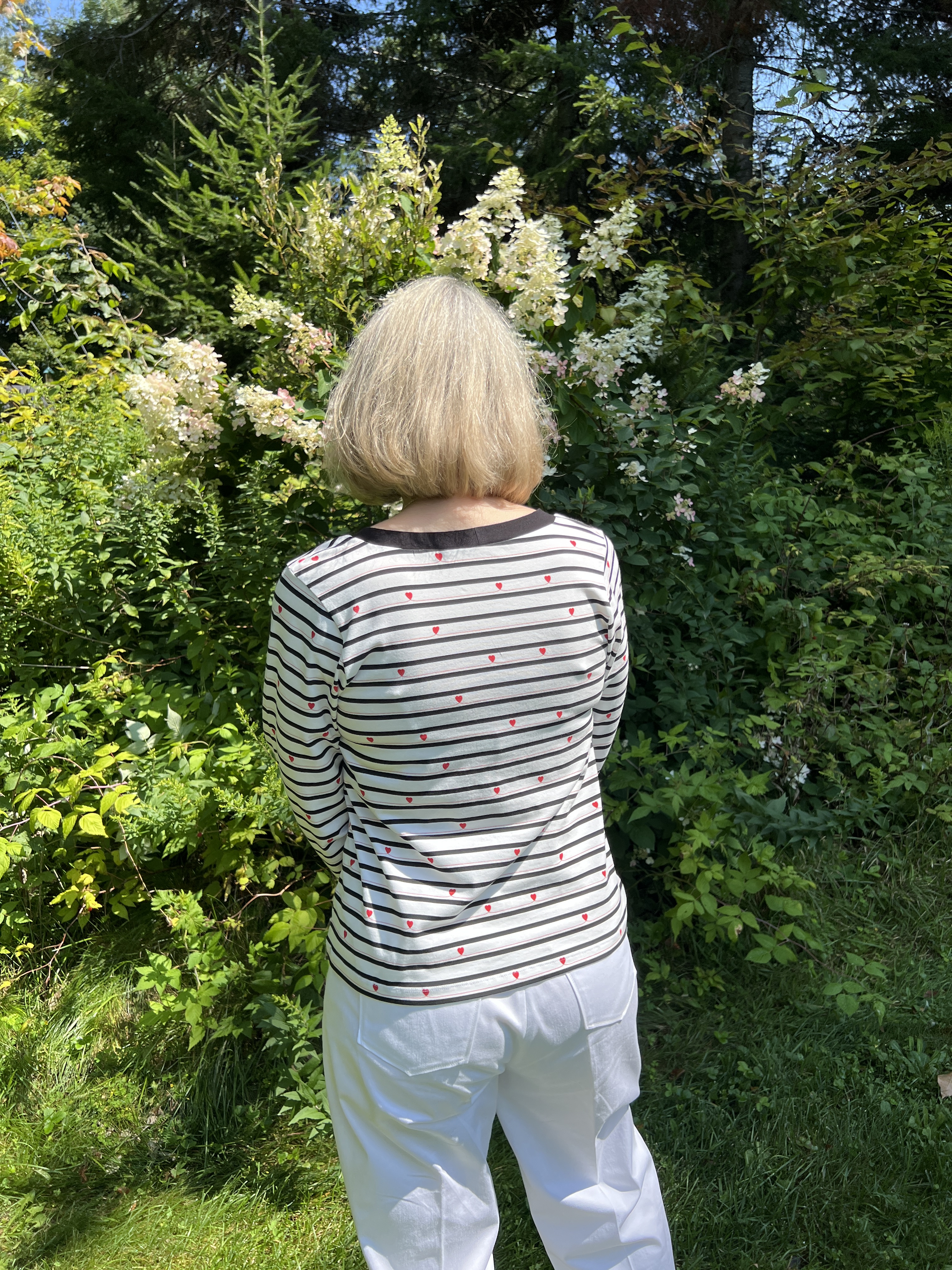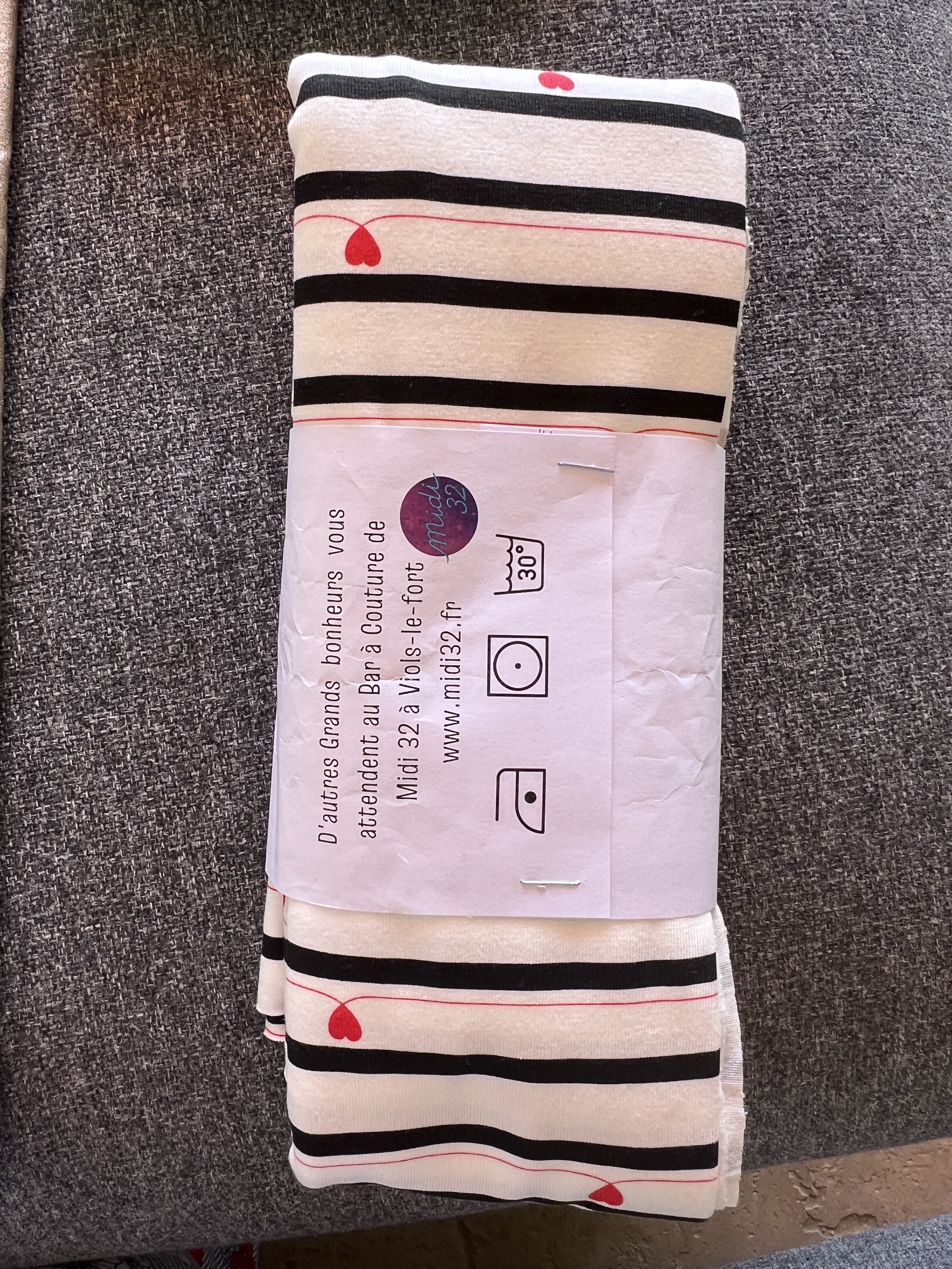 J’ai ai fait un avec des manches longues mais il me manquait 20 cm à mon mètre acheté chez @midi32_bar_a_couture suite à la coupe dans mon coupons (un tissu pourtant rayé et si mal coupé? 🙁 ) dont j’ai dû la faire en 2 morceaux et ainsi mettre une bande de poignets pour la rallonger et faire ensuite la bande d’encolure en couleur contrastante noire. Je le trouve tout de même très joli ainsi, heureusement.