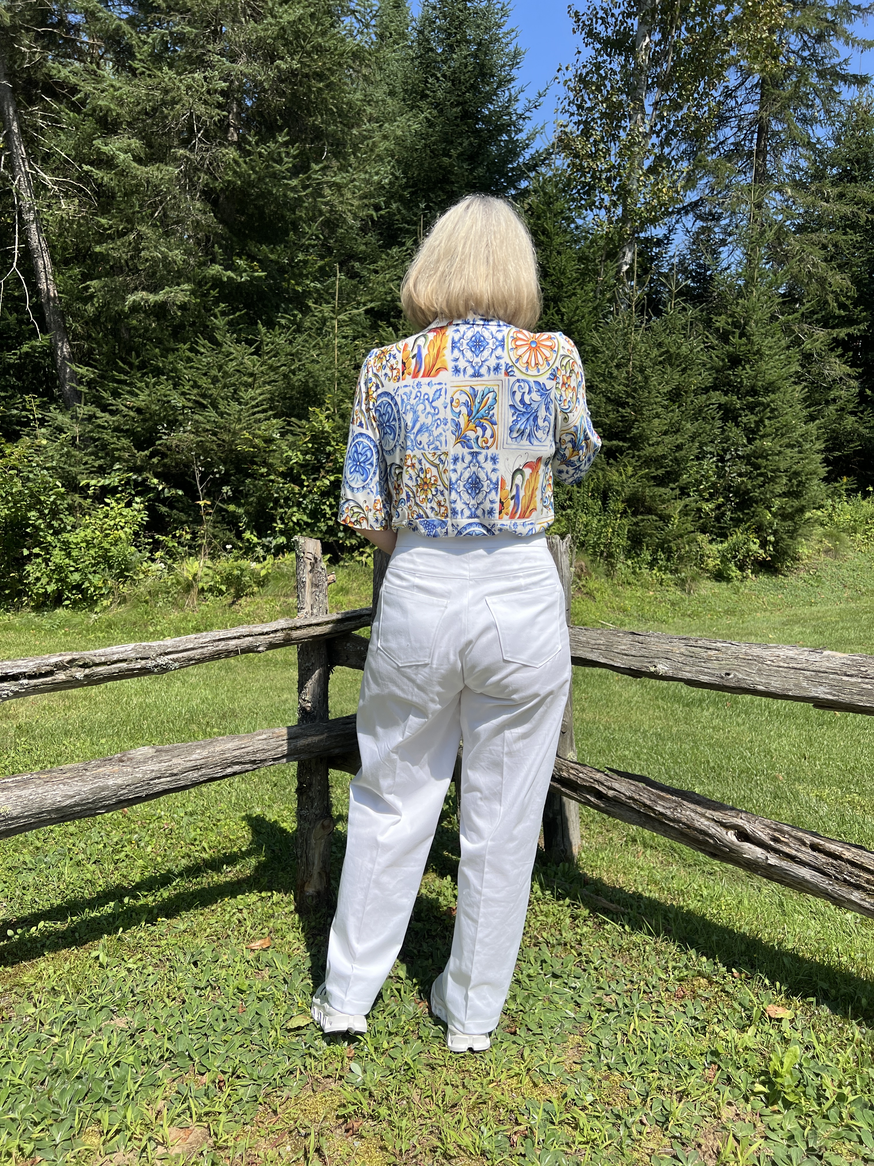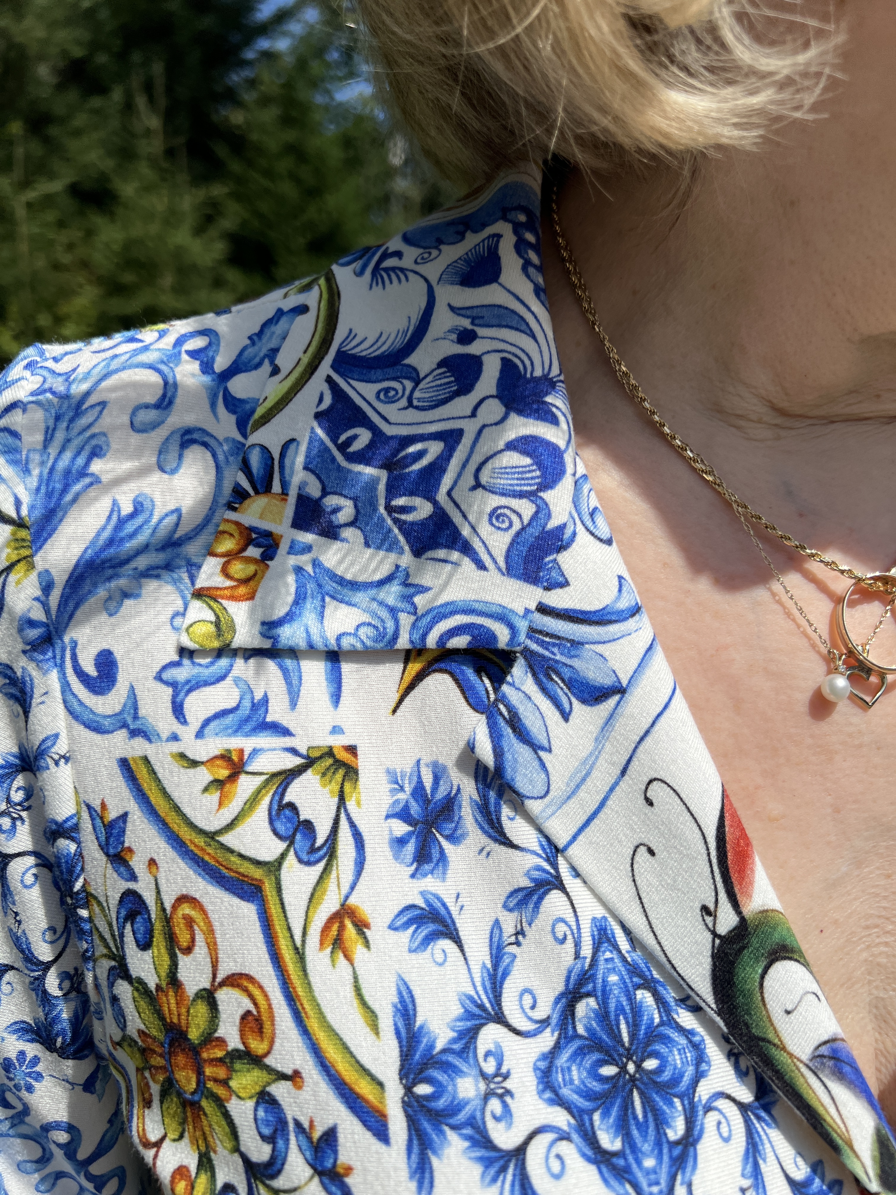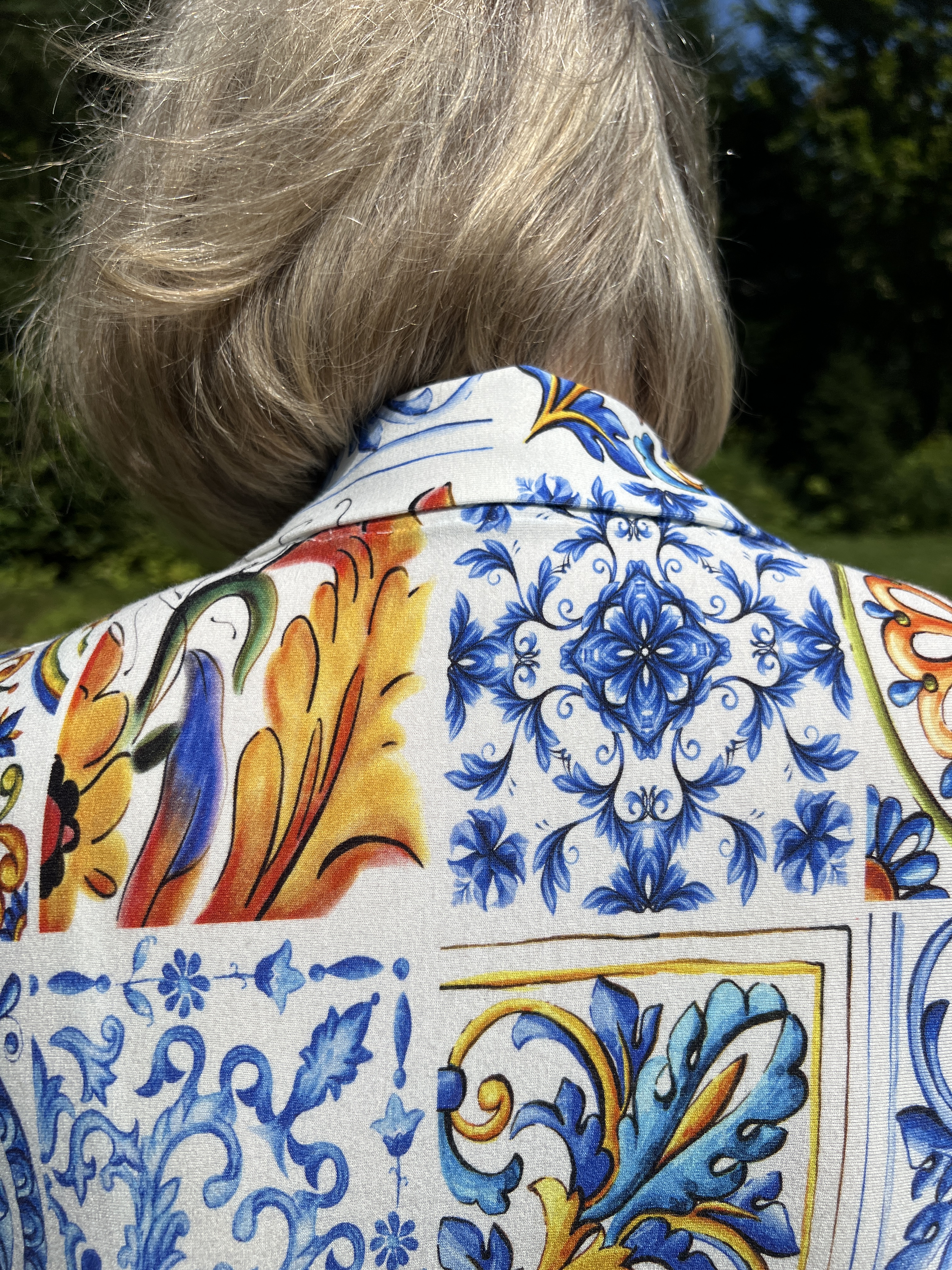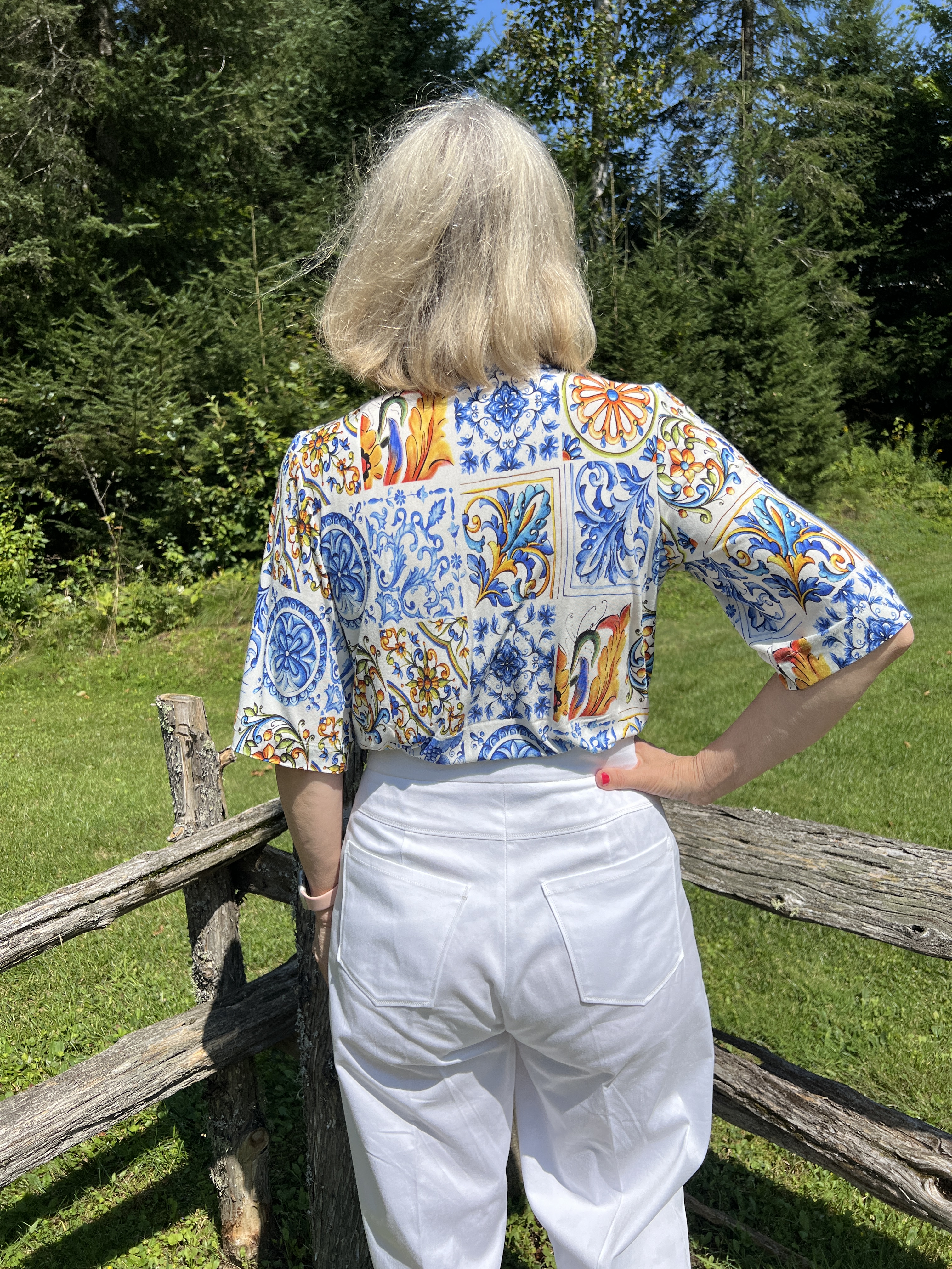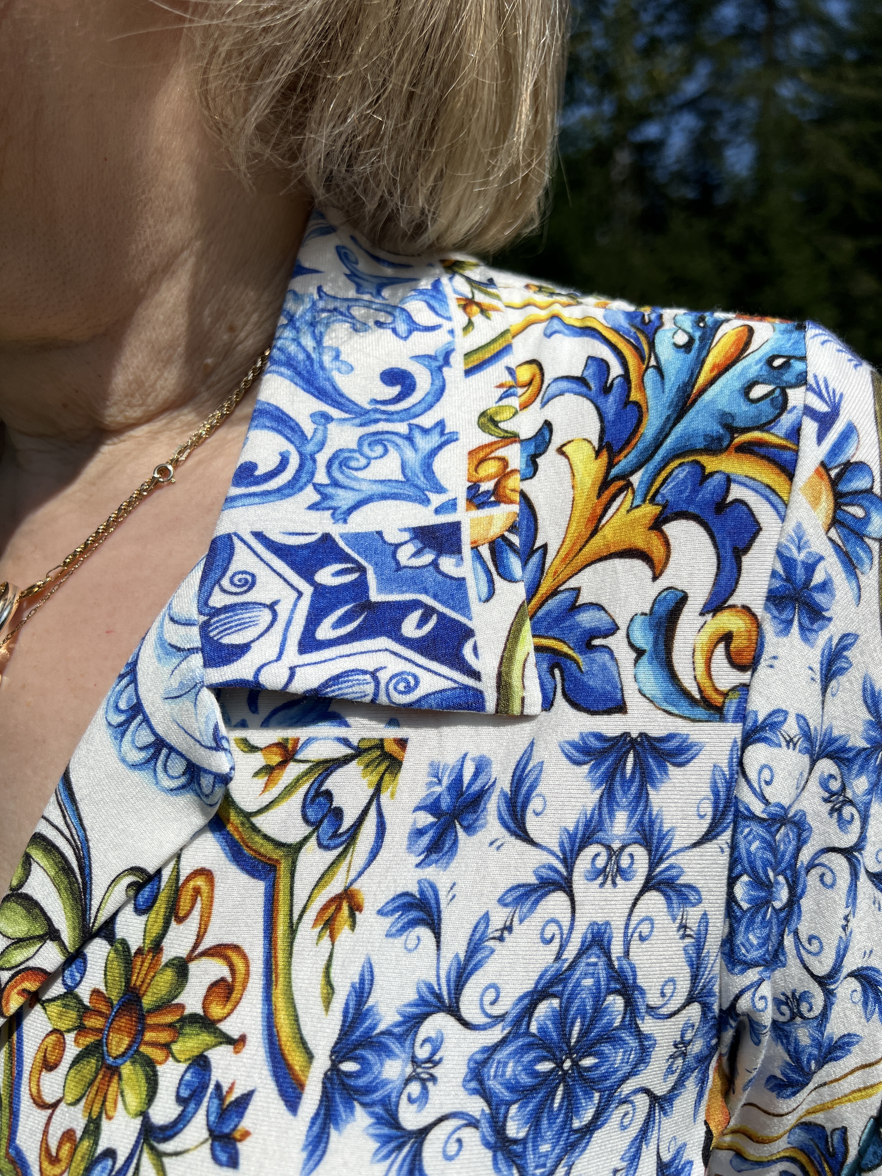 La toile du Chemisier le Stretchy concluante, j’ai immédiatement taillé dans ce tissu acheté à Rome l’an dernier. Aman grande surprise, ce tissu aussi n’avait pas la mesure prévue. Il y a un échantillon de 10 cm par 30 cm qui fut pris en bordure de la lisière et j’ai reçu un morceau qui devait être de 150 cm de large à un peu moins de 90 cm, j’ai retrouvé ma facture et des photos lors de la coupe et je me demande comment il fut coupé. Donc, pour m’en sortir j’ai coupé en contre-sens de la lisière et heureusement, c’est plus joli ainsi. J’ai réussi à faire une manche 3/4 comme je le désirais et les motifs de carreaux de céramique italien arrivent bien aux endroits voulus. J’ai bien entoilé toute la partie parementure cette fois-ci, au lieu de juste une bande de 2 cm le long de la pliure comme préconisait les instructions. Le col châle se tient mieux ainsi dans ce tissu de viscose si fluide et glissant comme celui-ci.