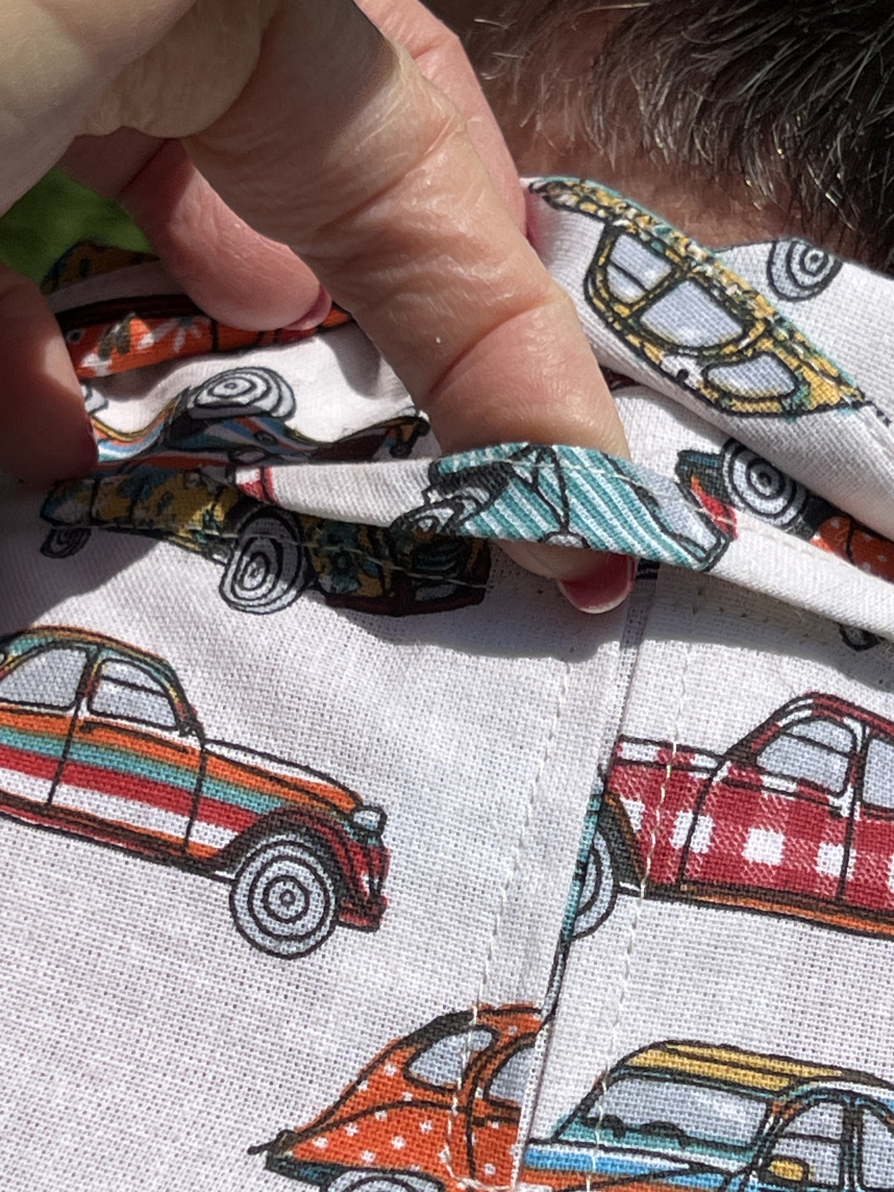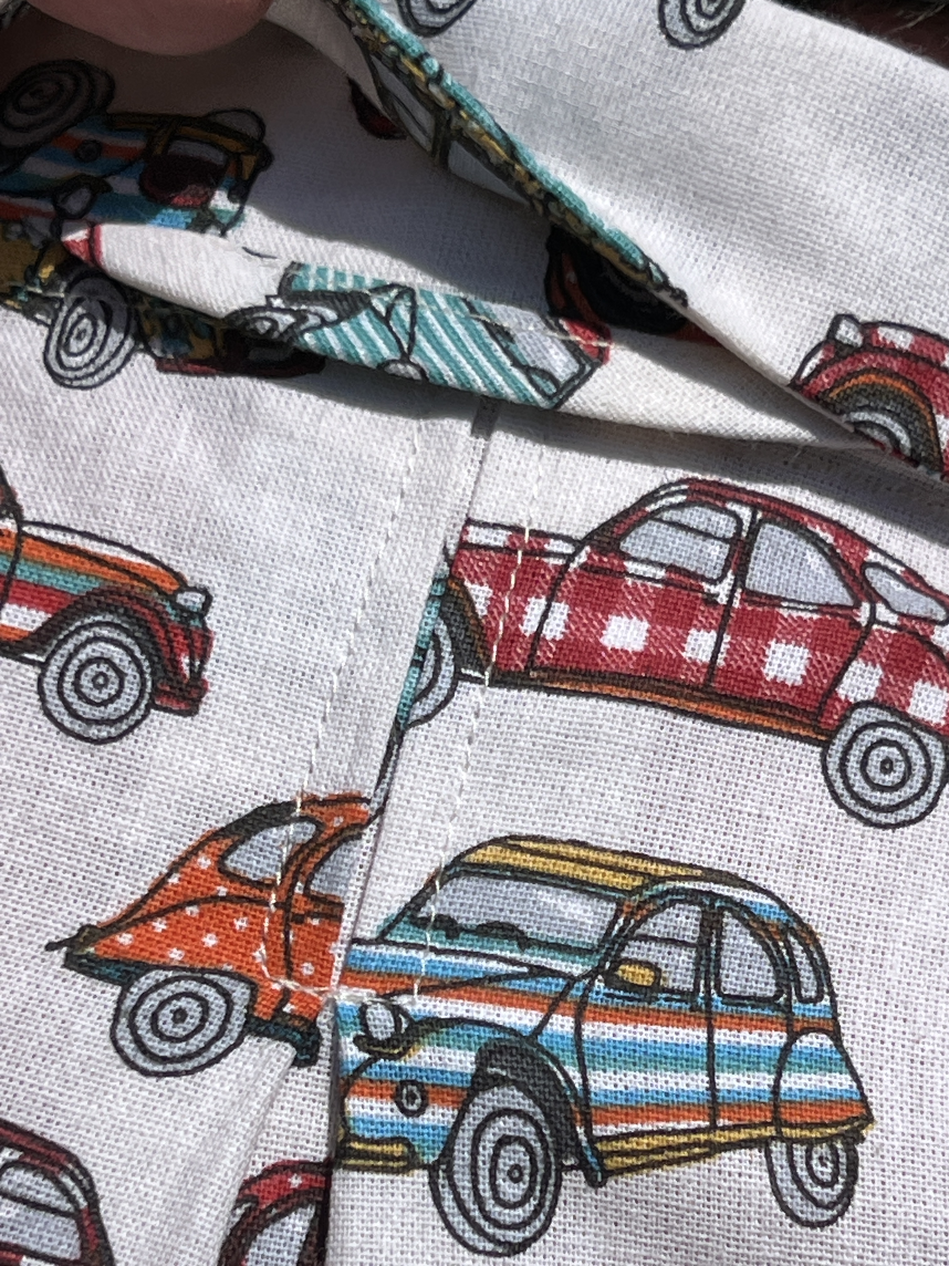 J’ai fait encore un pli creux au dos de 4 cm et rajouté une attache au bas du col arrière qui finalement ne paraît pas trop !🙄🙃😂 Mais, elle rend unique cette chemisette d’été qu’il aime déjà beaucoup!! Ce patron avec mes légères modifications (rallonger les manches, l’ourlet et élargir de 1cm vis à vis la taille) est une pépite pour lui, et il m’en redemande d’autres. À suivre!