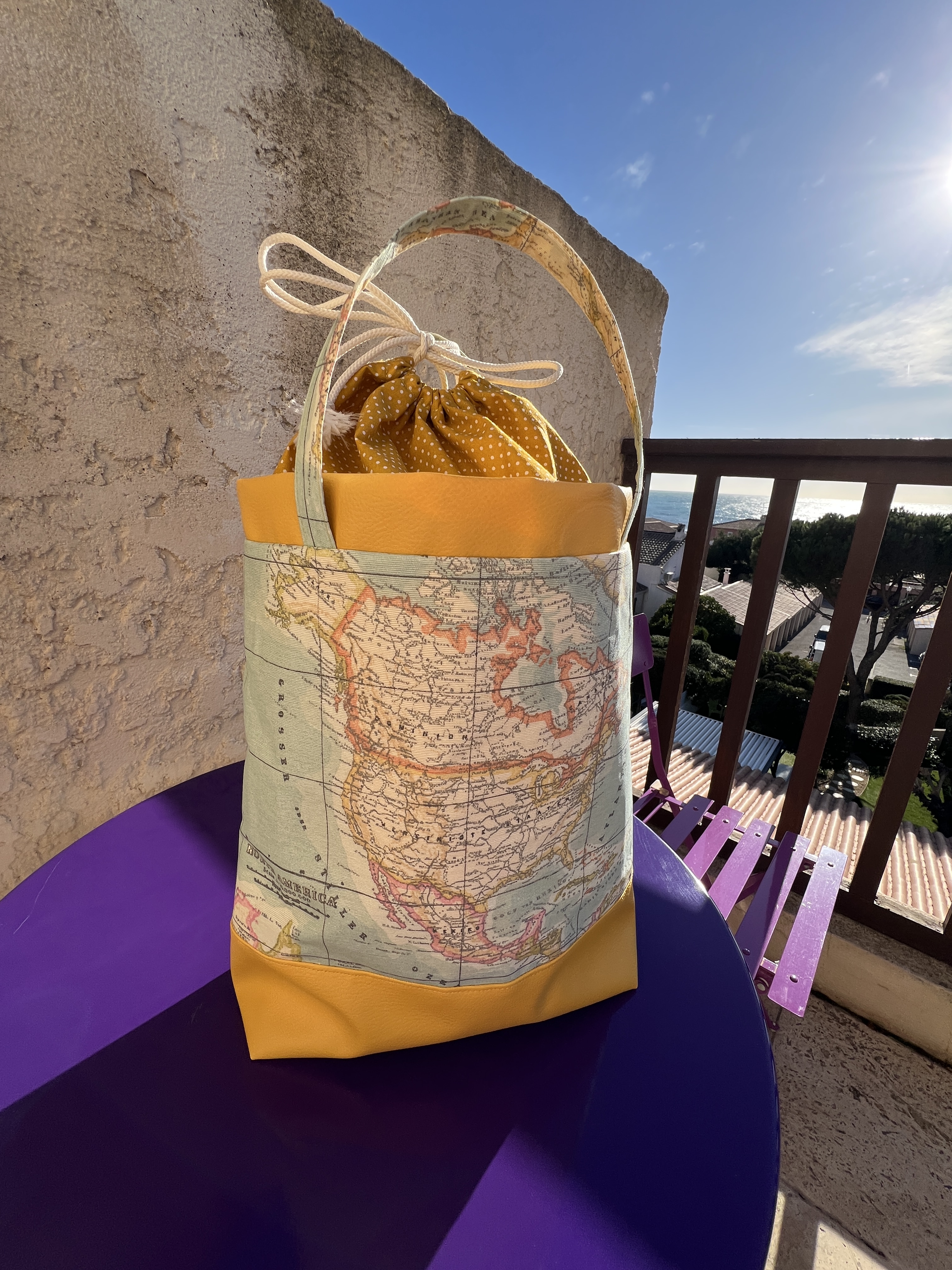 Au CSF, j’ai trouvé un coton enduit avec un dessin de mappemonde chez Histoires de Filles d’Aigues-Mortes. Quand je l’ai vu, j’ai tout de suite vu qu’il me ferait un beau souvenir de mes voyages! #Tissuenduit #tissuvoyage #mappemonde. En fait, ce sac pourrait même servir à tout autre sorte de rangement d’articles de voyage.