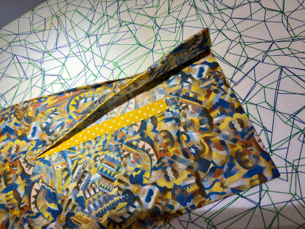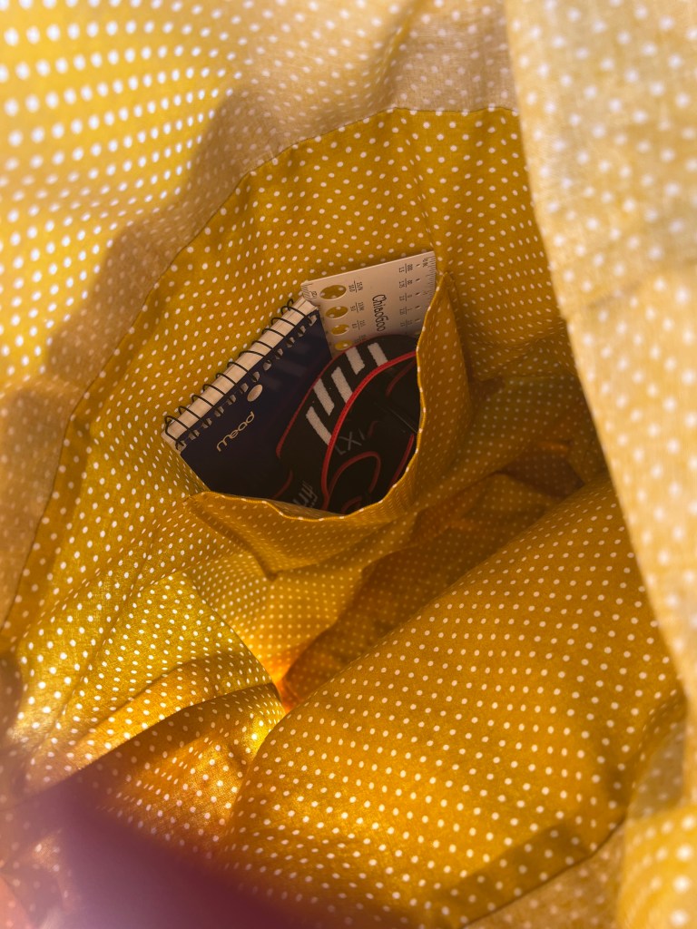 J’ai aussi fait la petite pochette intérieure, ce patron est très complet! Ma doublure est un simple coton jaune à courte-pointe à mini pois trop mignonne.