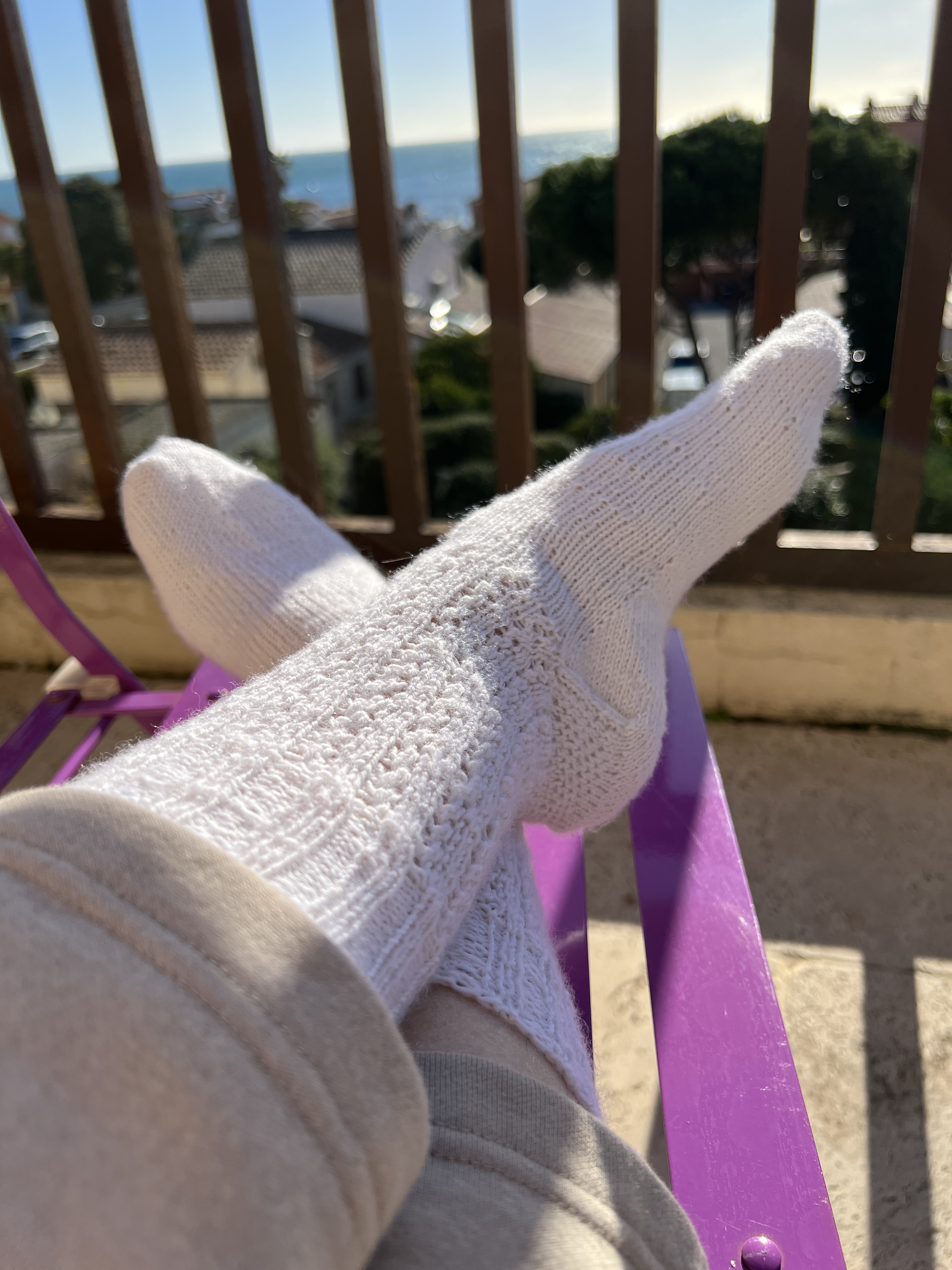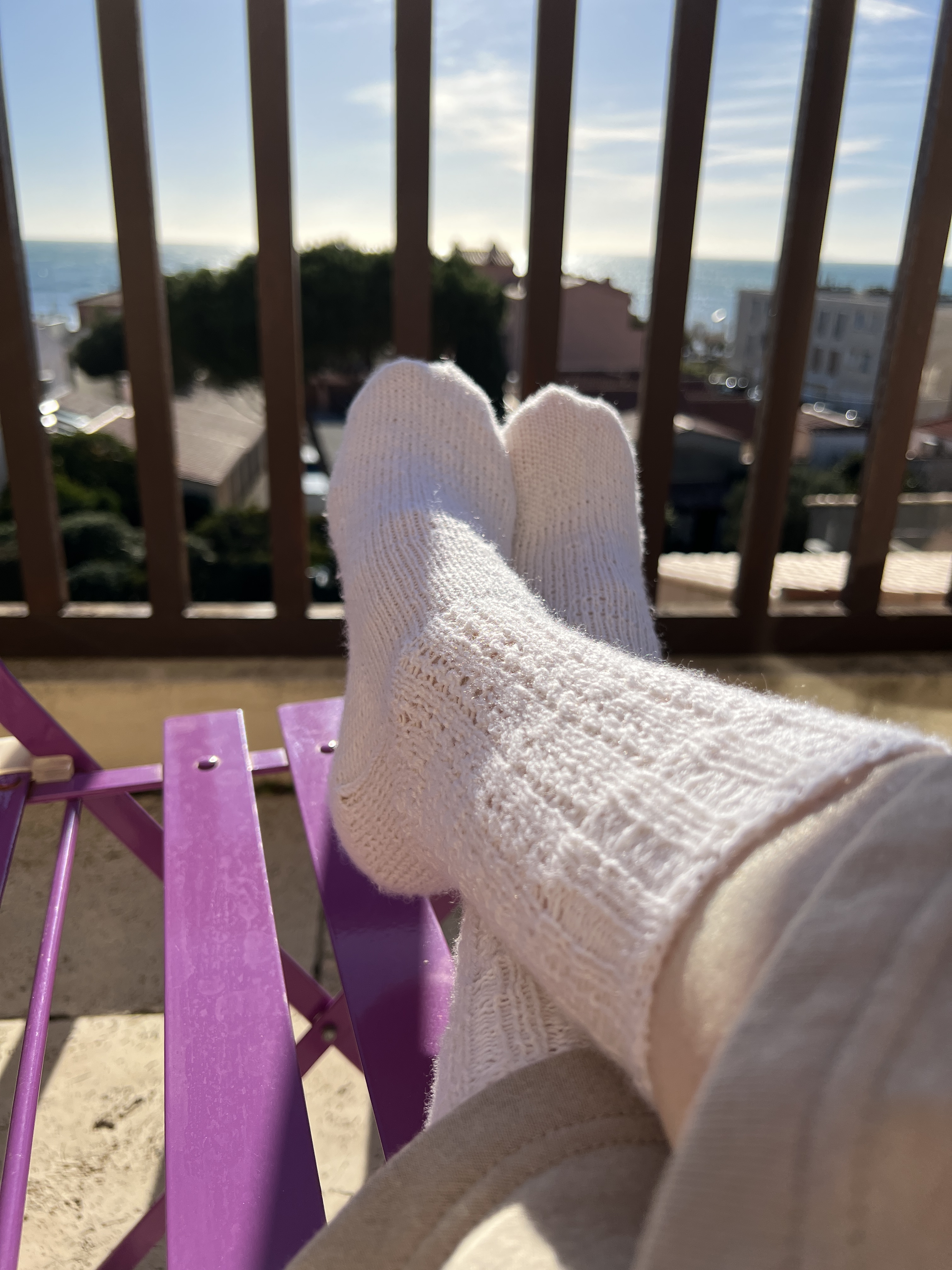 Je dois remettre un encours de bas sur mes aiguilles, j’ai apporté avec moi une des écheveaux de laine de Mérinos offerte par ma fille pour ma fête. À suivre!