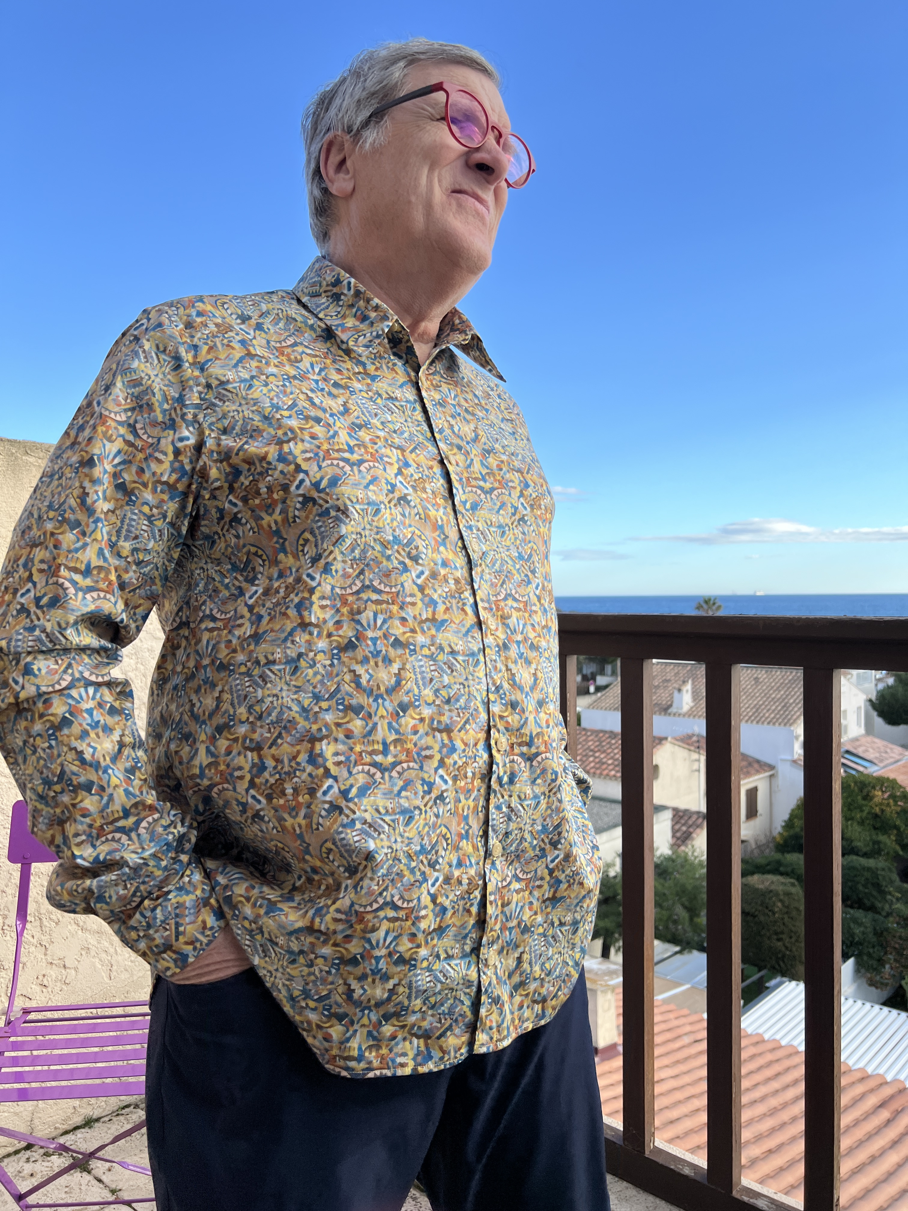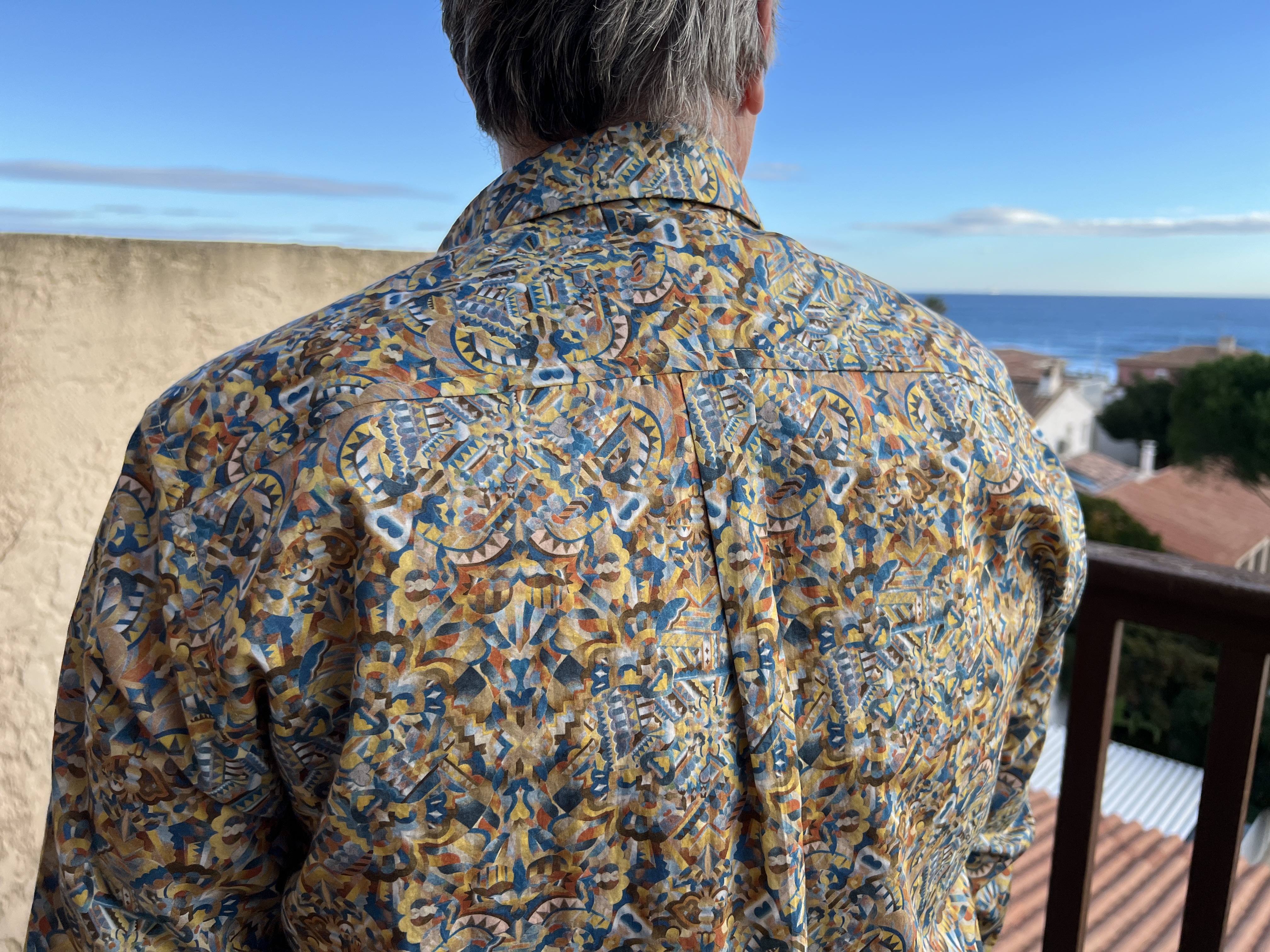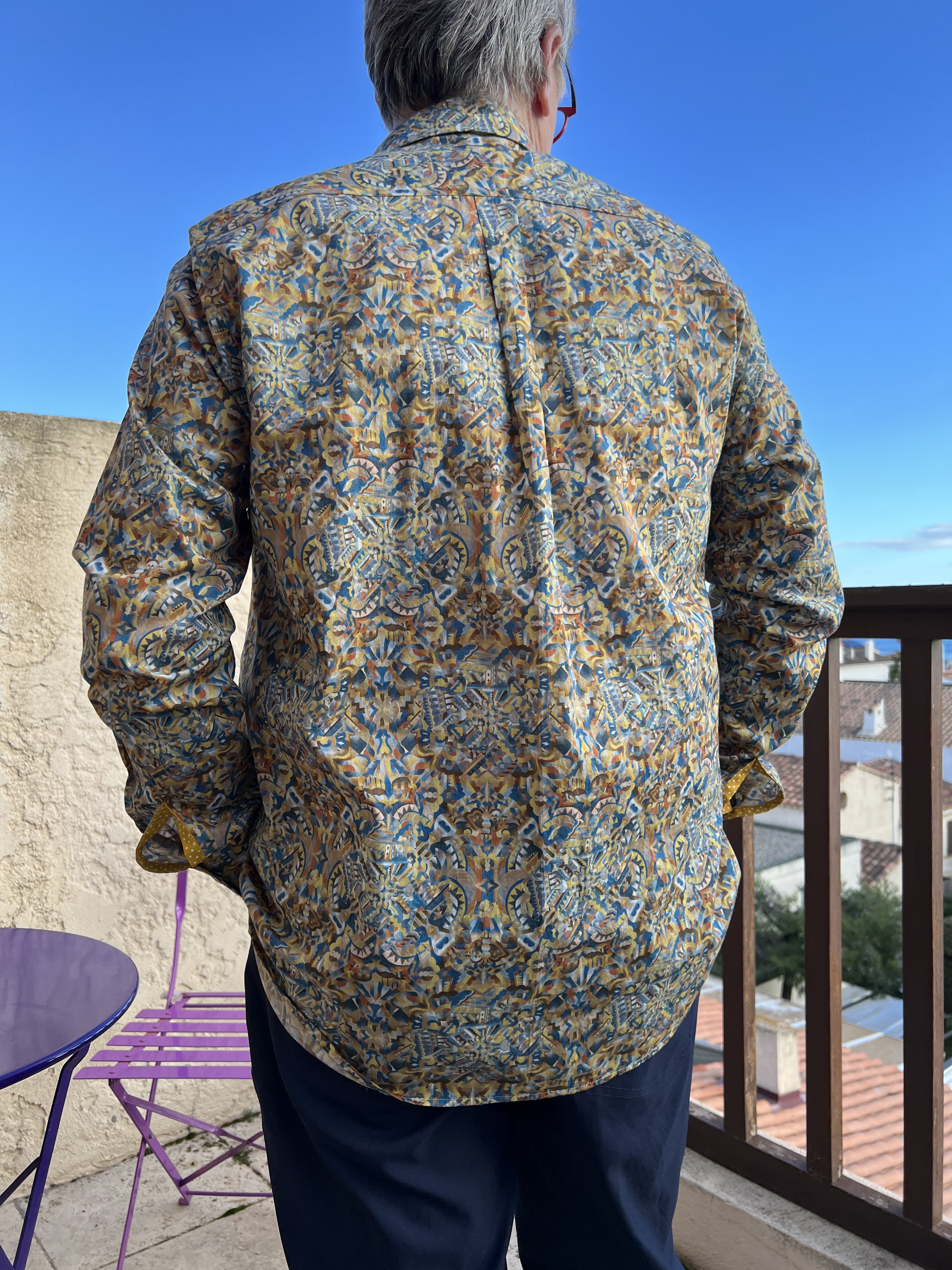 Nouvelle astuce que je vous rajoute! J’ai entoilé une des pièces d’empiècement dos et coupé l’autre, celle sur l’endroit, dans le biais afin de ne pas a avoir à faire coordonner les raccords qui sont minimes mais tout de même présents sur cet imprimé. D’ailleurs, au devant et à côté, ils sont tous bien alignés comme je les aime. La chemise, dans ce tissu si fin de popeline, a plus de tenue sur les épaules et se reflète ensuite sur le corps. Alain me confirme le confort de cette astuce.Bien fière de mon coup!